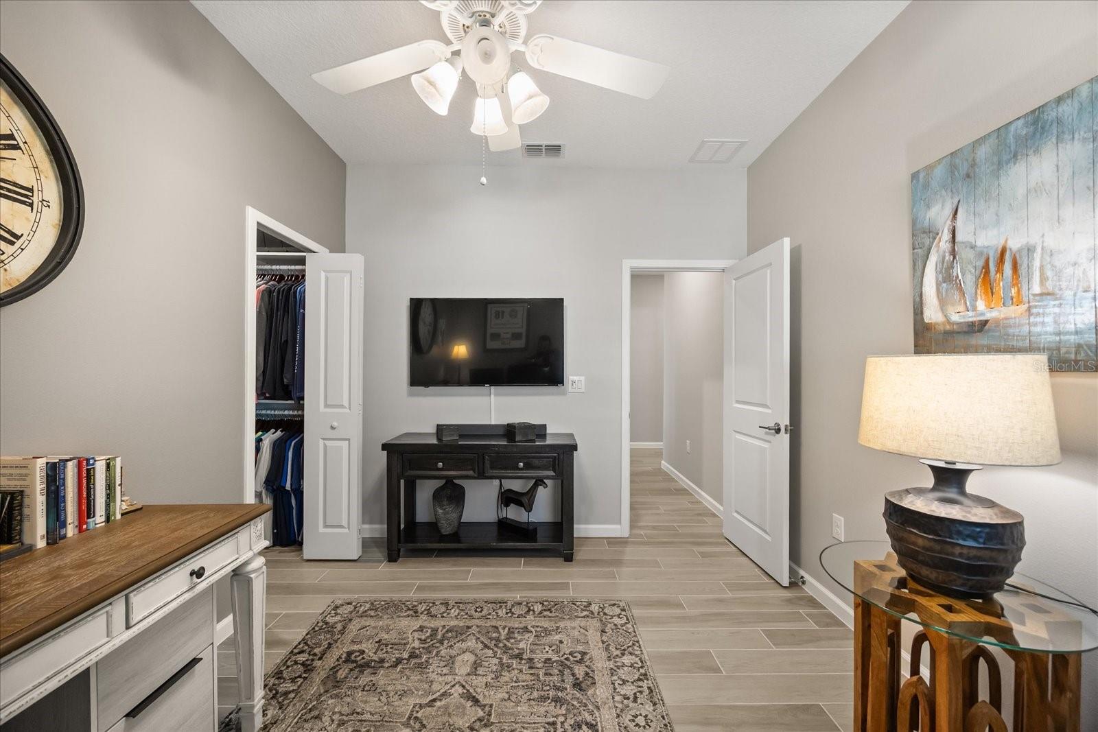 - Ceiling Fans(s), Crown Molding, Eat-in Kitchen, High Ceilings, Kitchen/Family Room Combo, Solid Wood Cabinets, Split Bedroom, Stone Counters, Thermostat, Tray Ceiling(s), Walk-In Closet(s), Window Treatments