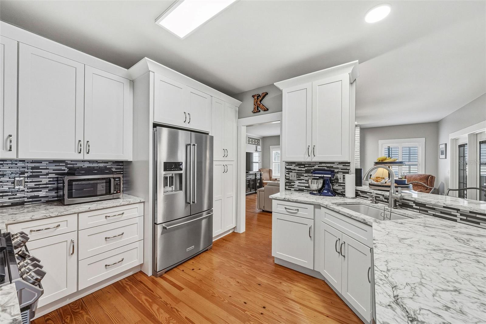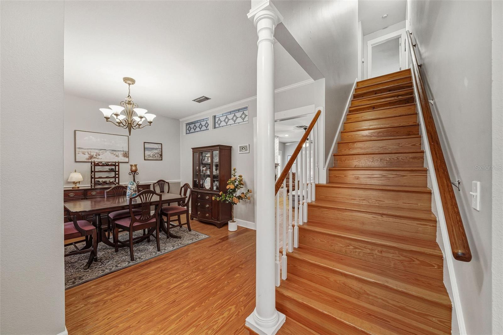 Modern conveniences with classic Victorian charm sets this 4 bed, 3 bath abode apart with over 2,400 sq ft. Located in the Orwin Manor neighborhood means just minutes to Park Ave shops and cafés and the unique and charming vibe of the Orlando Mills/50 area. Stepping up to the covered porch and through the leaded-glass front door, gleaming real hardwood floors greet you in the foyer and run throughout the entire first floor along with lovely louvered “estate shutters” on the windows. A formal dining room with its bay window and stain-glass wall inserts sets the tone for what’s to come and the first-floor guest bedroom and full bath is super convenient. Just past the staircase is the heart of the home; a large open family room with brick fireplace and wall of French doors leading to the covered/screened back porch. A recent full kitchen remodel will please the home chef with NEW wood cabinets and soft-close drawers, large built-in pantry with sliding shelf inserts, quartz countertops and breakfast bar, gas-stove-top with double oven range and pot filler, and all NEW stainless steel appliances. And right around the corner in another bay window is the kitchen dinette space and laundry closet (behind the sliding “barn doors”). The oversized attached 2 car garage is also just off the kitchen which is great for unloading those groceries from nearby Publix, FreshMarket or Trader Joes – all less than 1.5 miles away. Upstairs 2 bedrooms share the full hall bath with tub/shower combo; the spacious primary bedroom with large walk-in closet (6’x11’) and a “Juliet balcony” offers a spa-like ensuite with double sink vanity, recently refinished spa tub with gorgeous peacock stain glass window, separate shower/toilet room, and huge walk-in linen closet. Outback the NEW pool and deck surrounded by the grassy yard and NEW white vinyl fencing offers the perfect place to relax and unwind. Major UPDATES: NEW HVAC 2025, NEW electrical panel 2025, NEW metal roof and gutters 2022, and NEW total kitchen remodel 2020. Copper plumbing and high efficiency hybrid water heater round out the main mechanicals of this lovely home. Built in 1985, all these recent updates offers you the Victorian flair but living style of the 21st century.