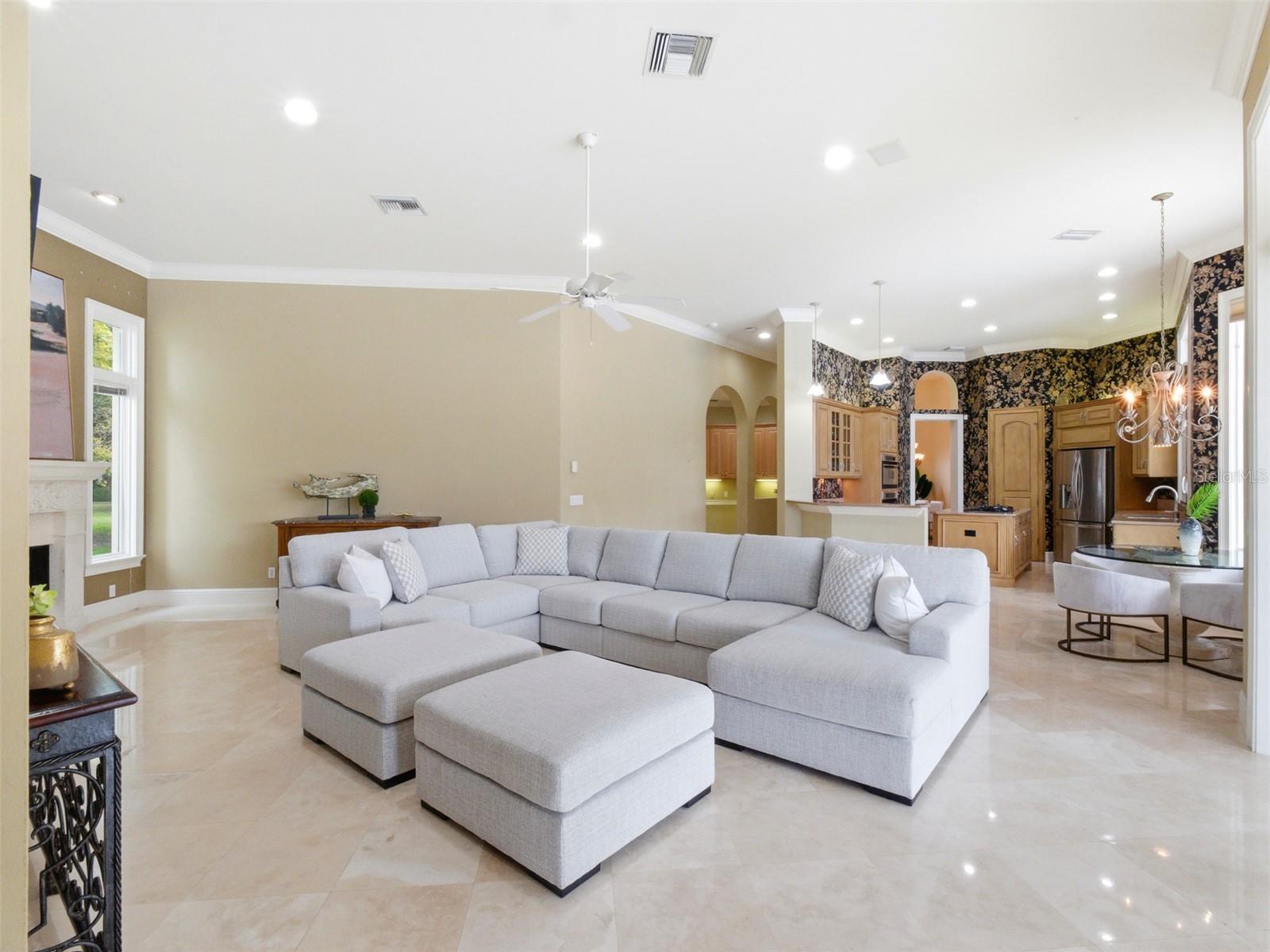 - Ceiling Fans(s), Crown Molding, Eat-in Kitchen, High Ceilings, Kitchen/Family Room Combo, Open Floorplan, Primary Bedroom Main Floor, Solid Wood Cabinets, Split Bedroom, Stone Counters, Tray Ceiling(s), Walk-In Closet(s)