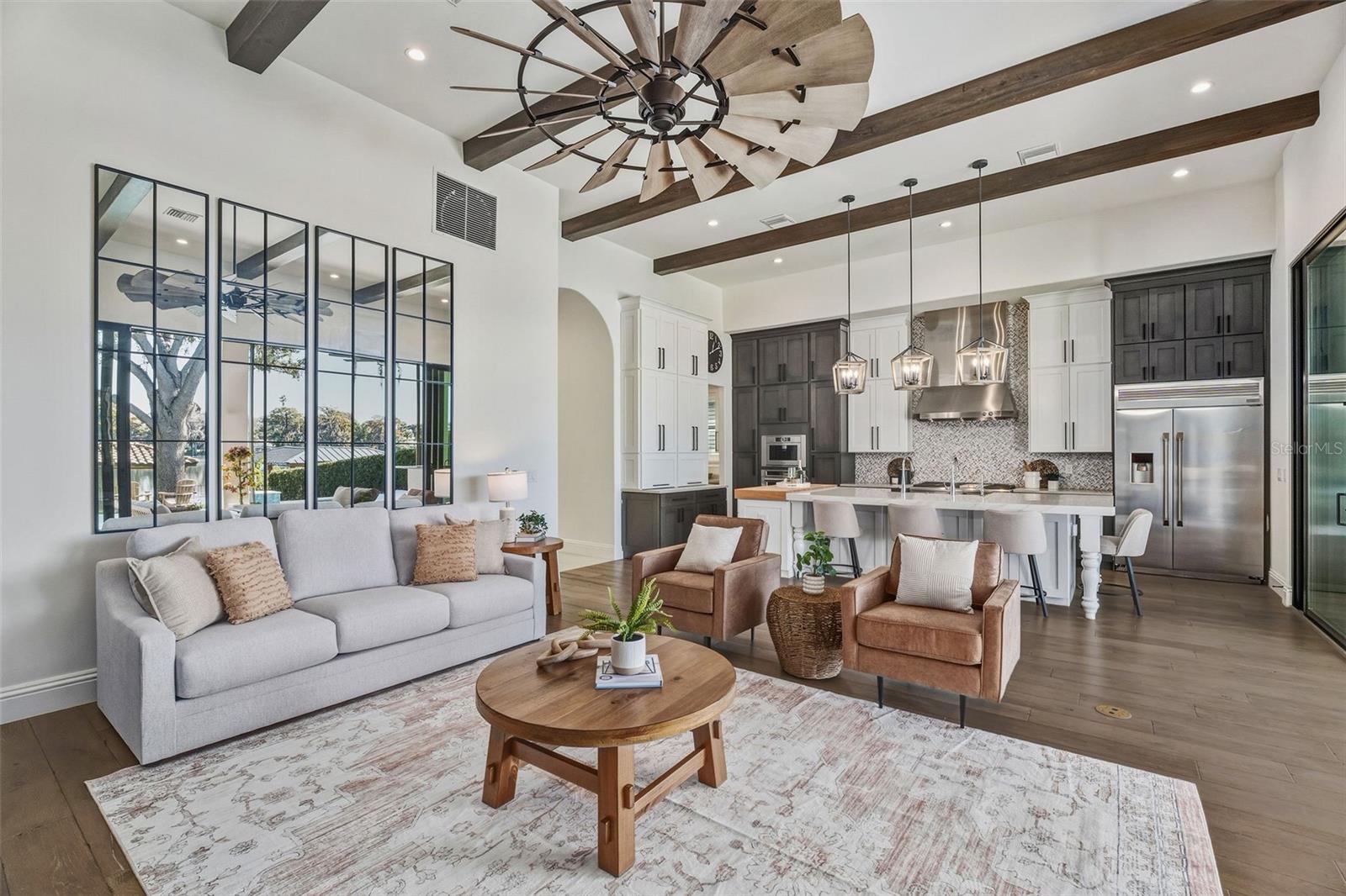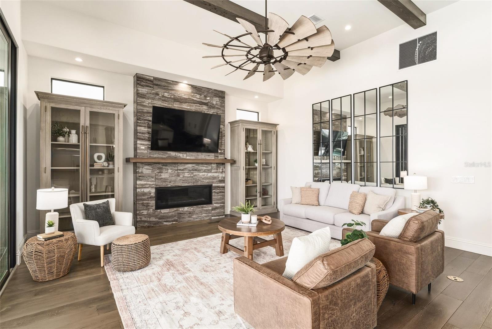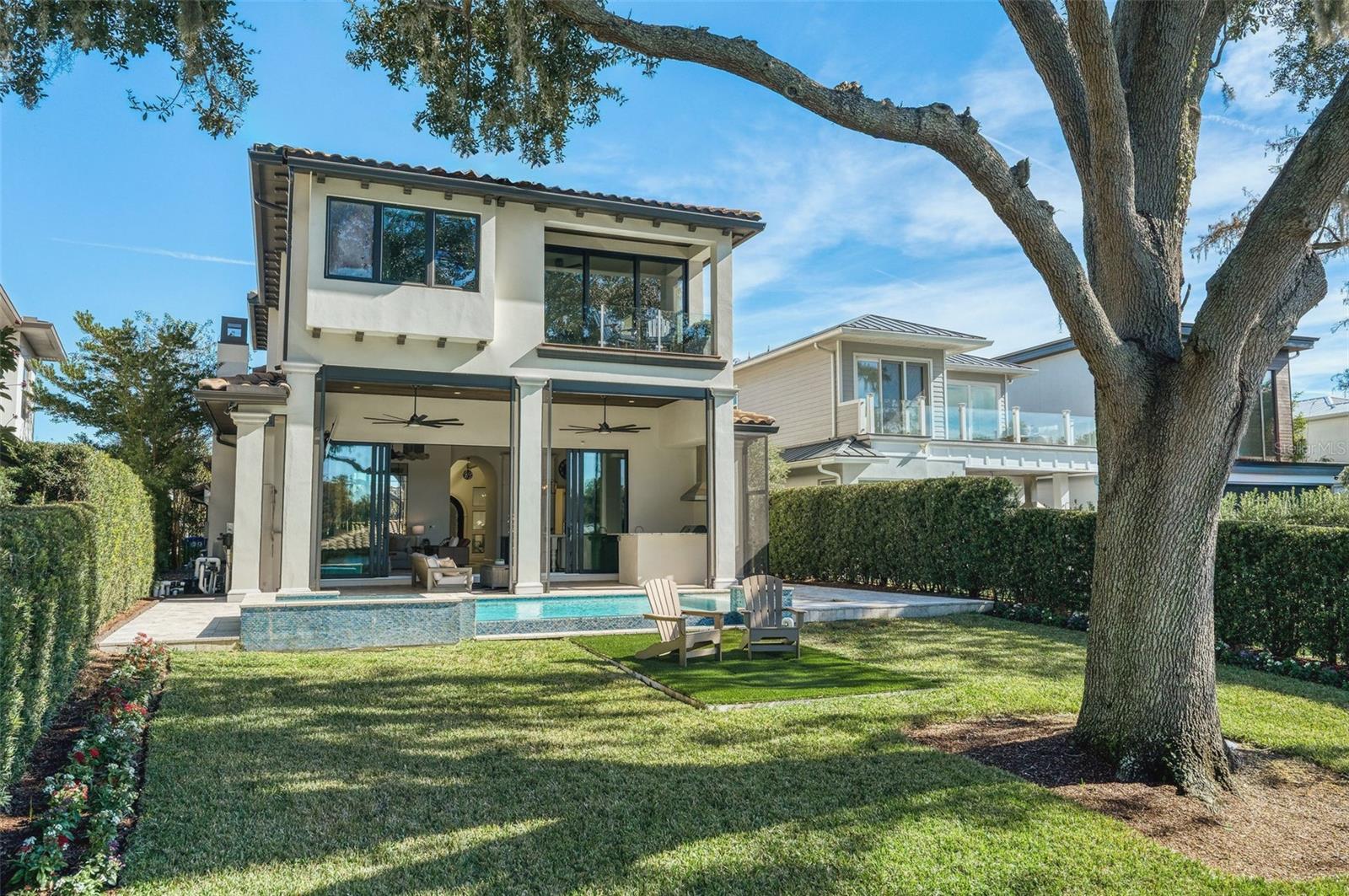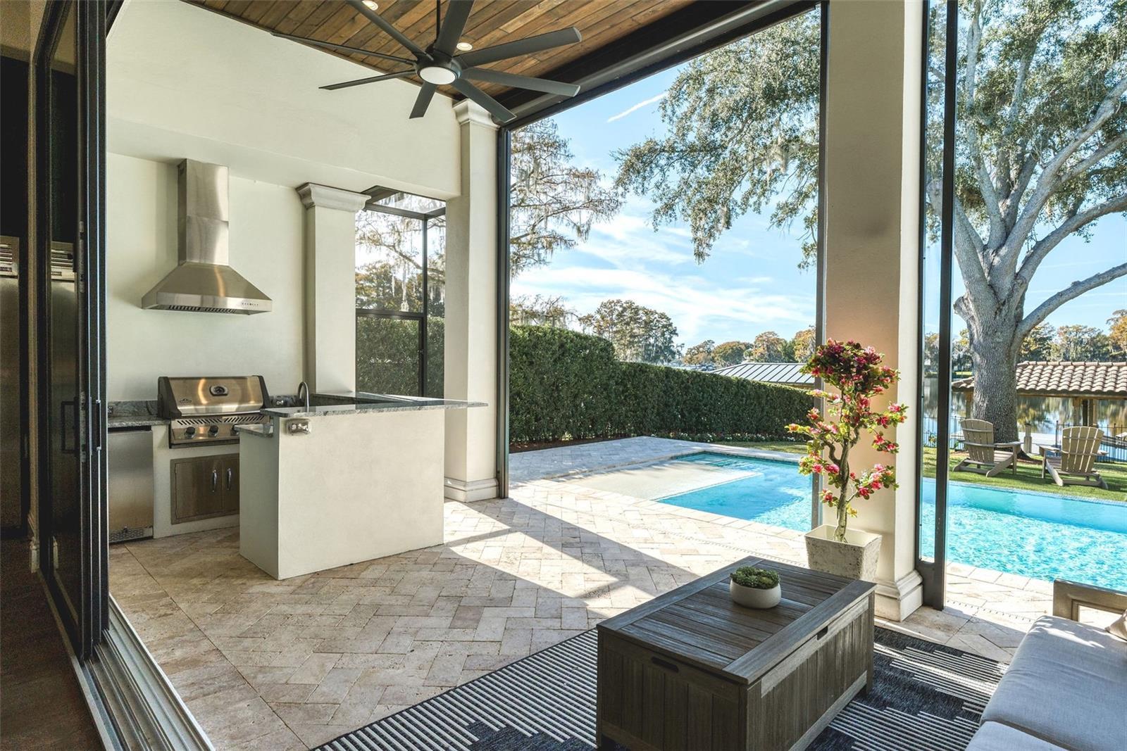 Under contract-accepting backup offers. Completed in 2020, this exceptional Winter Park lakefront estate blends refined architecture, thoughtful design, and effortless indoor-outdoor living on Lake Killarney. Beyond the gated courtyard-style entrance, the main residence offers 5 bedrooms, 4 full baths, and 2 half baths, complemented by a detached in-law studio ideal for guests, extended family, or a private home office, with a full bath, walk-in closet, and a dry bar with a mini refrigerator. Behind the home, the rear lawn stretches down to the lake where an oversized boat dock provides direct access to Lake Killarney for watersports or breathtaking sunset cruises. Enjoy a large deck, and an upgraded boat lift with 2 motors and a high-capacity cradle to accommodate a variety of boats. Throughout the home, a timeless neutral palette creates a warm and inviting space with modern elegance. An impressive open dining area greets you with soaring 2-story ceilings accented by exposed beams, and is adjoined to the kitchen by a well-appointed butler’s pantry for seamless hosting, complete with a dry bar and wine refrigerator, and a walk-in pantry. The kitchen is a true showpiece, with exceptional floor-to-ceiling cabinetry, 48” natural gas range with dual convection ovens, 2 dishwashers, and a built-in coffee/espresso machine. Anchoring the space, a large quartz-covered island offers 2 faucets plus a filtered water dispenser, and a butcher block prep space. The light-filled living room impresses with dramatic ceilings, a striking gas fireplace, and 10’ sliding glass doors that stack open to the covered lanai. A true extension of the home, the outdoor living experience is exceptional, featuring a summer kitchen, pool bath with an outdoor shower, and remote-controlled screens for year-round enjoyment. The resort-style pool and spa includes a sun shelf, all wrapped in travertine decking, overlooking the lake to provide a tranquil setting for relaxing with friends & family. Completing the main level is a private downstairs guest suite or home office, with a full bath and walk-in closet. Upstairs, the split-bedroom plan is separated by a versatile loft/bonus area with a dry bar and beverage fridge, ideal for a secondary living room, playroom, or study. Designed to embrace the home’s exceptional lakefront setting, the spacious primary retreat captures lake views through expansive glass doors, from the private balcony, and from the en-suite bath. The primary bath is luxurious, and thoughtfully designed to be a true sanctuary, with a freestanding soaking tub positioned to enjoy lake views, and a large glass-enclosed steam shower. Enjoy a very generous walk-in closet, with extensive built-ins and a center island that create a boutique-style dressing experience. The upper level also includes three additional bedrooms with wood floors, high ceilings, and easy access to 2 full bathrooms, plus a functional laundry room conveniently located off the bonus area. Perfectly positioned in Winter Park, with shopping, dining, and everyday conveniences just blocks away at the new and improved Winter Park Village, and the vibrant energy of the famed Park Avenue only minutes from your door, this lakefront home delivers the rare combination of newer construction and exceptional waterfront living—without compromise.