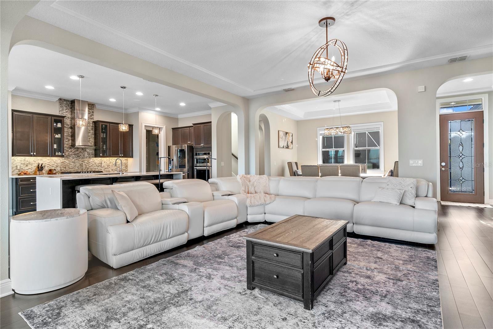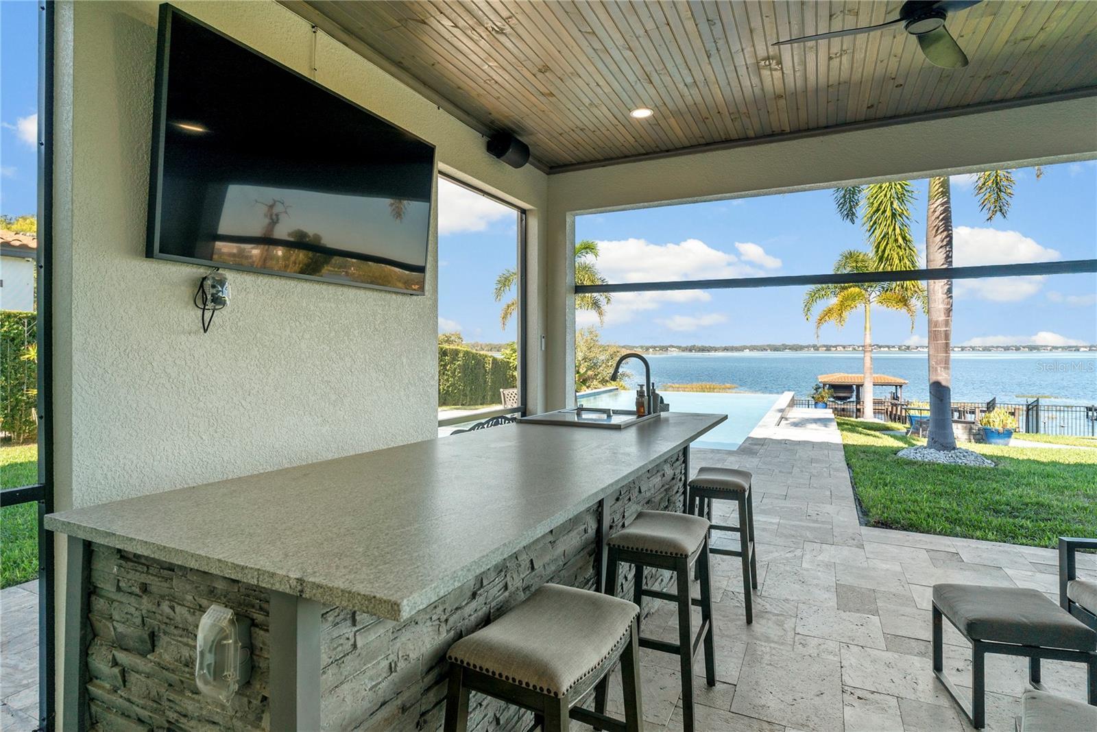 One or more photo(s) has been virtually staged. Get behind the gate of the highly sought-after Waterside community in Winter Garden. This extraordinary waterfront estate offers a rare blend of refined luxury, thoughtful design, and true lakefront living on Johns Lake. Built just six years ago and meticulously enhanced, this five-bedroom residence is primarily single-story, with the added flexibility of a private upstairs retreat featuring a spacious loft, full bedroom, and bathroom—ideal for guests, multi-generational living, or a quiet home office escape. From the moment you enter, the home makes a statement. Real, solid wood flooring flows throughout, adding warmth and authenticity that cannot be replicated with engineered alternatives. The expansive living areas were extended to create an open and inviting layout, perfectly suited for both everyday comfort and grand-scale entertaining. Dramatic waterfall-edge countertops anchor the kitchen and gathering spaces, blending modern elegance with timeless craftsmanship. The heart of the home extends seamlessly outdoors. An expansive, screened-in lanai overlooks the water, creating a true indoor-outdoor lifestyle. The electric, automatic screening system allows you to adjust the space effortlessly, making it enjoyable year-round. The outdoor kitchen is exceptional, designed for serious cooking and entertaining. It includes a Coyote gas grill, a Recteq pellet grill, a power burner, two outdoor refrigerators, a full-size sink, and a dedicated television—everything needed to host unforgettable evenings with friends and family. Beyond the lanai, the backyard opens to a large, fenced lawn that gently leads to your private dock on Johns Lake. The dock is fully equipped with a boat lift, as well as water and electricity, making lake access effortless and spontaneous. Whether you enjoy boating, fishing, or sunset cruises, this setting delivers the ultimate waterfront lifestyle. The saltwater infinity-edge pool is a showpiece, stretching an impressive 50 feet and designed to visually merge with the lake beyond. Heated by gas, the pool is ideal for both leisurely afternoons and evening swims, offering breathtaking views and a true resort-style experience in your own backyard. Inside, the home continues to impress with high-end features that elevate daily living. A tankless water heater ensures endless hot water, while a central vacuum system adds convenience and ease. The floor plan is both functional and elegant, offering five generously sized bedrooms and well-appointed bathrooms, all thoughtfully positioned to maximize privacy and flow. The property is further enhanced by lush landscaping and an abundance of fruit-bearing trees, including bananas, cherries, kumquats, and papayas, along with a beautifully maintained rose garden. These natural charms create a garden-like atmosphere that complements the lakefront setting. Located in gated Waterside, one of Winter Garden’s most desirable communities, this home offers privacy, exclusivity, and direct access to one of Central Florida’s most beautiful lakes, while remaining close to top-rated schools, dining, shopping, and major roadways. This is more than a house—it is a lifestyle defined by water, space, craftsmanship, and unforgettable outdoor living. Opportunities like this on Johns Lake are rare, and this residence stands apart in both design and execution.