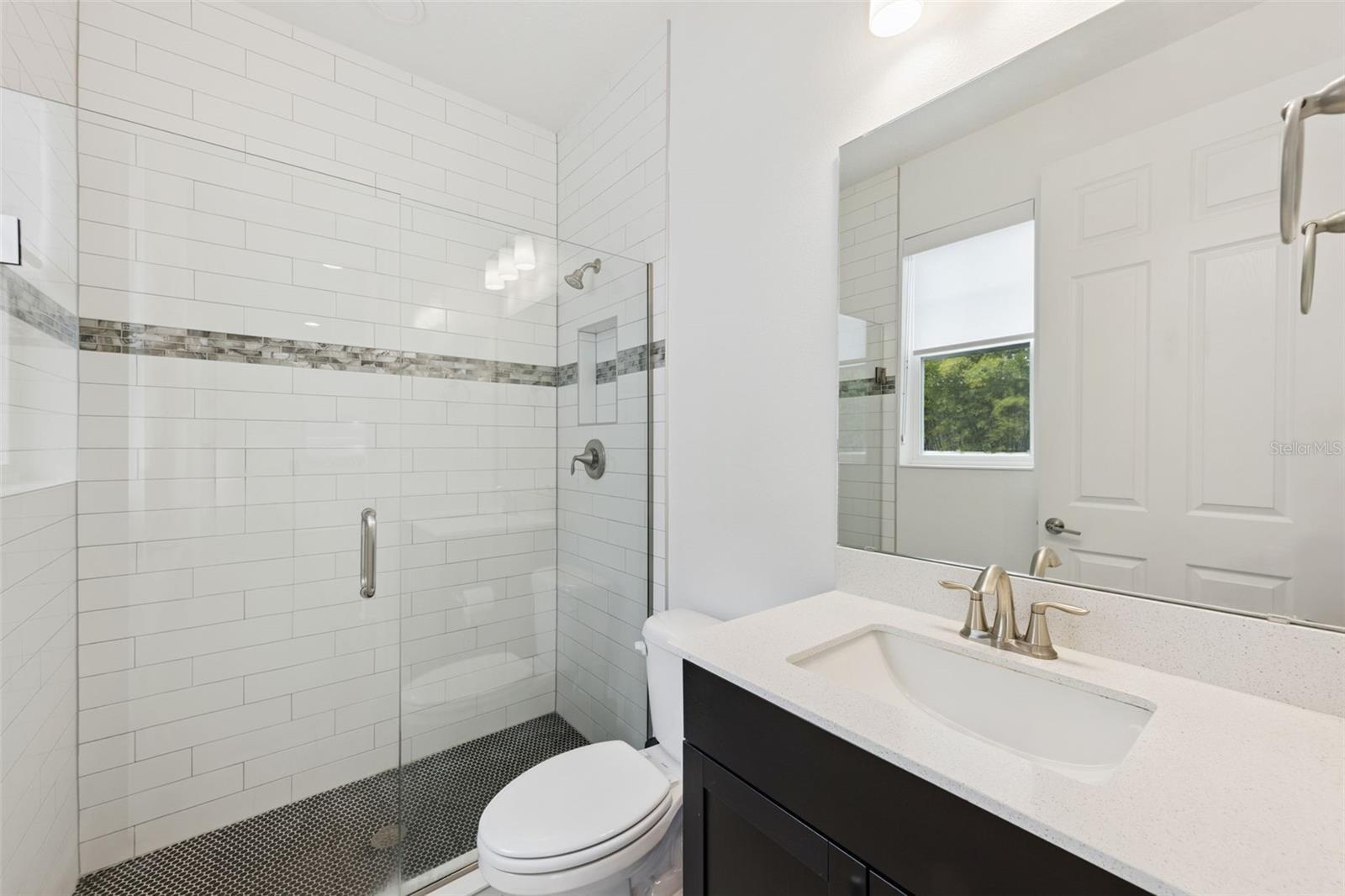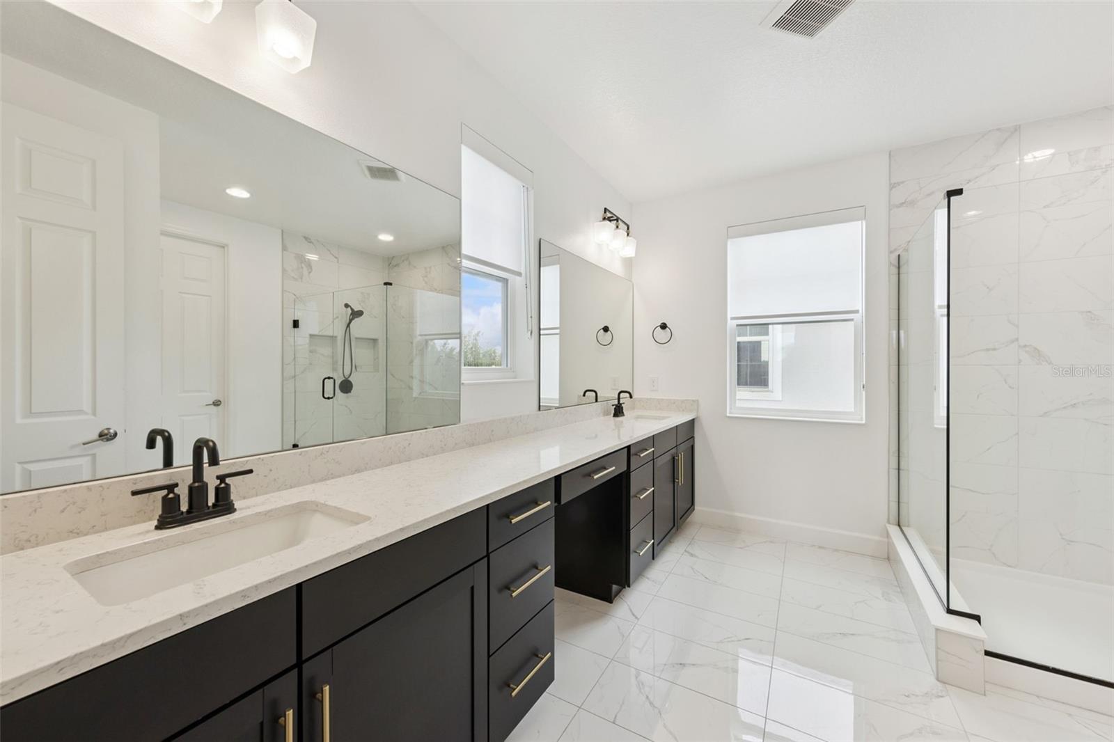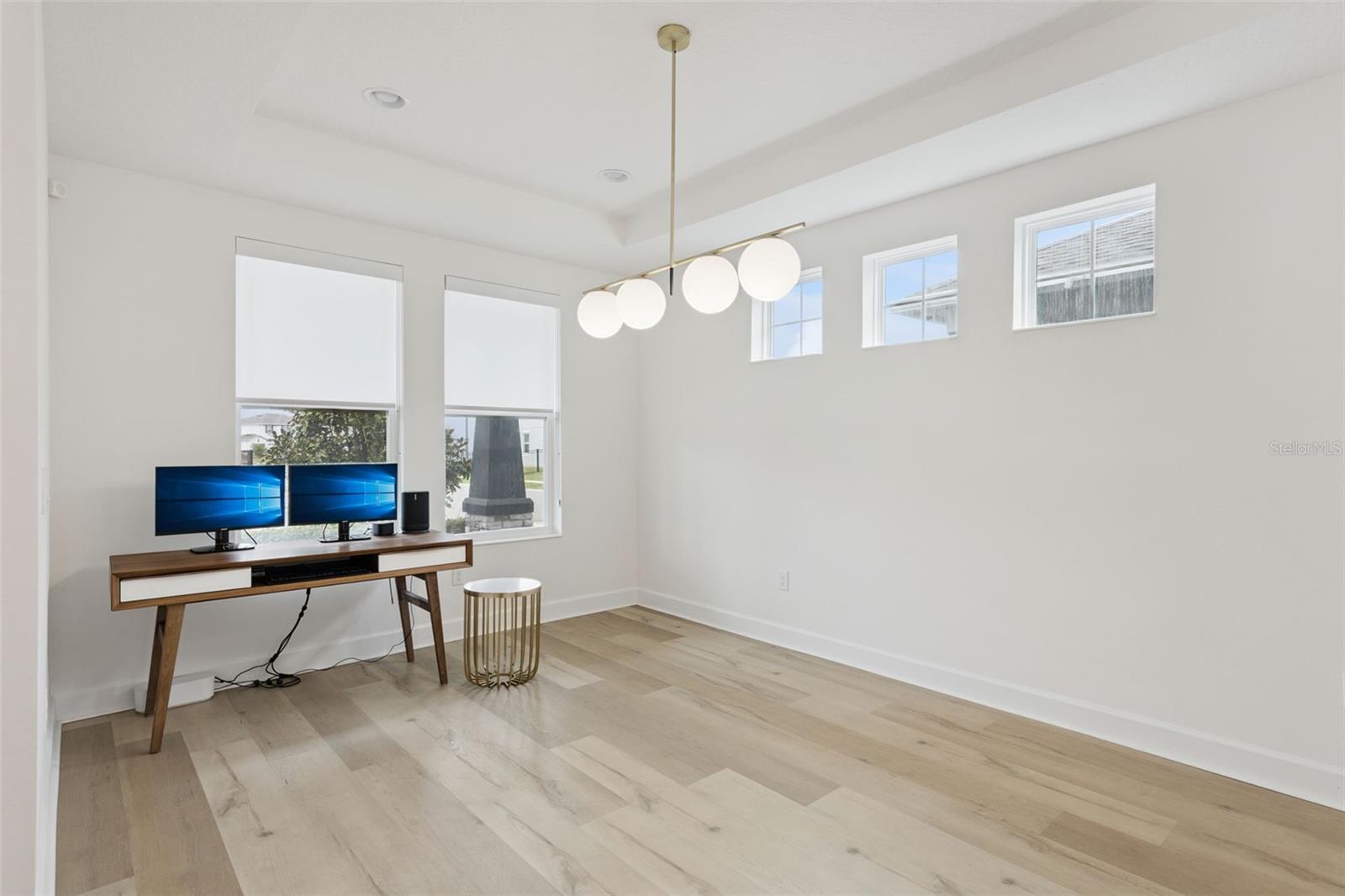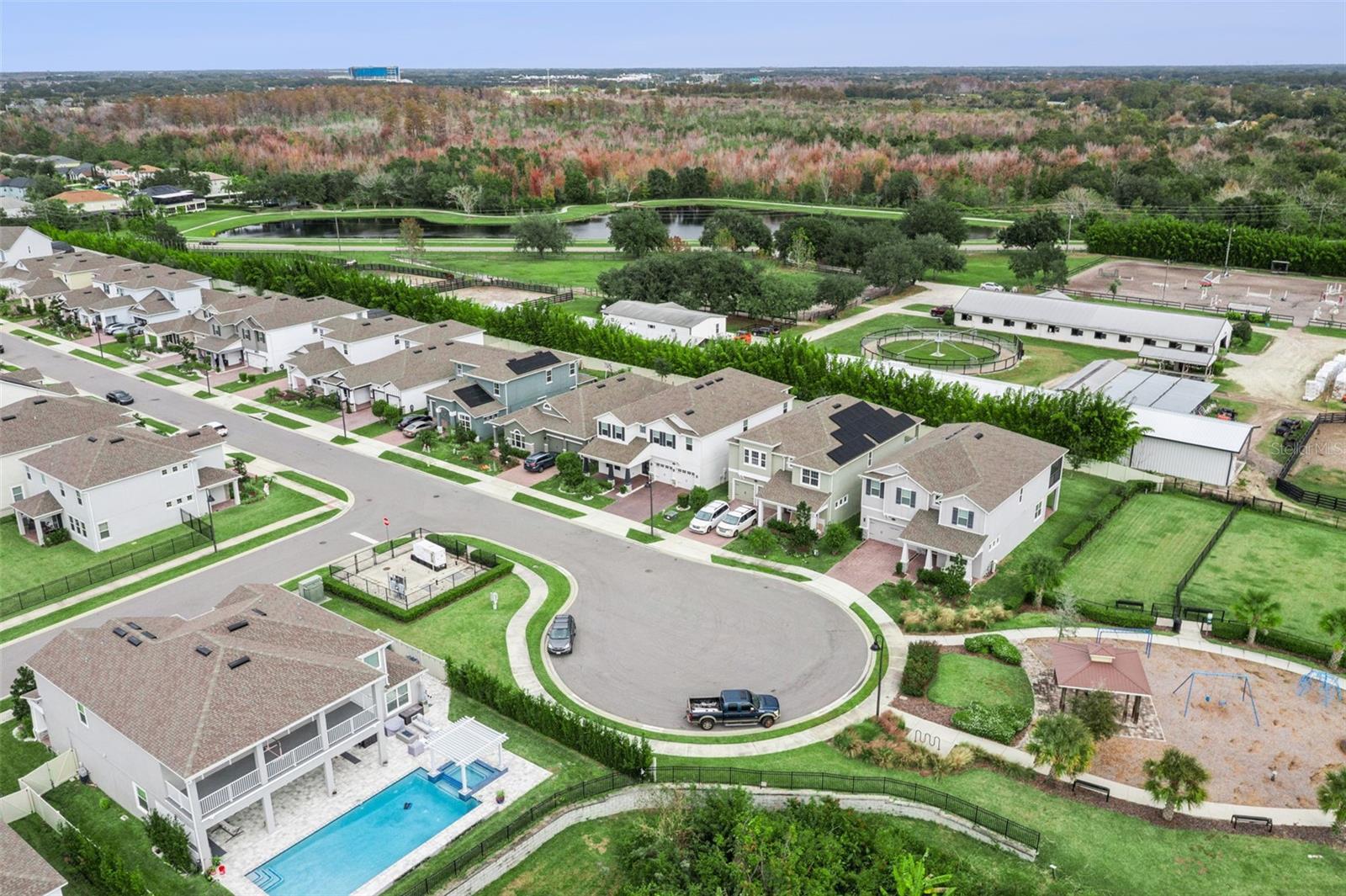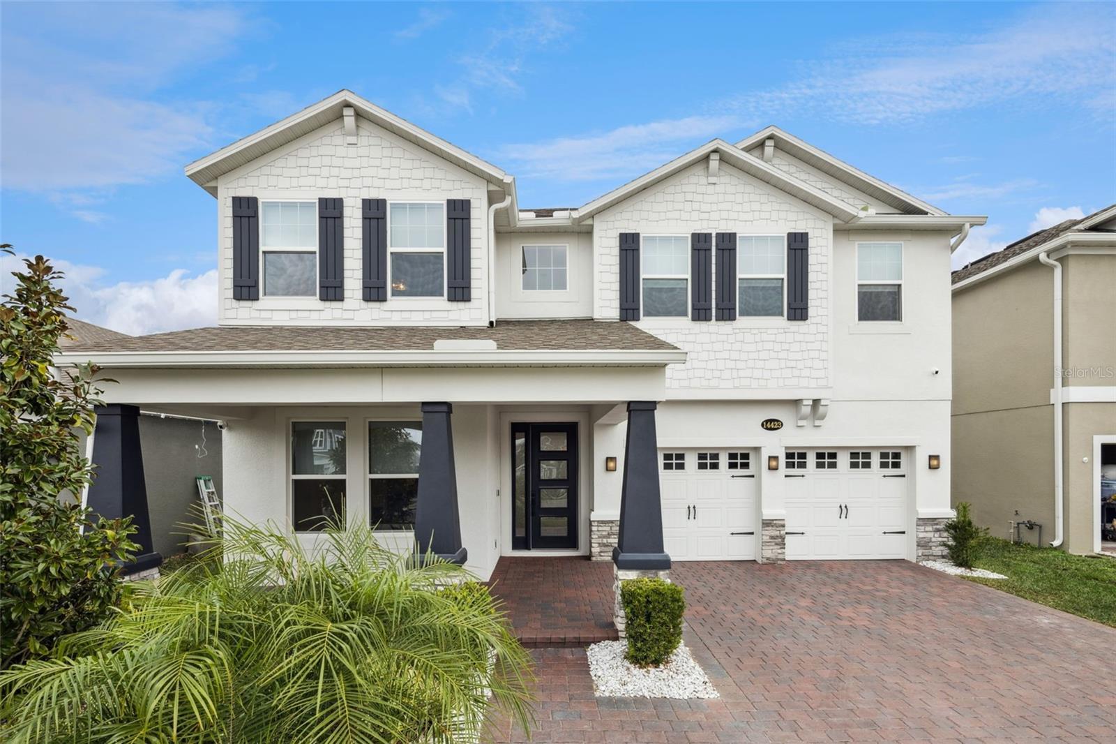 Welcome home to this stunning two-story residence in the gated community of Tilden Place, ideally located in the heart of Winter Garden. Just minutes from Winter Garden Village with its abundant shopping, dining, fast-casual options, hospital access, and everyday conveniences—and only a short drive to Walt Disney World Resort, this home offers the perfect blend of luxury, comfort, and location. Built by MI Homes, known for exceptional energy efficiency, this 5-bedroom, 4-bath home showcases sleek, modern upgrades throughout. The pavered driveway and porch set the tone, opening to a thoughtfully designed floor plan that includes a first-floor bedroom with a full bathroom, ideal for guests, multigenerational living, or a private home office. The main living areas feature LVP flooring, striking iron stair railings, and incredible custom trim work along the staircase. The gourmet kitchen will keep even the pickiest of chefs happy, featuring dark cabinetry that beautifully contrasts with a bright white waterfall island, pendant lighting, stainless steel appliances, gas cooking, and stunning upper cabinetry that elevates the space. A built-in pocket office offers the perfect spot for quick correspondence, bill pay, remote work, or a homework station. The family room is anchored by a dramatic wall of custom built-in shelving with accent lighting and a fireplace, creating a warm and inviting focal point for everyday living and entertaining. Upstairs, a spacious loft continues the custom design theme with floating shelves and integrated storage. The expansive upstairs primary suite features LVP flooring, generous space, and access to a private balcony, perfect for morning coffee or evening relaxation. With no rear neighbors, enjoy a private backyard retreat complete with an extended lanai, while the coastal-style balcony off the loft provides even more opportunities for entertaining and unwinding. The intimate gated community is centered around a beautiful pond with a fountain, and just a short walk down the street brings you to the community green space and playground. This stunning home truly offers modern luxury, functional living, privacy, and an unbeatable Winter Garden location. WELCOME HOME!