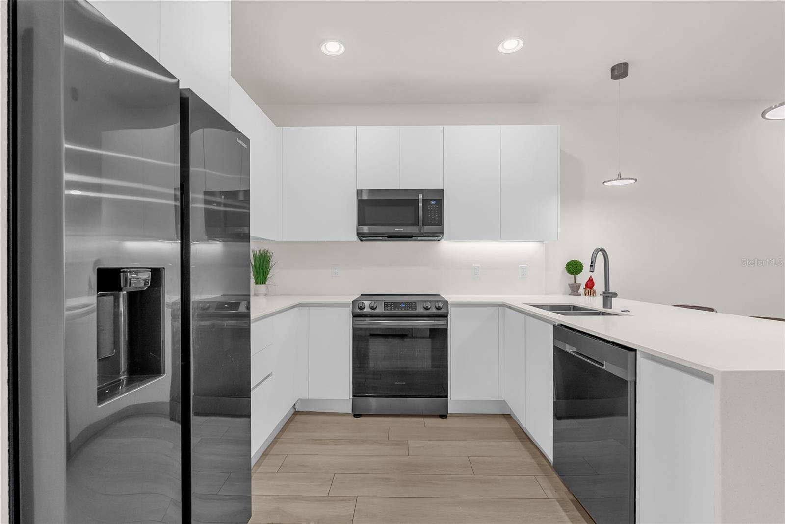 Discover luxury townhome living just 8 miles from Disney! Located in an intimate, upscale community, this fully furnished, turn-key residence offers the flexibility to live full-time or generate income as a short-term rental investment. This stunning 3-bedroom, 3-bath townhome showcases modern sophistication throughout, featuring an open-concept layout, designer finishes, and thoughtful upgrades at every turn. The light-filled main level boasts durable faux wood tile flooring, a wall of sliding glass doors, and a chef-inspired kitchen complete with a waterfall quartz island, matching backsplash, sleek cabinetry with under-cabinet lighting, and stainless steel appliances. A first-floor bedroom and full bath provide ideal accommodations for guests, multigenerational living, or a home office. Upstairs, enjoy a flexible loft space, a secondary bedroom, and an expansive primary suite—your private retreat featuring a walk-in closet and a spa-like en-suite bath with floating vanity, illuminated mirrors, and a large walk-in shower. Step outside to the screened-in lanai and unwind in your private heated swim spa, perfect for relaxing after a day at the parks or enjoying a quiet day at home. Surrounded by natural beauty, this community offers an affordable HOA and convenient access to world-class theme parks, golf courses, shopping, dining, and entertainment. Luxury, location, and lifestyle—this one checks every box.