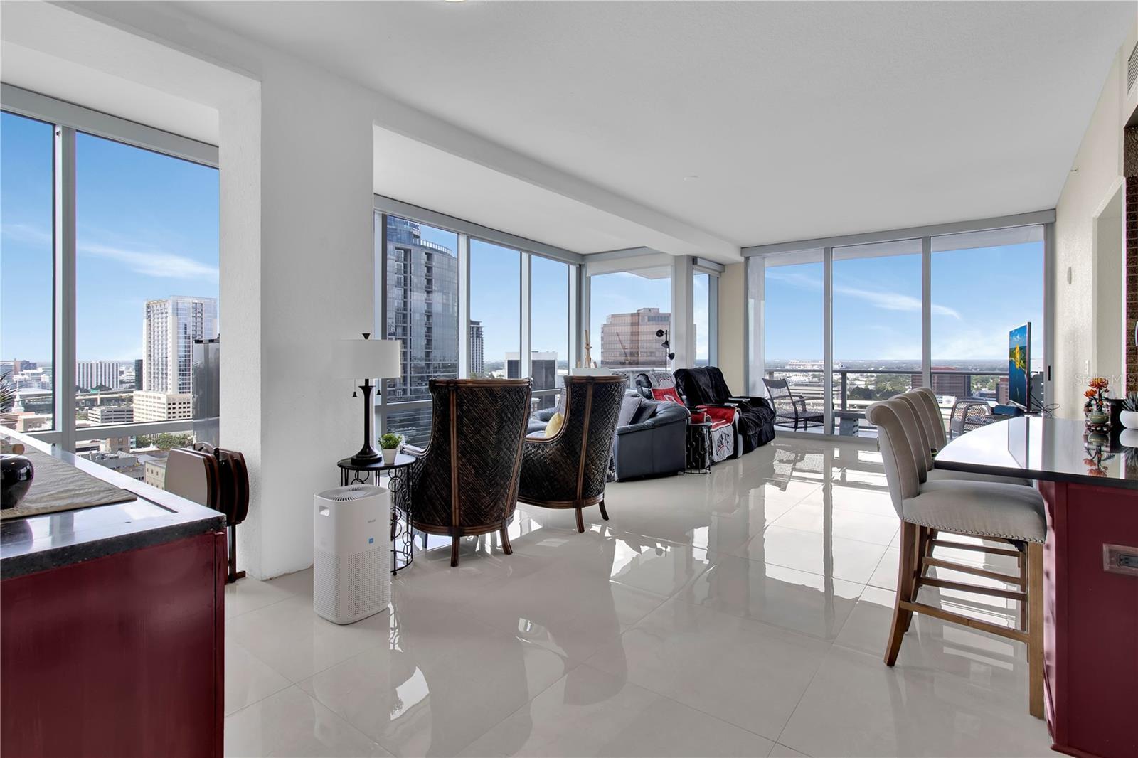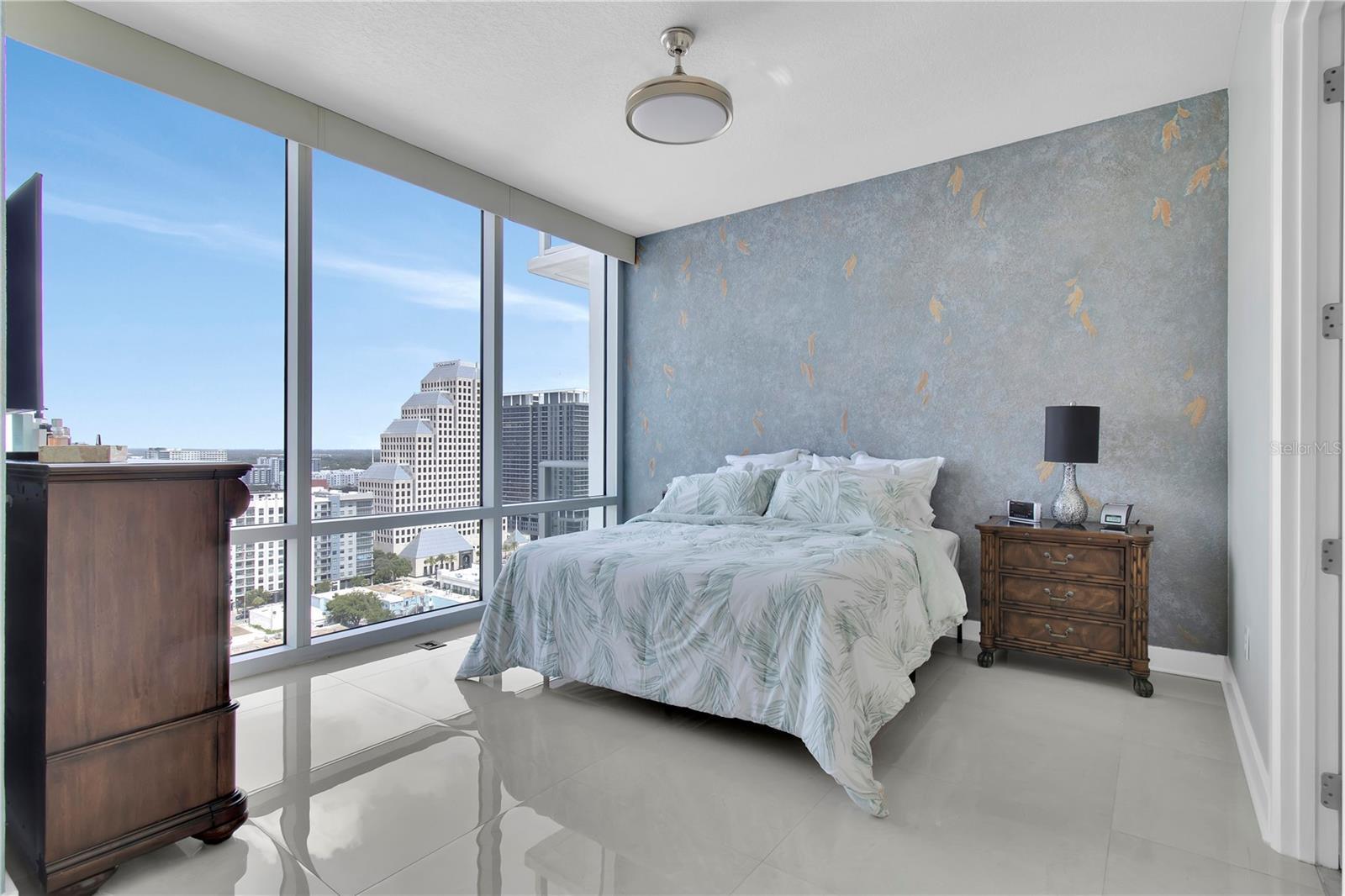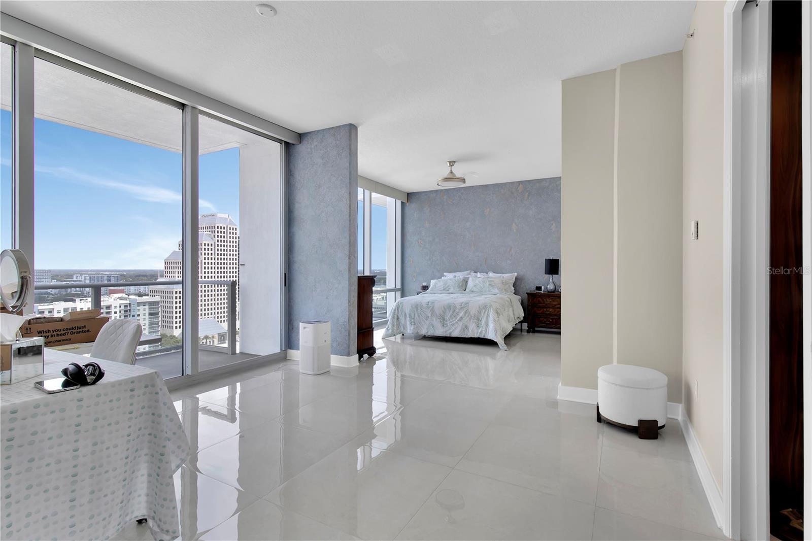 DOWNTOWN HIGH RISE CORNER UNIT, The VUE At Lake Eola. This 3 bed / 3 bath is the LARGEST 3 bed FLOOR PLAN, at 2,156 SQ FT. The unit comes with TWO, SIDE by SIDE parking spots in the garage. The extra square footage of this floor plan transforms the standard master bedroom, into an EXECUTIVES MASTER SUITE - adding a 2nd living room in the bedroom. The floor plan significantly enhances the closet layout one expects of an executive suite - a deep L-shaped, walk through space, planned specifically for luxury built-ins and lighting. NEW, glossy cream ceramic tile (24x24) throughout the unit. NEW, motorized shades in living, office/2nd bedroom and master. Kitchen, high end appliances include; SUB ZERO fridge, THERMADOR oven / gas range / dishwasher. Floor-To-Ceiling Glass wraps around every living area, with Hurricane Proof windows and balcony doors. Located on 20th floor - this is the perfect level in the building; High Up, yet still able to ACTUALLY SEE LAKE EOLA - without leaving your seat. HVAC includes TWO, commercial grade systems, inside a large walk-in laundry room with additional storage. The VUE amenities have no rivals; junior size Olympic swimming (lap) pool, a 3,000 SQ FT gym, basketball/tennis court, and a home theater room and catering kitchen inside the club room. Security is paramount at The VUE. 24/7 Security Guards in attendance (Marksman Security) at the front desk. Locked glass doors - leading to Resident Elevator Lobby - provide an extra level of security. BIOMETRIC FINGERPRINT ACCESS is located at every exterior entrance. The VUE is the only building downtown to provide VALET PARKING (inside the secured garage).