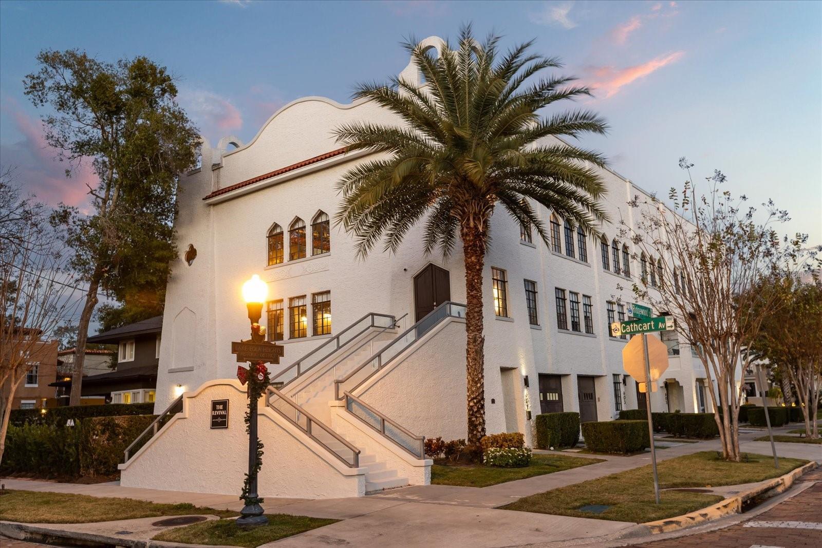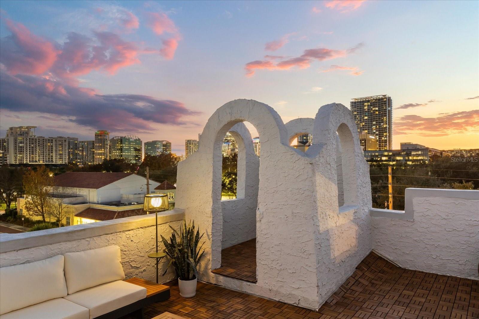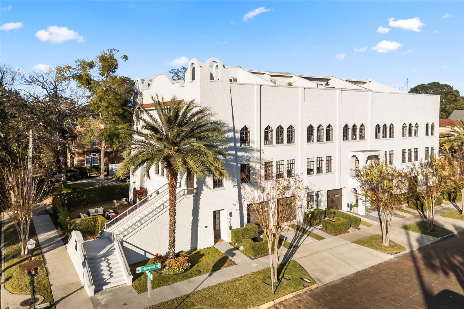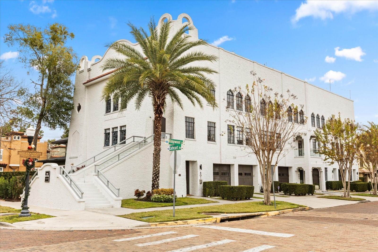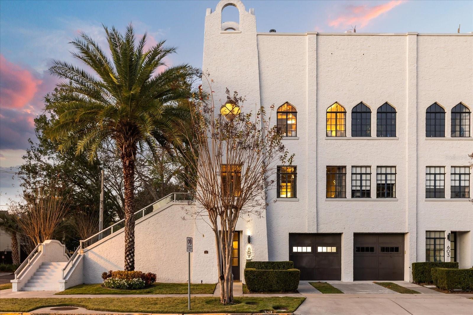 Just one block from Lake Eola Park in the heart of Downtown Orlando, this one-of-a-kind residence offers the rare opportunity to own a true piece of the city’s history. Originally built as a mission-style church in 1928, the building has been thoughtfully reimagined into a limited collection of five architecturally distinct townhomes known as The Revival. This end-unit home stands apart, with a dramatic exterior staircase leading to the original church doors, serving as a striking architectural reminder of the building’s past. Blending historic character with contemporary design in a way that feels both intentional and timeless. A private elevator connects all 4 levels of the residence, setting the tone for how seamlessly and thoughtfully the home lives from the moment you arrive. Original architectural elements—exposed brick, soaring cathedral ceilings, warm wood beams, and antique pointed steel-cased windows—tell the story of the building’s past, while designer finishes, curated lighting, and modern upgrades elevate the space for today’s lifestyle. The result is layered, refined, and unlike anything else in Downtown Orlando. The first level welcomes you with a charming entry and mudroom, along with direct access to a private backyard patio. This level also includes a flexible bedroom suite, ideal for guests or a private office, complete with its own en-suite bath and separate entrance. On the second floor, two additional en-suite bedrooms provide comfort and privacy, including a spacious primary suite featuring a beautifully appointed bath, generous counter space, and a walk-in closet with custom built-ins. The third floor anchors the home with an open-concept kitchen, featuring a substantial island with breakfast bar, seamlessly blending into the dining and living areas for effortless entertaining. A dramatic spiral staircase leads to a lofted overlook, perfect for a home office or second living area, with stairs up to a wet bar with access to the rooftop terrace, where panoramic Downtown Orlando skyline views create a truly unforgettable backdrop. From morning light streaming through historic windows to evenings spent watching Lake Eola’s fireworks from above the city, this is a home meant to be experienced—not just seen. Unforgettable sunsets, glowing city lights, and seasonal celebrations become part of everyday life here. Additional features include a large laundry room with ample storage, and a tandem two-car garage. This residence offers walkable access to dining, shopping, entertainment and cultural destinations—while delivering a living experience that is truly rare. This is not simply a home, but a thoughtfully reimagined piece of Orlando history. Come experience it for yourself. You won’t be disappointed!