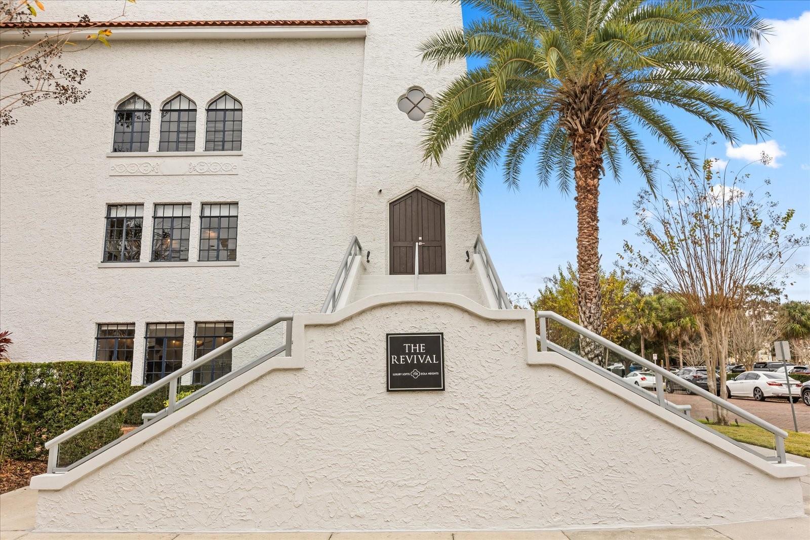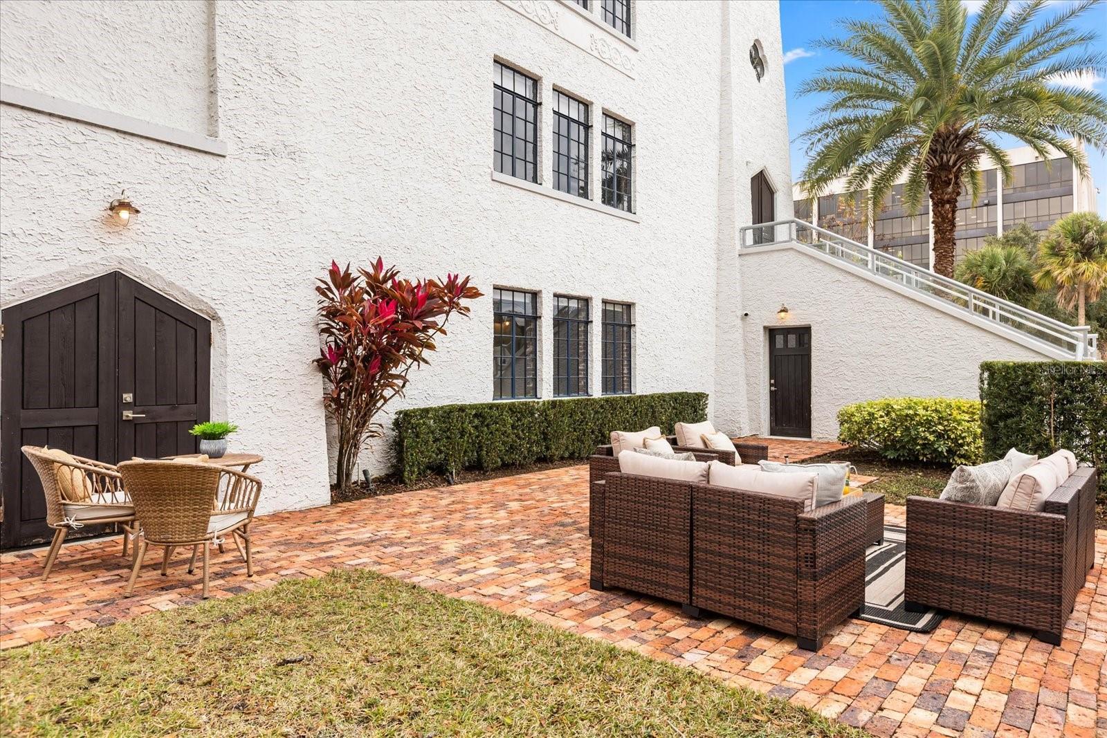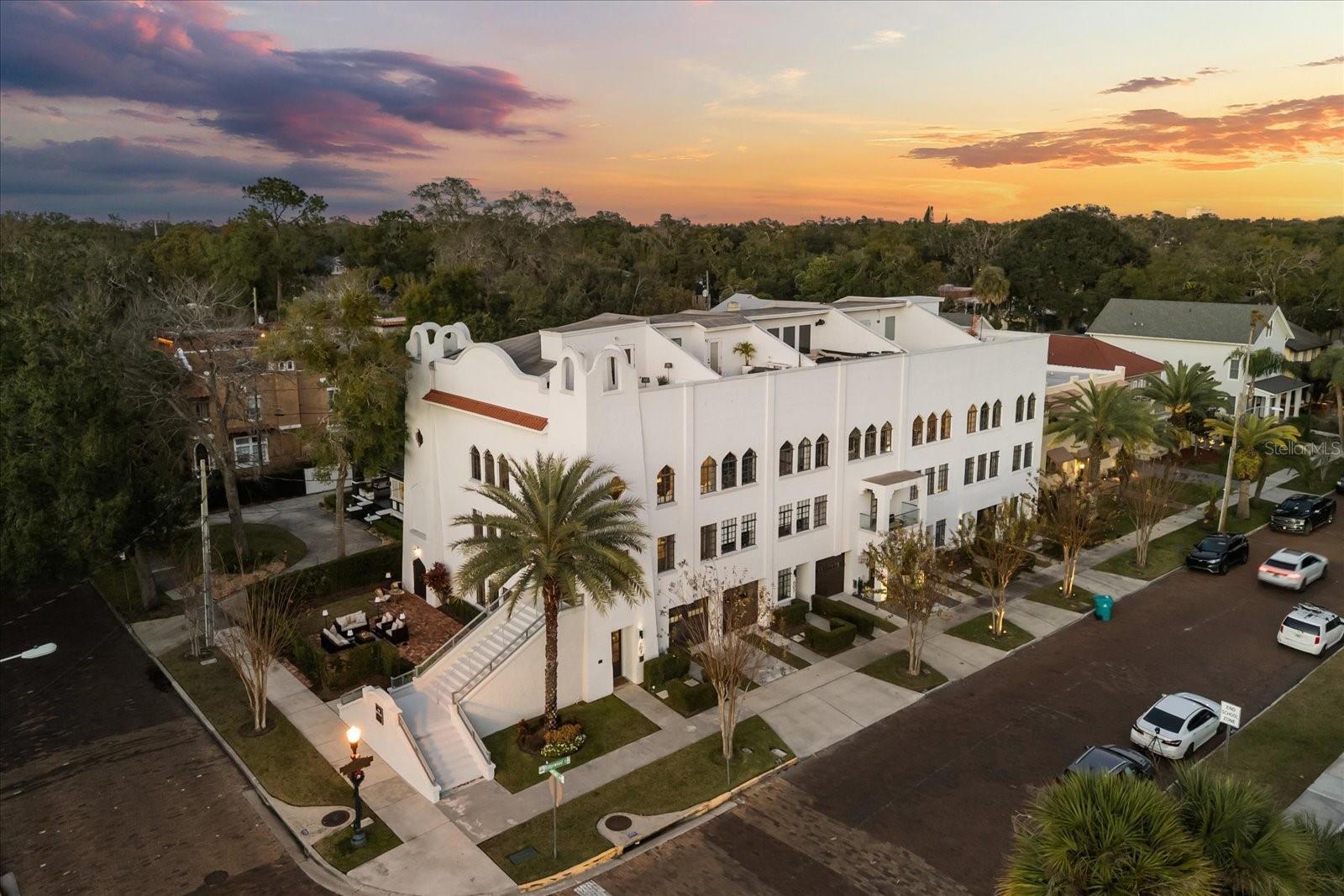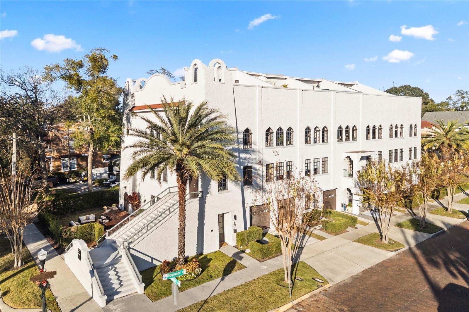 Just one block from Lake Eola Park in the heart of Downtown Orlando, this one-of-a-kind residence offers the rare opportunity to own a true piece of the city’s history. Originally built as a mission-style church in 1928, the building has been thoughtfully reimagined into a limited collection of five architecturally distinct townhomes known as The Revival. This end-unit home stands apart, with a dramatic exterior staircase leading to the original church doors, serving as a striking architectural reminder of the building’s past. Blending historic character with contemporary design in a way that feels both intentional and timeless. A private elevator connects all 4 levels of the residence, setting the tone for how seamlessly and thoughtfully the home lives from the moment you arrive. Original architectural elements—exposed brick, soaring cathedral ceilings, warm wood beams, and antique pointed steel-cased windows—tell the story of the building’s past, while designer finishes, curated lighting, and modern upgrades elevate the space for today’s lifestyle. The result is layered, refined, and unlike anything else in Downtown Orlando. The first level welcomes you with a charming entry and mudroom, along with direct access to a private backyard patio. This level also includes a flexible bedroom suite, ideal for guests or a private office, complete with its own en-suite bath and separate entrance. On the second floor, two additional en-suite bedrooms provide comfort and privacy, including a spacious primary suite featuring a beautifully appointed bath, generous counter space, and a walk-in closet with custom built-ins. The third floor anchors the home with an open-concept kitchen, featuring a substantial island with breakfast bar, seamlessly blending into the dining and living areas for effortless entertaining. A dramatic spiral staircase leads to a lofted overlook, perfect for a home office or second living area, with stairs up to a wet bar with access to the rooftop terrace, where panoramic Downtown Orlando skyline views create a truly unforgettable backdrop. From morning light streaming through historic windows to evenings spent watching Lake Eola’s fireworks from above the city, this is a home meant to be experienced—not just seen. Unforgettable sunsets, glowing city lights, and seasonal celebrations become part of everyday life here. Additional features include a large laundry room with ample storage, and a tandem two-car garage. This residence offers walkable access to dining, shopping, entertainment and cultural destinations—while delivering a living experience that is truly rare. This is not simply a home, but a thoughtfully reimagined piece of Orlando history. Come experience it for yourself. You won’t be disappointed!