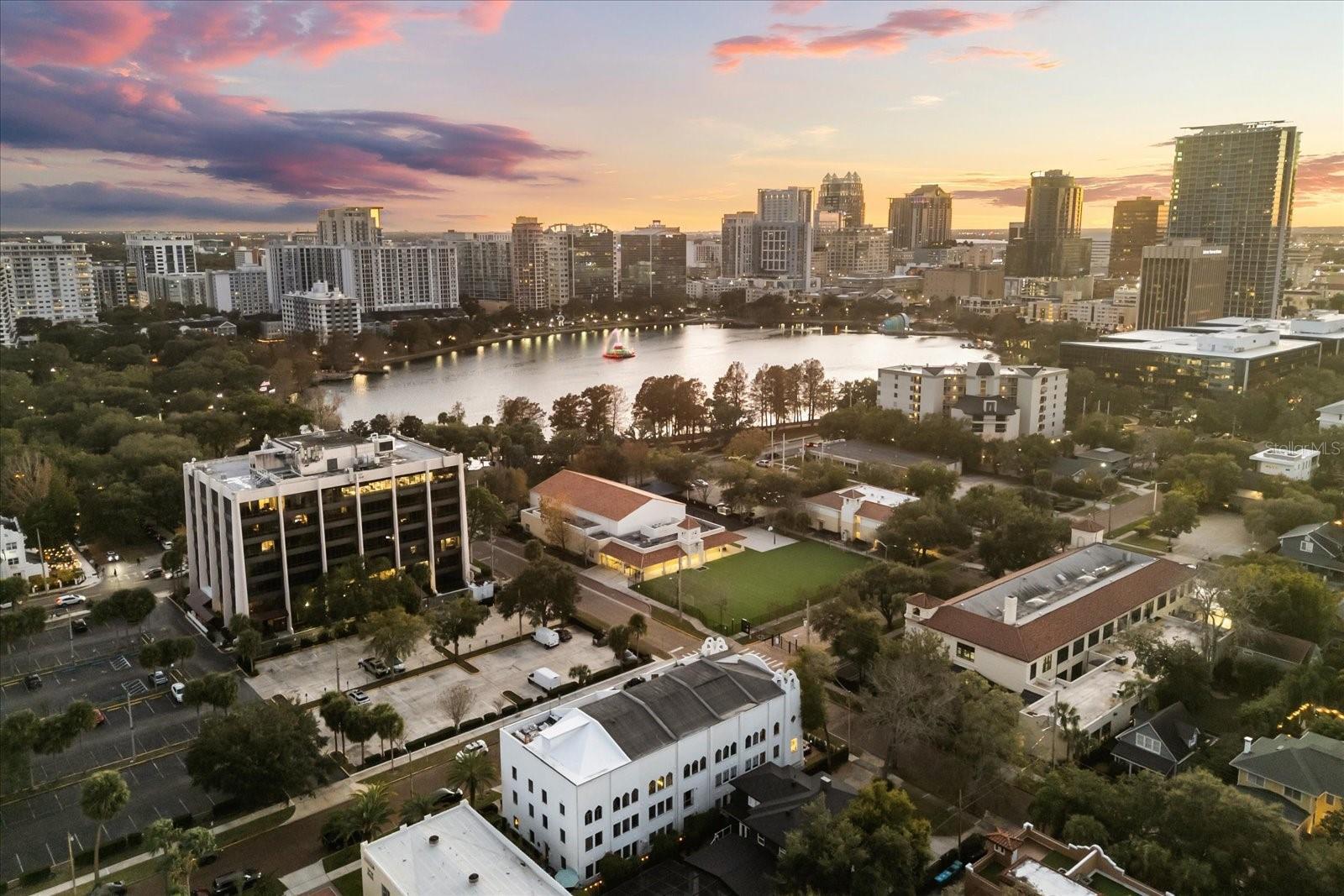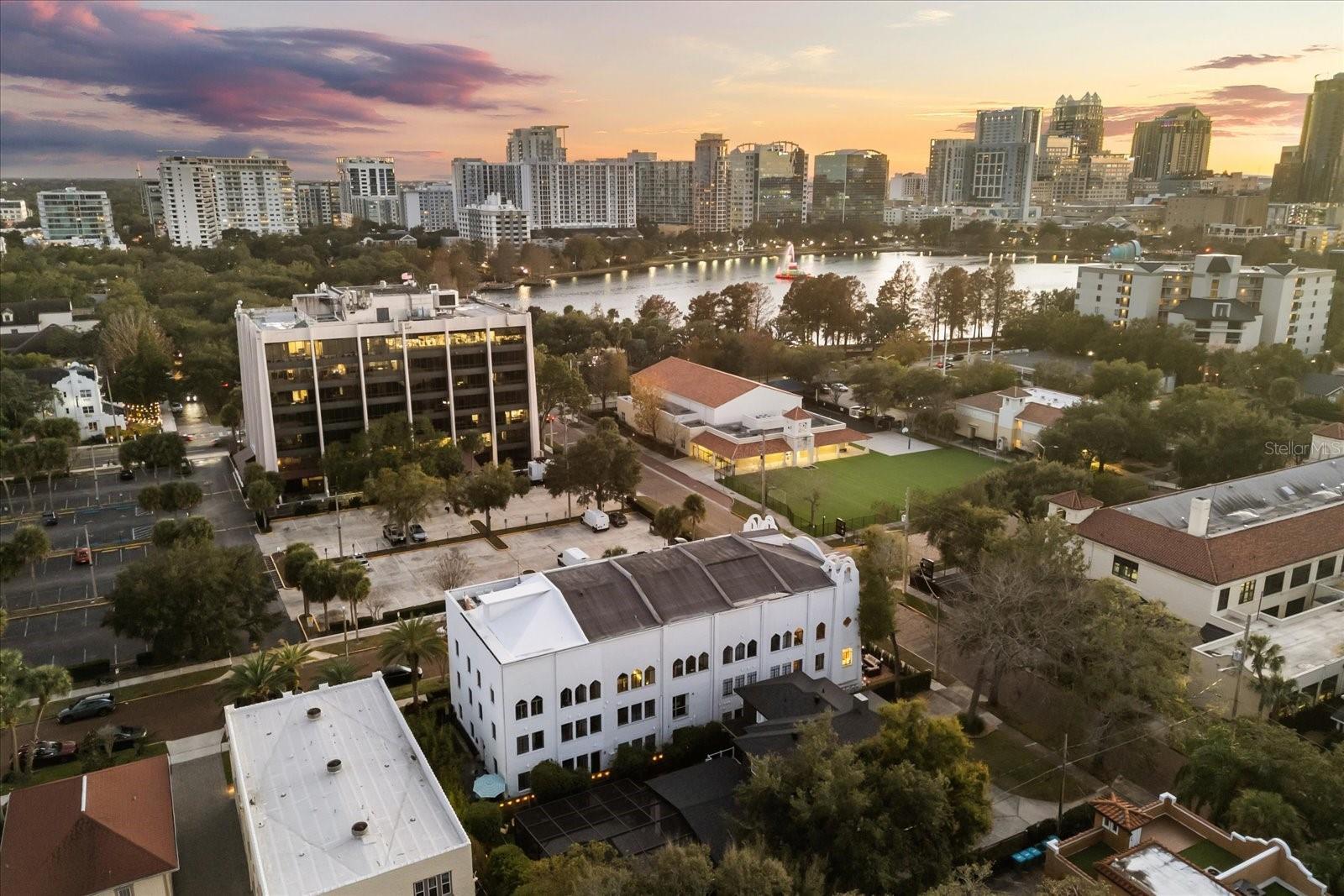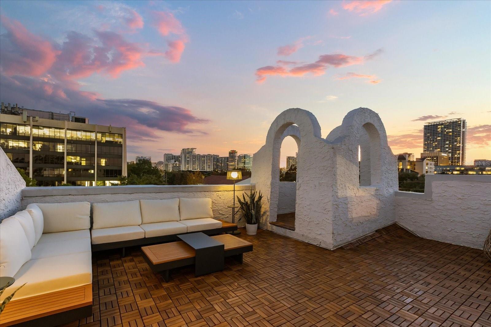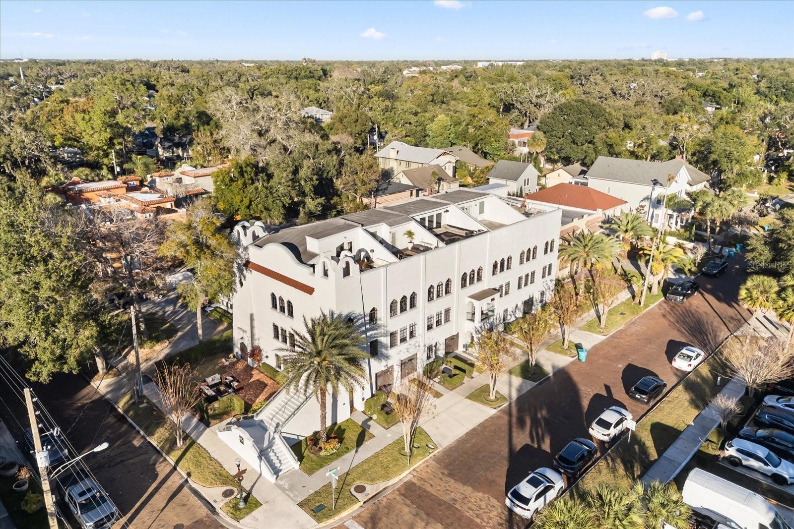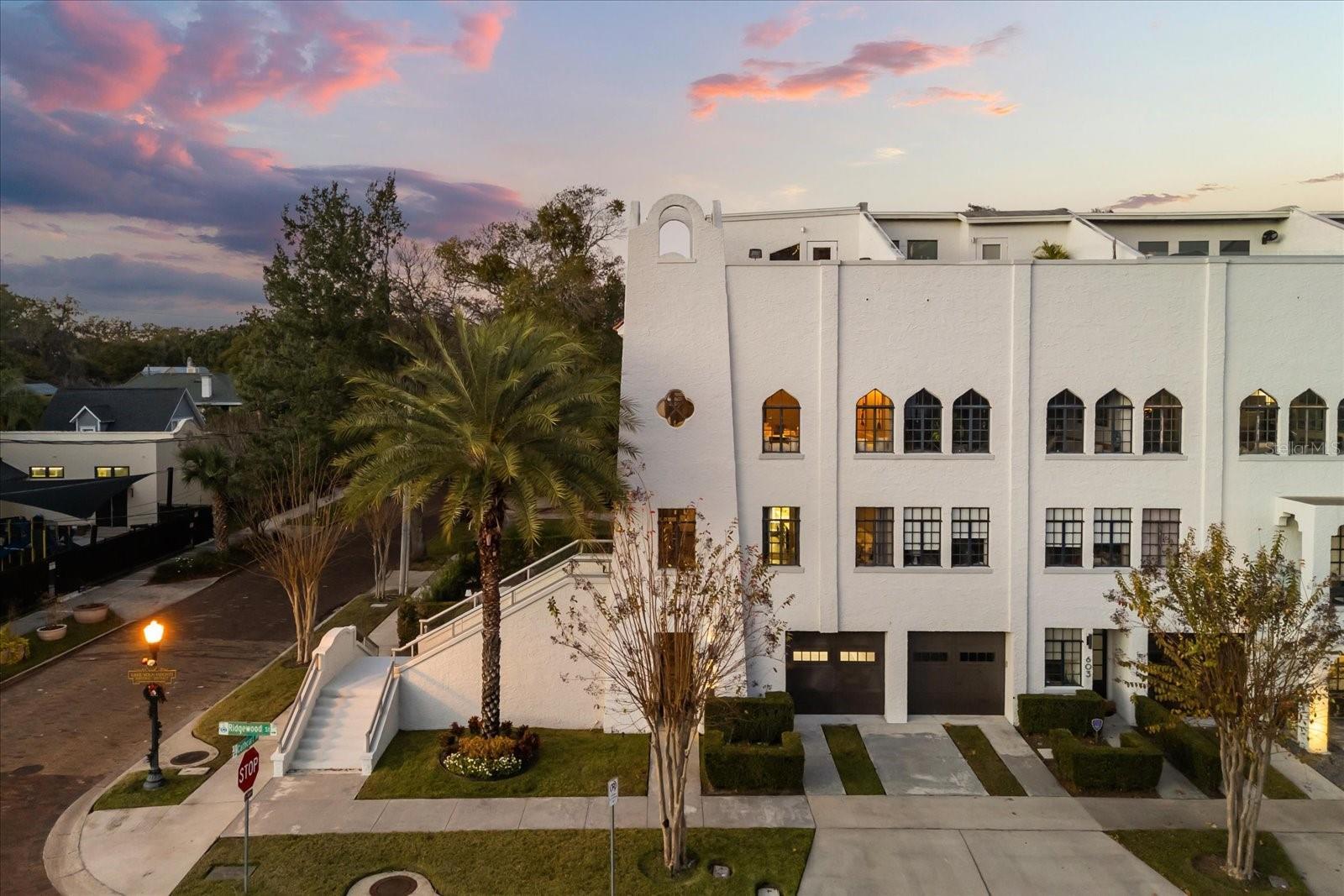 Just one block from Lake Eola Park in the heart of Downtown Orlando, this one-of-a-kind residence offers the rare opportunity to own a true piece of the city’s history. Originally built as a mission-style church in 1928, the building has been thoughtfully reimagined into a limited collection of five architecturally distinct townhomes known as The Revival. This end-unit home stands apart, with a dramatic exterior staircase leading to the original church doors, serving as a striking architectural reminder of the building’s past. Blending historic character with contemporary design in a way that feels both intentional and timeless. A private elevator connects all 4 levels of the residence, setting the tone for how seamlessly and thoughtfully the home lives from the moment you arrive. Original architectural elements—exposed brick, soaring cathedral ceilings, warm wood beams, and antique pointed steel-cased windows—tell the story of the building’s past, while designer finishes, curated lighting, and modern upgrades elevate the space for today’s lifestyle. The result is layered, refined, and unlike anything else in Downtown Orlando. The first level welcomes you with a charming entry and mudroom, along with direct access to a private backyard patio. This level also includes a flexible bedroom suite, ideal for guests or a private office, complete with its own en-suite bath and separate entrance. On the second floor, two additional en-suite bedrooms provide comfort and privacy, including a spacious primary suite featuring a beautifully appointed bath, generous counter space, and a walk-in closet with custom built-ins. The third floor anchors the home with an open-concept kitchen, featuring a substantial island with breakfast bar, seamlessly blending into the dining and living areas for effortless entertaining. A dramatic spiral staircase leads to a lofted overlook, perfect for a home office or second living area, with stairs up to a wet bar with access to the rooftop terrace, where panoramic Downtown Orlando skyline views create a truly unforgettable backdrop. From morning light streaming through historic windows to evenings spent watching Lake Eola’s fireworks from above the city, this is a home meant to be experienced—not just seen. Unforgettable sunsets, glowing city lights, and seasonal celebrations become part of everyday life here. Additional features include a large laundry room with ample storage, and a tandem two-car garage. This residence offers walkable access to dining, shopping, entertainment and cultural destinations—while delivering a living experience that is truly rare. This is not simply a home, but a thoughtfully reimagined piece of Orlando history. Come experience it for yourself. You won’t be disappointed!