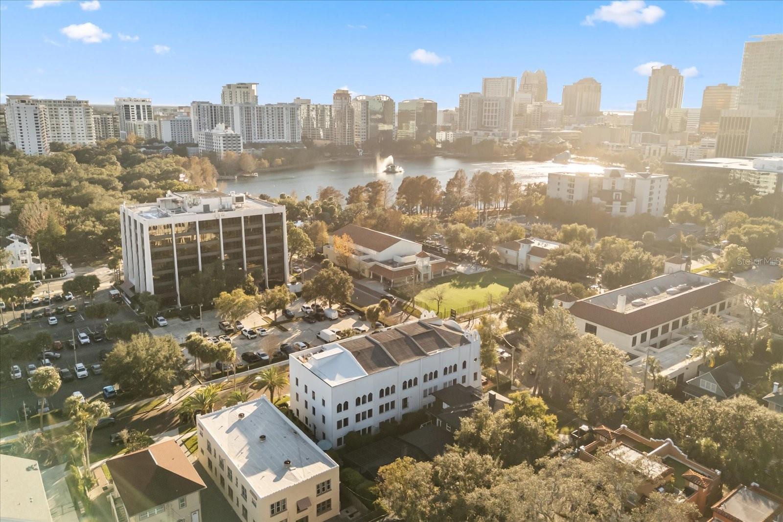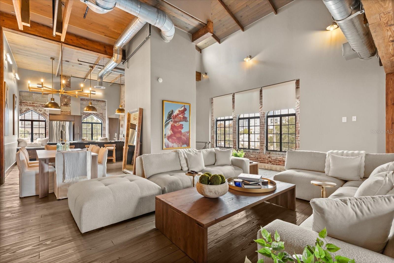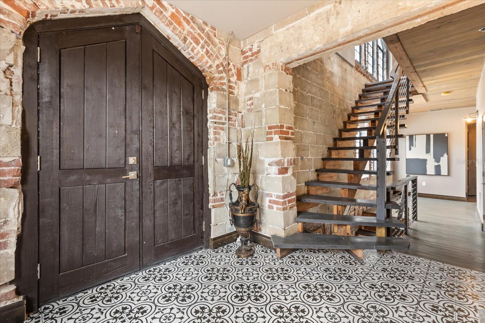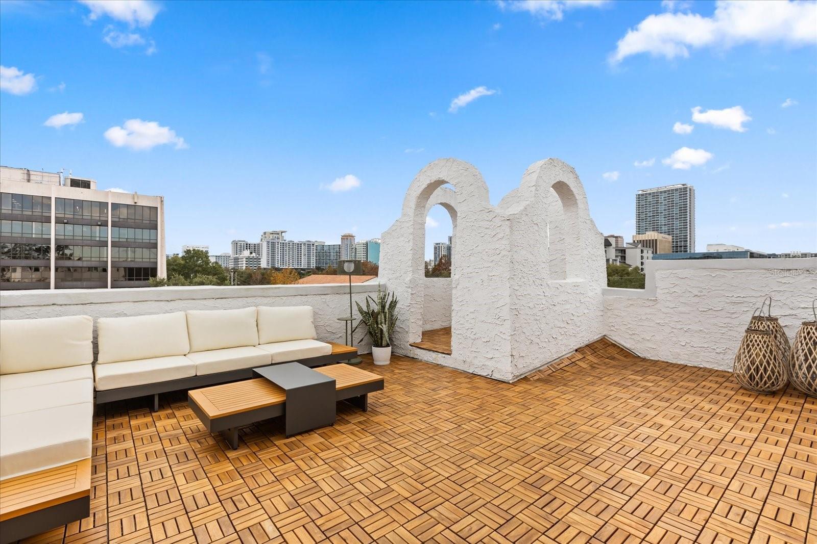 Just one block from Lake Eola Park in the heart of Downtown Orlando, this one-of-a-kind residence offers the rare opportunity to own a true piece of the city’s history. Originally built as a mission-style church in 1928, the building has been thoughtfully reimagined into a limited collection of five architecturally distinct townhomes known as The Revival. This end-unit home stands apart, with a dramatic exterior staircase leading to the original church doors, serving as a striking architectural reminder of the building’s past. Blending historic character with contemporary design in a way that feels both intentional and timeless. A private elevator connects all 4 levels of the residence, setting the tone for how seamlessly and thoughtfully the home lives from the moment you arrive. Original architectural elements—exposed brick, soaring cathedral ceilings, warm wood beams, and antique pointed steel-cased windows—tell the story of the building’s past, while designer finishes, curated lighting, and modern upgrades elevate the space for today’s lifestyle. The result is layered, refined, and unlike anything else in Downtown Orlando. The first level welcomes you with a charming entry and mudroom, along with direct access to a private backyard patio. This level also includes a flexible bedroom suite, ideal for guests or a private office, complete with its own en-suite bath and separate entrance. On the second floor, two additional en-suite bedrooms provide comfort and privacy, including a spacious primary suite featuring a beautifully appointed bath, generous counter space, and a walk-in closet with custom built-ins. The third floor anchors the home with an open-concept kitchen, featuring a substantial island with breakfast bar, seamlessly blending into the dining and living areas for effortless entertaining. A dramatic spiral staircase leads to a lofted overlook, perfect for a home office or second living area, with stairs up to a wet bar with access to the rooftop terrace, where panoramic Downtown Orlando skyline views create a truly unforgettable backdrop. From morning light streaming through historic windows to evenings spent watching Lake Eola’s fireworks from above the city, this is a home meant to be experienced—not just seen. Unforgettable sunsets, glowing city lights, and seasonal celebrations become part of everyday life here. Additional features include a large laundry room with ample storage, and a tandem two-car garage. This residence offers walkable access to dining, shopping, entertainment and cultural destinations—while delivering a living experience that is truly rare. This is not simply a home, but a thoughtfully reimagined piece of Orlando history. Come experience it for yourself. You won’t be disappointed!