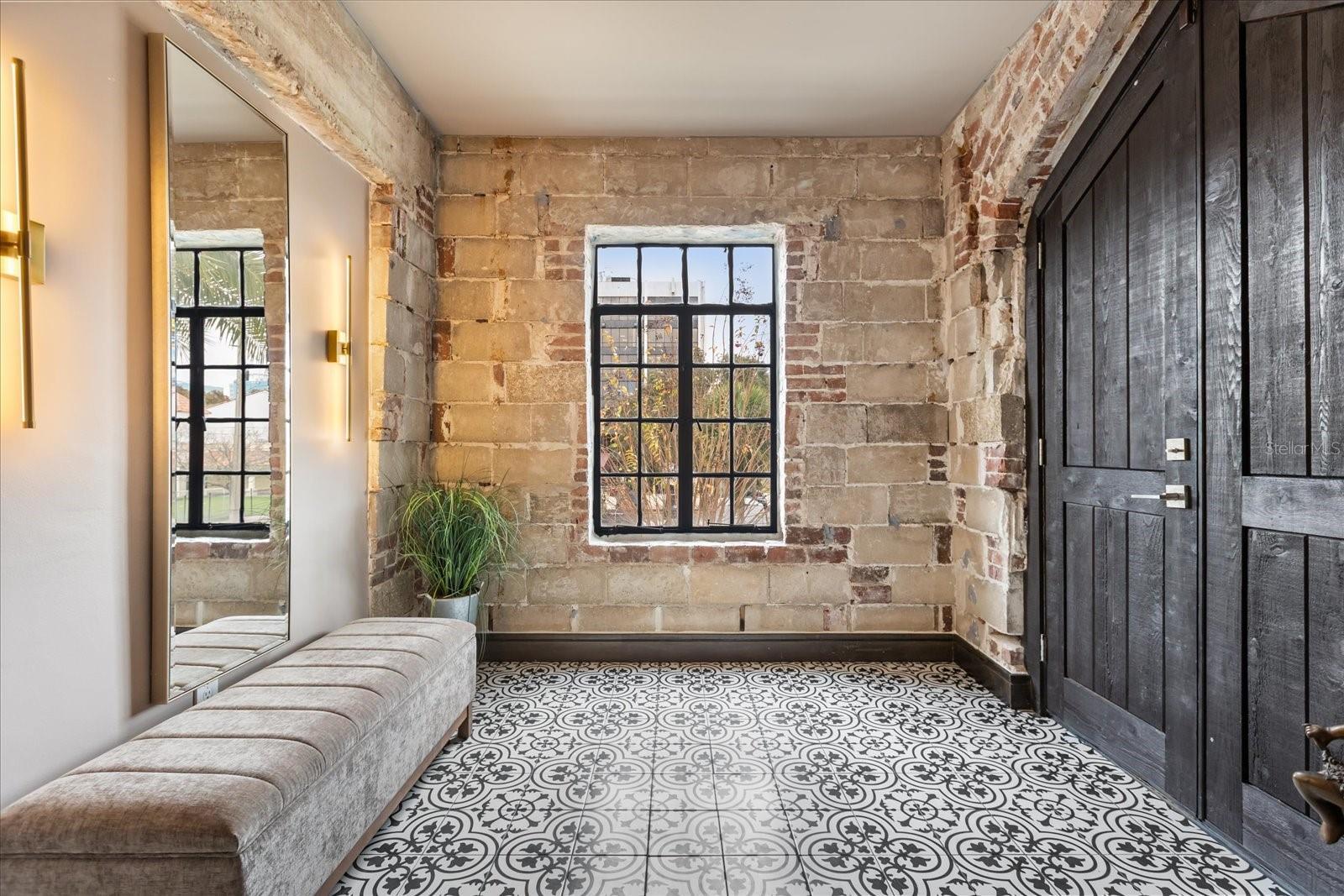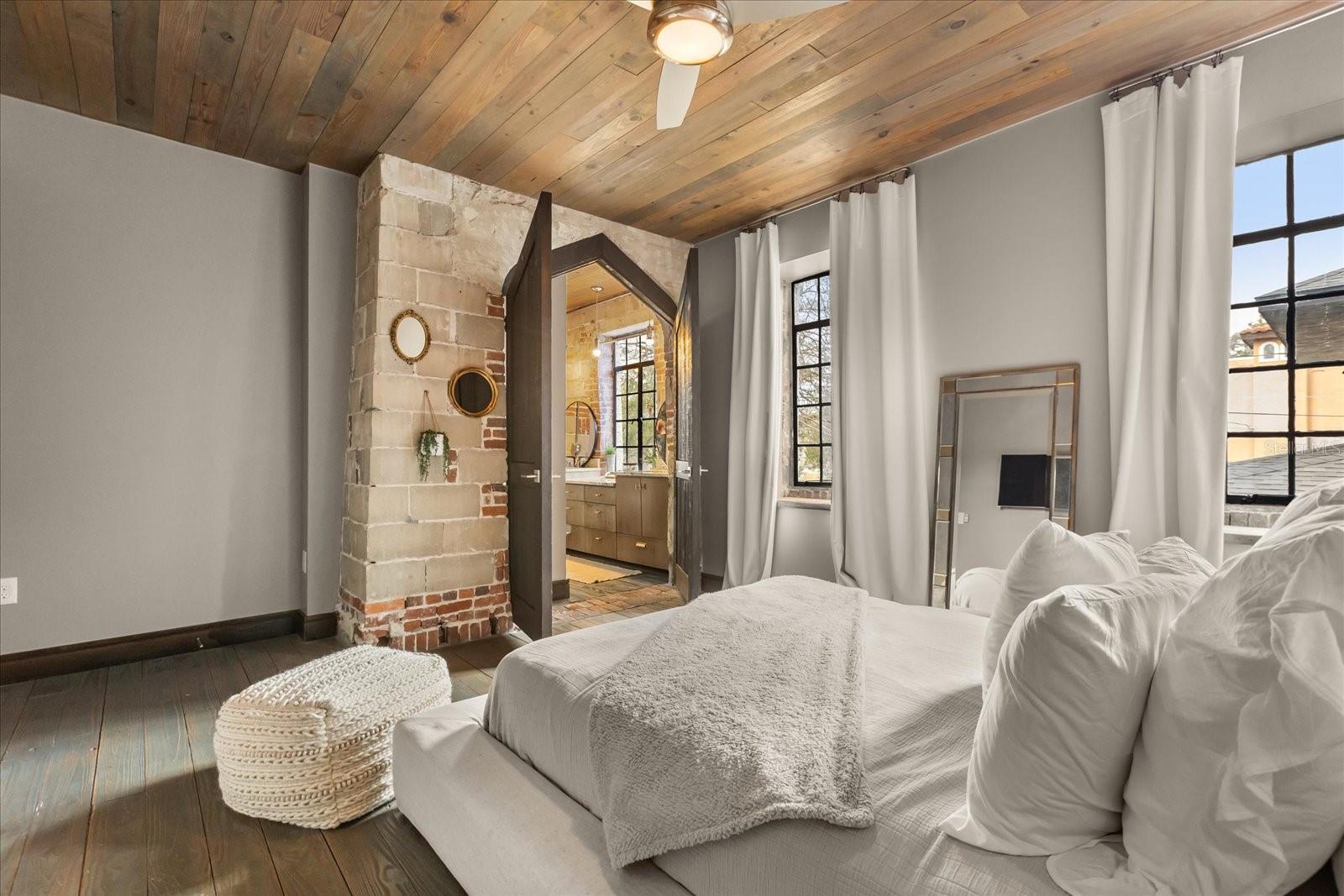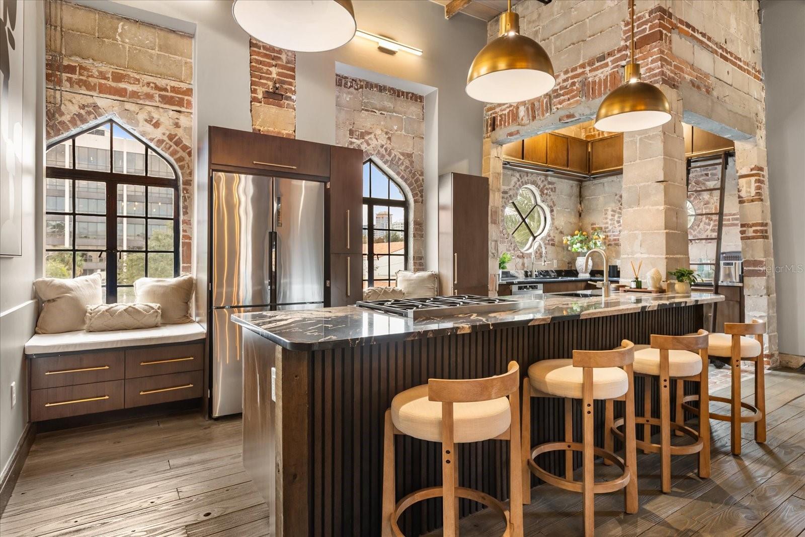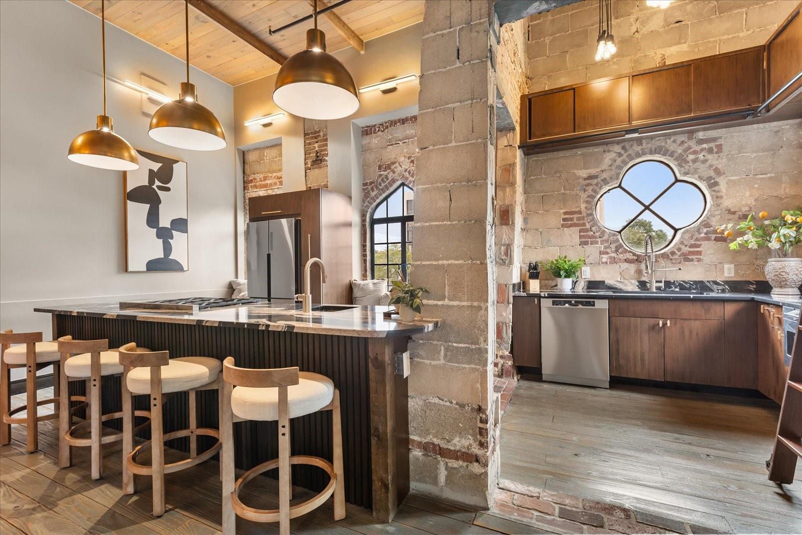 Just one block from Lake Eola Park in the heart of Downtown Orlando, this one-of-a-kind residence offers the rare opportunity to own a true piece of the city’s history. Originally built as a mission-style church in 1928, the building has been thoughtfully reimagined into a limited collection of five architecturally distinct townhomes known as The Revival. This end-unit home stands apart, with a dramatic exterior staircase leading to the original church doors, serving as a striking architectural reminder of the building’s past. Blending historic character with contemporary design in a way that feels both intentional and timeless. A private elevator connects all 4 levels of the residence, setting the tone for how seamlessly and thoughtfully the home lives from the moment you arrive. Original architectural elements—exposed brick, soaring cathedral ceilings, warm wood beams, and antique pointed steel-cased windows—tell the story of the building’s past, while designer finishes, curated lighting, and modern upgrades elevate the space for today’s lifestyle. The result is layered, refined, and unlike anything else in Downtown Orlando. The first level welcomes you with a charming entry and mudroom, along with direct access to a private backyard patio. This level also includes a flexible bedroom suite, ideal for guests or a private office, complete with its own en-suite bath and separate entrance. On the second floor, two additional en-suite bedrooms provide comfort and privacy, including a spacious primary suite featuring a beautifully appointed bath, generous counter space, and a walk-in closet with custom built-ins. The third floor anchors the home with an open-concept kitchen, featuring a substantial island with breakfast bar, seamlessly blending into the dining and living areas for effortless entertaining. A dramatic spiral staircase leads to a lofted overlook, perfect for a home office or second living area, with stairs up to a wet bar with access to the rooftop terrace, where panoramic Downtown Orlando skyline views create a truly unforgettable backdrop. From morning light streaming through historic windows to evenings spent watching Lake Eola’s fireworks from above the city, this is a home meant to be experienced—not just seen. Unforgettable sunsets, glowing city lights, and seasonal celebrations become part of everyday life here. Additional features include a large laundry room with ample storage, and a tandem two-car garage. This residence offers walkable access to dining, shopping, entertainment and cultural destinations—while delivering a living experience that is truly rare. This is not simply a home, but a thoughtfully reimagined piece of Orlando history. Come experience it for yourself. You won’t be disappointed!