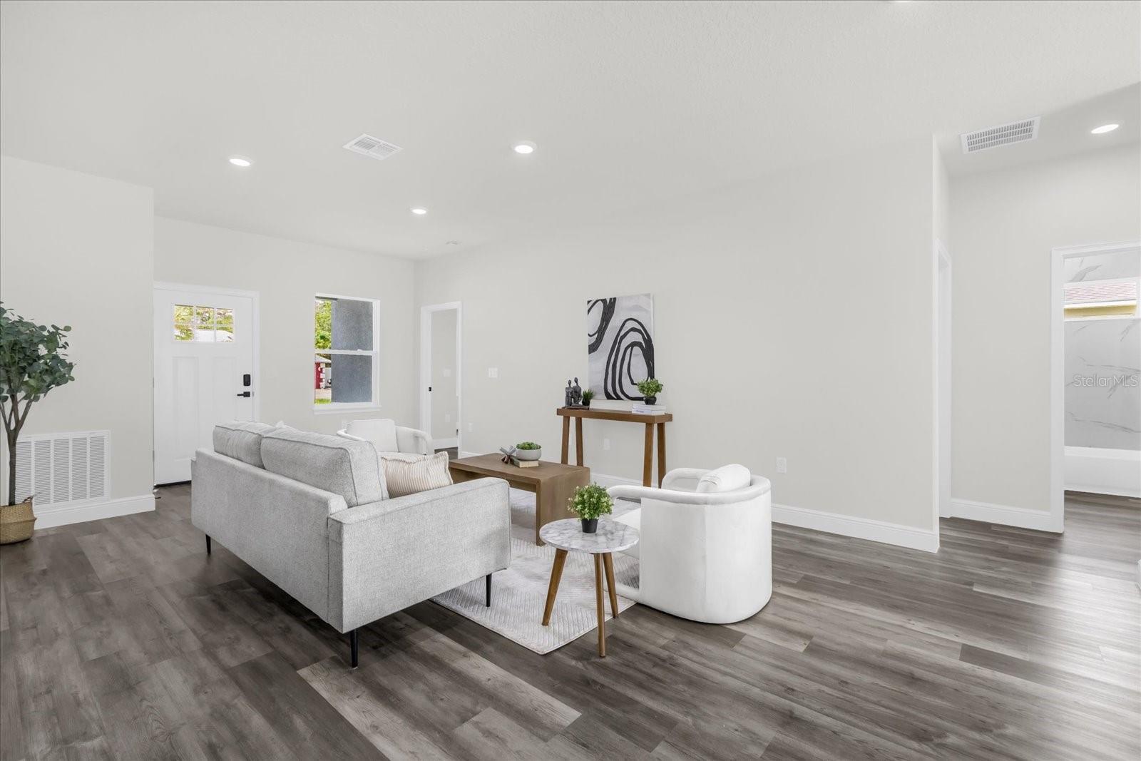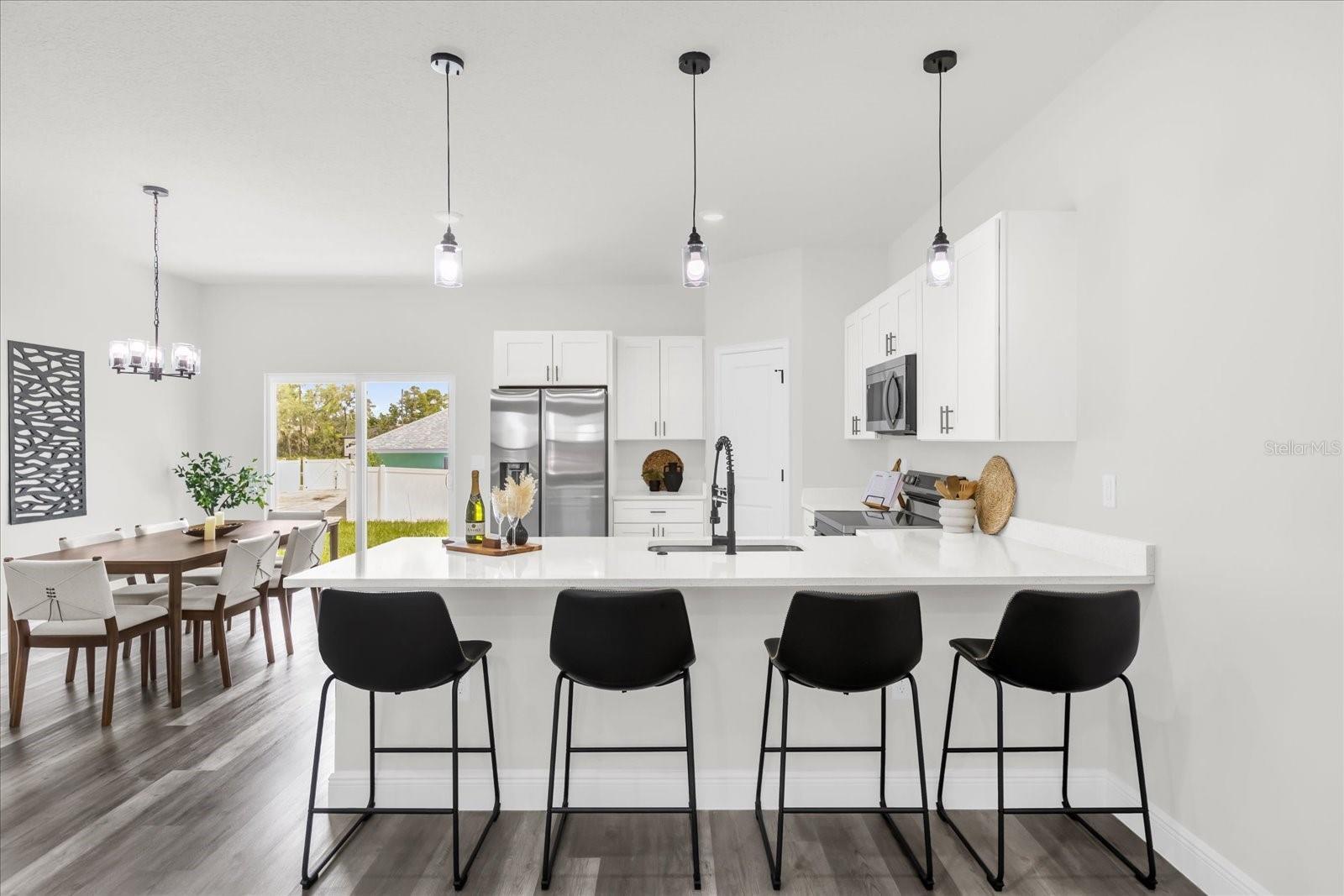 - Eat-in Kitchen, Living Room/Dining Room Combo, Open Floorplan, Solid Wood Cabinets