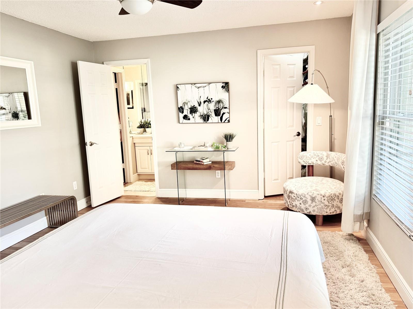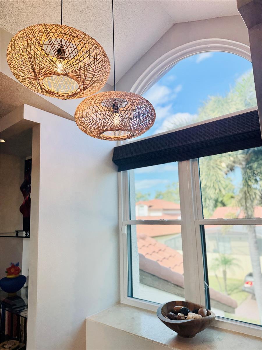 - Built-in Features, Ceiling Fans(s), Eat-in Kitchen, High Ceilings, Primary Bedroom Main Floor, Solid Surface Counters, Split Bedroom, Thermostat, Vaulted Ceiling(s), Walk-In Closet(s), Window Treatments
