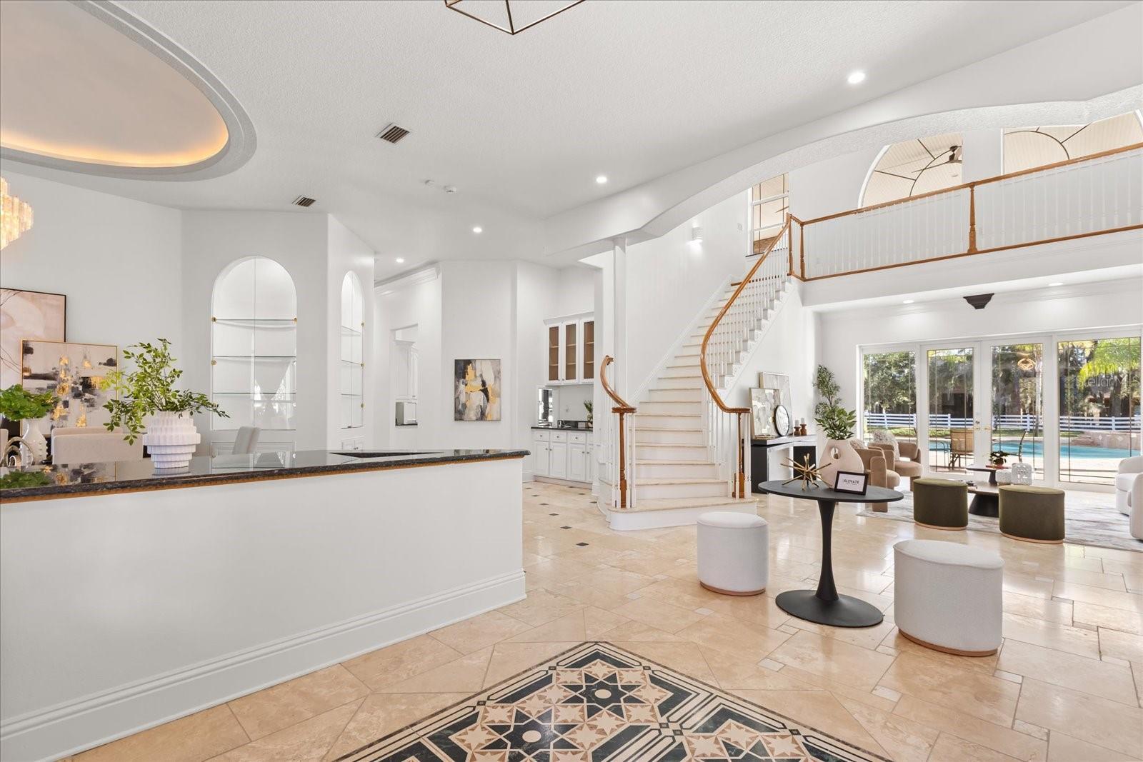 - Cathedral Ceiling(s), Ceiling Fans(s), Central Vaccum, Eat-in Kitchen, Elevator, High Ceilings, Living Room/Dining Room Combo, Open Floorplan, Primary Bedroom Main Floor, Solid Wood Cabinets, Tray Ceiling(s), Vaulted Ceiling(s), Walk-In Closet(s), Wet Bar, Window Treatments