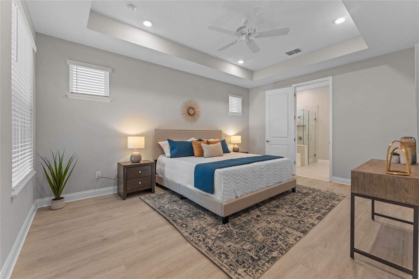 - Ceiling Fans(s), Eat-in Kitchen, High Ceilings, Living Room/Dining Room Combo, Primary Bedroom Main Floor, Solid Surface Counters, Walk-In Closet(s)