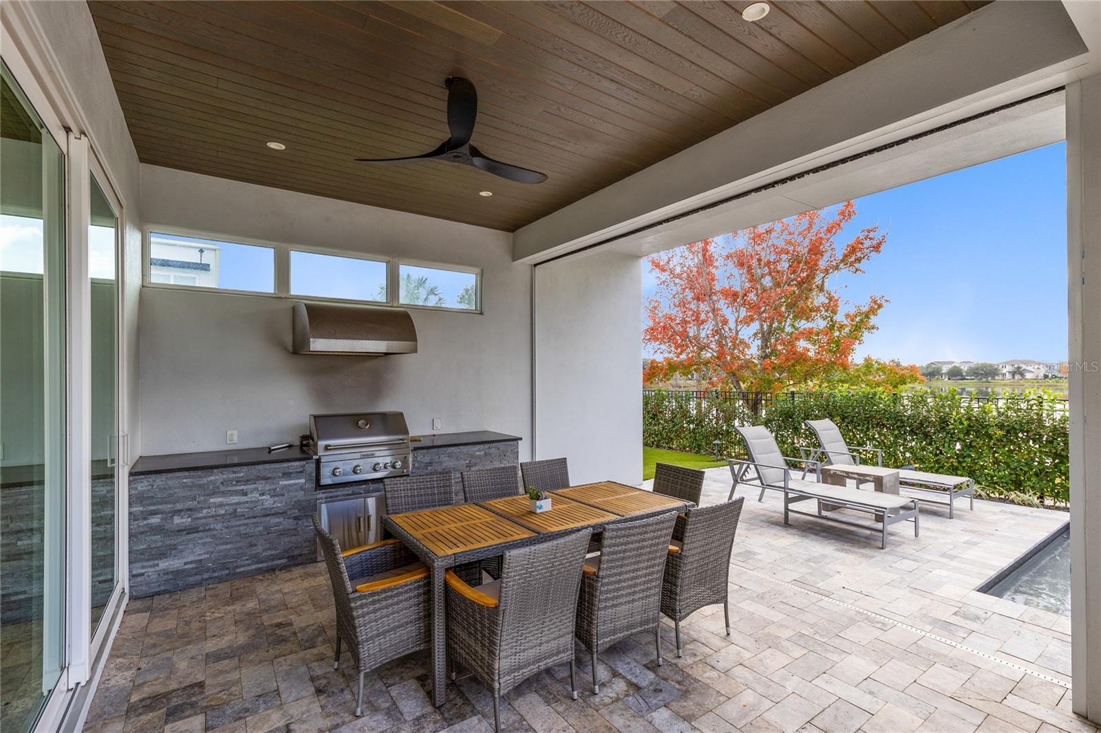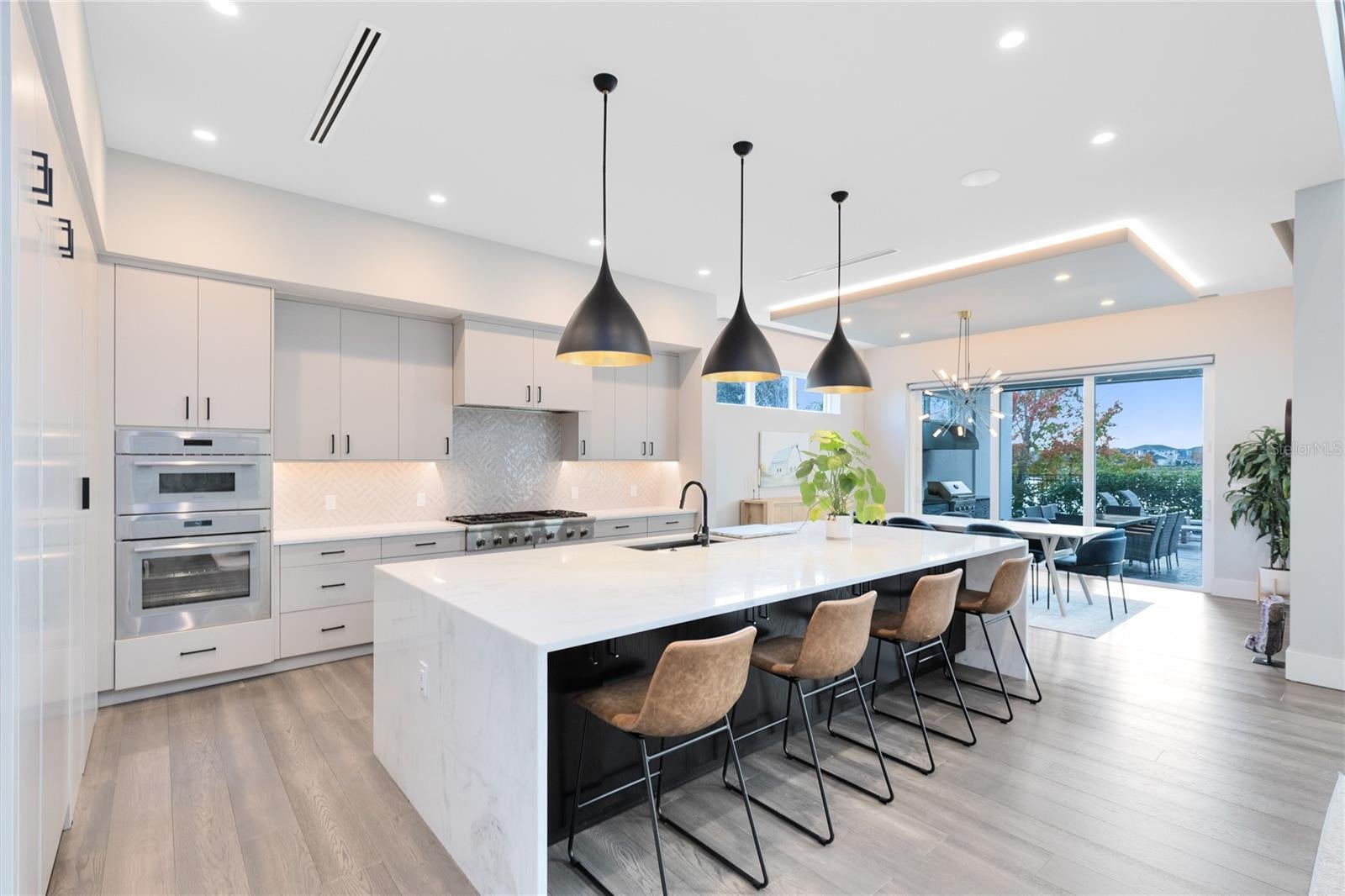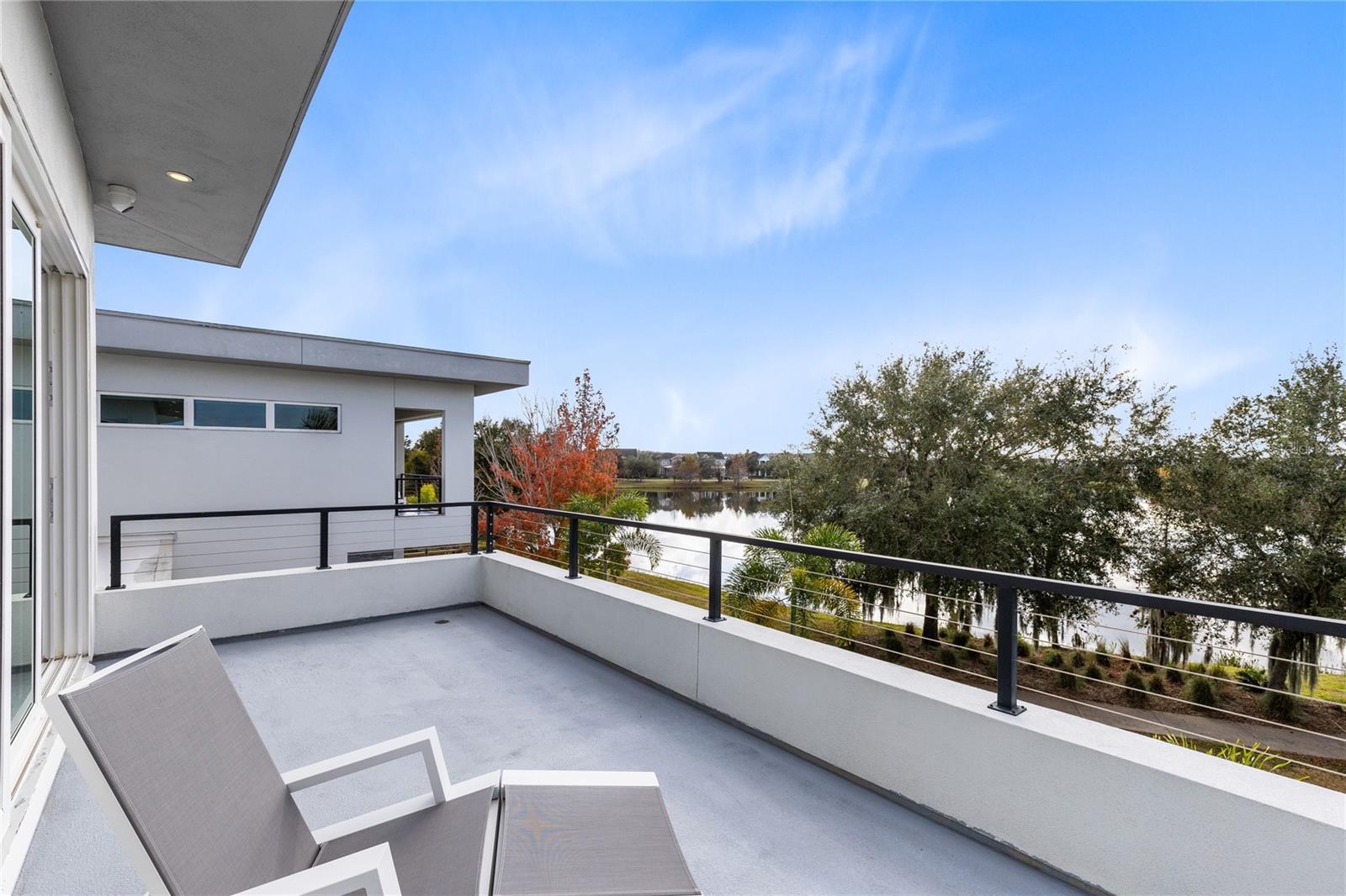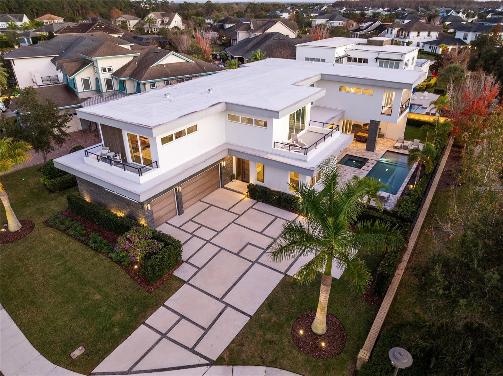 Stunning Custom Modern Estate with Lake Views in Laureate Park. Located on a premier corner cul de sac homesite in the heart of Laureate Park, this custom built modern estate offers nearly 4,500 square feet of refined living with sweeping lake views and unforgettable sunset skies. Clean architectural lines, soaring ceilings, custom tile work, and wide plank flooring create a dramatic first impression, while UV coated windows fill the home with natural light. The open main living areas are anchored by a chef’s kitchen featuring solid wood cabinetry, stone countertops, a hidden Sub Zero refrigerator, built in appliances, an oversized island, and a walk in pantry, ideal for both everyday living and entertaining. Designer chandeliers and lighting are featured throughout the home, along with custom imported European curtain rods that elevate every space. The first floor includes a private office that easily converts to a fifth bedroom, a guest en suite bedroom with full bath, and a dedicated pool bath offering exceptional flexibility. Oversized sliding doors open to an expansive covered lanai with wood paneled ceilings, recessed lighting, and ceiling fans. The private backyard is a true resort style retreat with a heated saltwater pool and spa, expansive paver decking, lush landscaping, tranquil lake views, and unparalleled sunset views. A fully equipped outdoor kitchen with built in grill, vent hood, stone counters, and bar seating completes the space and is enhanced by a whole yard app controlled Thermacell system. Upstairs, a spacious loft opens to a covered balcony overlooking the lake. The primary suite is a private sanctuary with its own balcony and a spa inspired bath featuring a freestanding soaking tub, glass enclosed walk in shower, dual floating vanities, and a custom walk in closet. A dedicated tankless water heater serves the primary suite and kitchen. Additional highlights include generously sized bedrooms with en suite options, Ecobee app controlled thermostats, a whole house water filtration system with drinkable water at every faucet, custom Lutron motorized shades with select blackout features, a professionally wired ceiling sound system, and an oversized three car garage with epoxy flooring. Enjoy the Laureate Park lifestyle with access to resort style pools, the Aquatic Center, LP Fit gym, parks, dog parks, and over 44 miles of trails. Centrally located in Lake Nona near Medical City, Nemours, the VA Hospital, dining, shopping, Orlando International Airport, USTA, and major highways.