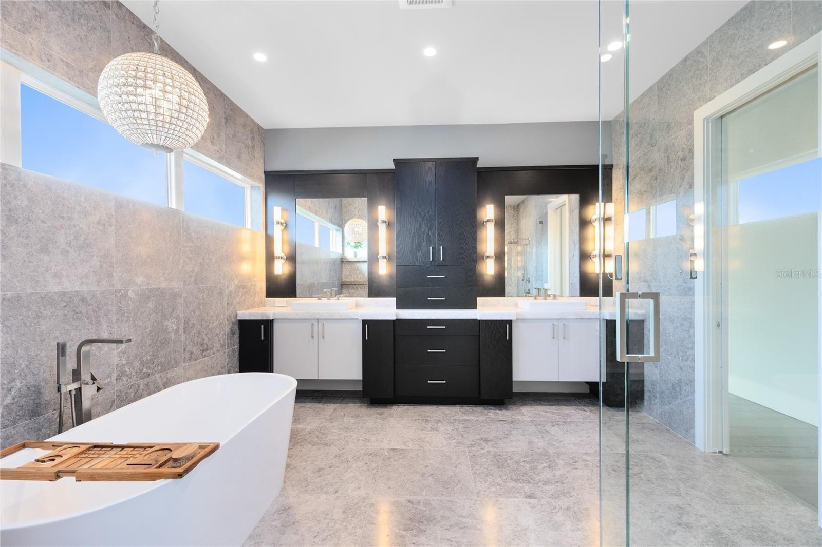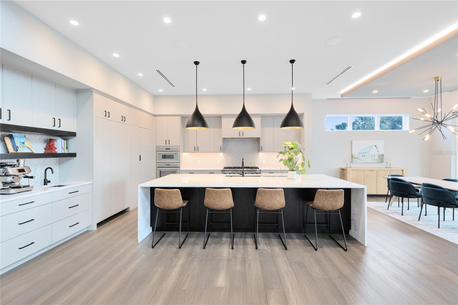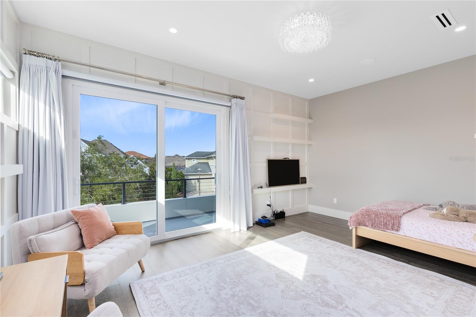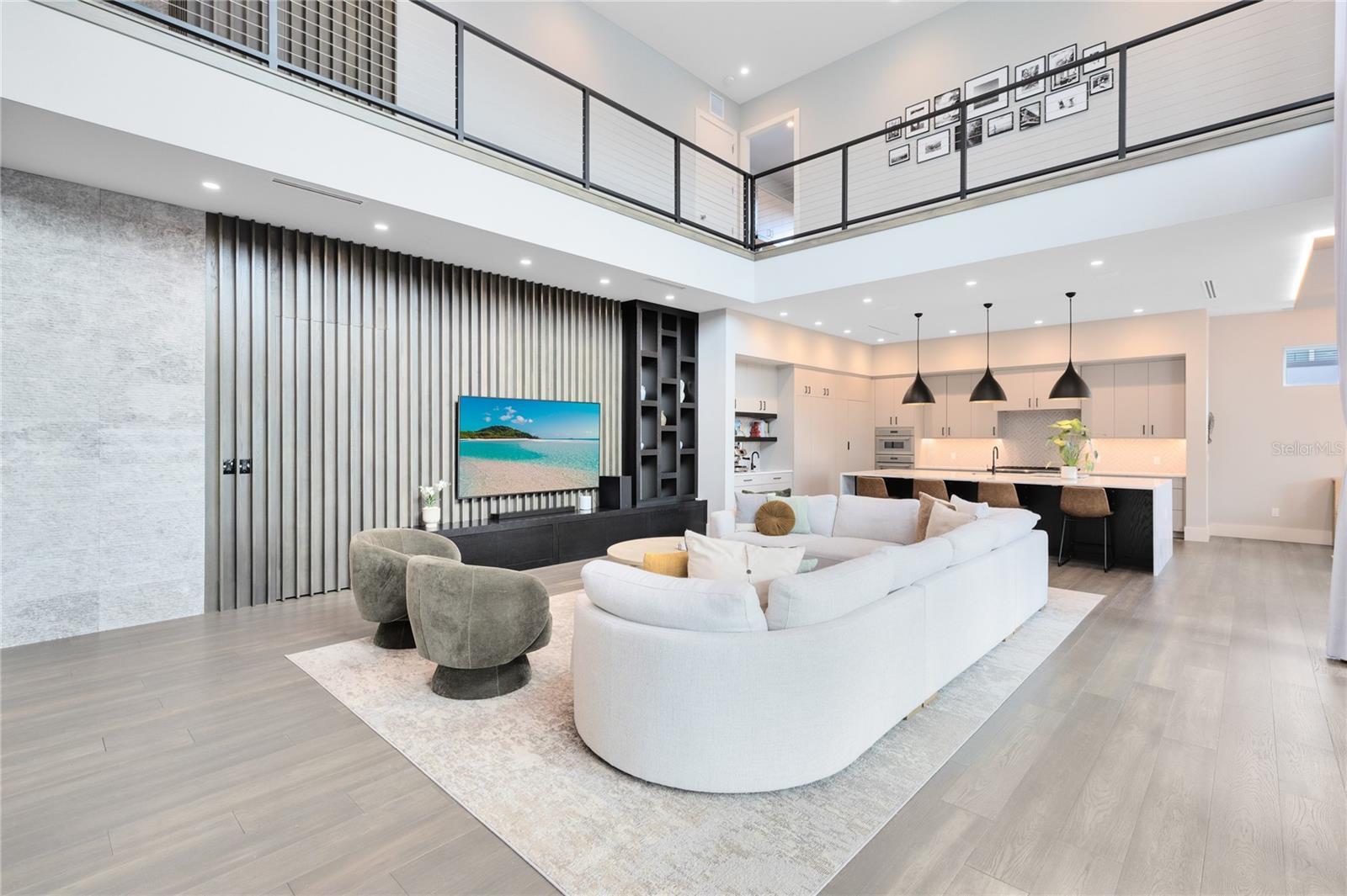 Stunning Custom Modern Estate with Lake Views in Laureate Park. Located on a premier corner cul de sac homesite in the heart of Laureate Park, this custom built modern estate offers nearly 4,500 square feet of refined living with sweeping lake views and unforgettable sunset skies. Clean architectural lines, soaring ceilings, custom tile work, and wide plank flooring create a dramatic first impression, while UV coated windows fill the home with natural light. The open main living areas are anchored by a chef’s kitchen featuring solid wood cabinetry, stone countertops, a hidden Sub Zero refrigerator, built in appliances, an oversized island, and a walk in pantry, ideal for both everyday living and entertaining. Designer chandeliers and lighting are featured throughout the home, along with custom imported European curtain rods that elevate every space. The first floor includes a private office that easily converts to a fifth bedroom, a guest en suite bedroom with full bath, and a dedicated pool bath offering exceptional flexibility. Oversized sliding doors open to an expansive covered lanai with wood paneled ceilings, recessed lighting, and ceiling fans. The private backyard is a true resort style retreat with a heated saltwater pool and spa, expansive paver decking, lush landscaping, tranquil lake views, and unparalleled sunset views. A fully equipped outdoor kitchen with built in grill, vent hood, stone counters, and bar seating completes the space and is enhanced by a whole yard app controlled Thermacell system. Upstairs, a spacious loft opens to a covered balcony overlooking the lake. The primary suite is a private sanctuary with its own balcony and a spa inspired bath featuring a freestanding soaking tub, glass enclosed walk in shower, dual floating vanities, and a custom walk in closet. A dedicated tankless water heater serves the primary suite and kitchen. Additional highlights include generously sized bedrooms with en suite options, Ecobee app controlled thermostats, a whole house water filtration system with drinkable water at every faucet, custom Lutron motorized shades with select blackout features, a professionally wired ceiling sound system, and an oversized three car garage with epoxy flooring. Enjoy the Laureate Park lifestyle with access to resort style pools, the Aquatic Center, LP Fit gym, parks, dog parks, and over 44 miles of trails. Centrally located in Lake Nona near Medical City, Nemours, the VA Hospital, dining, shopping, Orlando International Airport, USTA, and major highways.