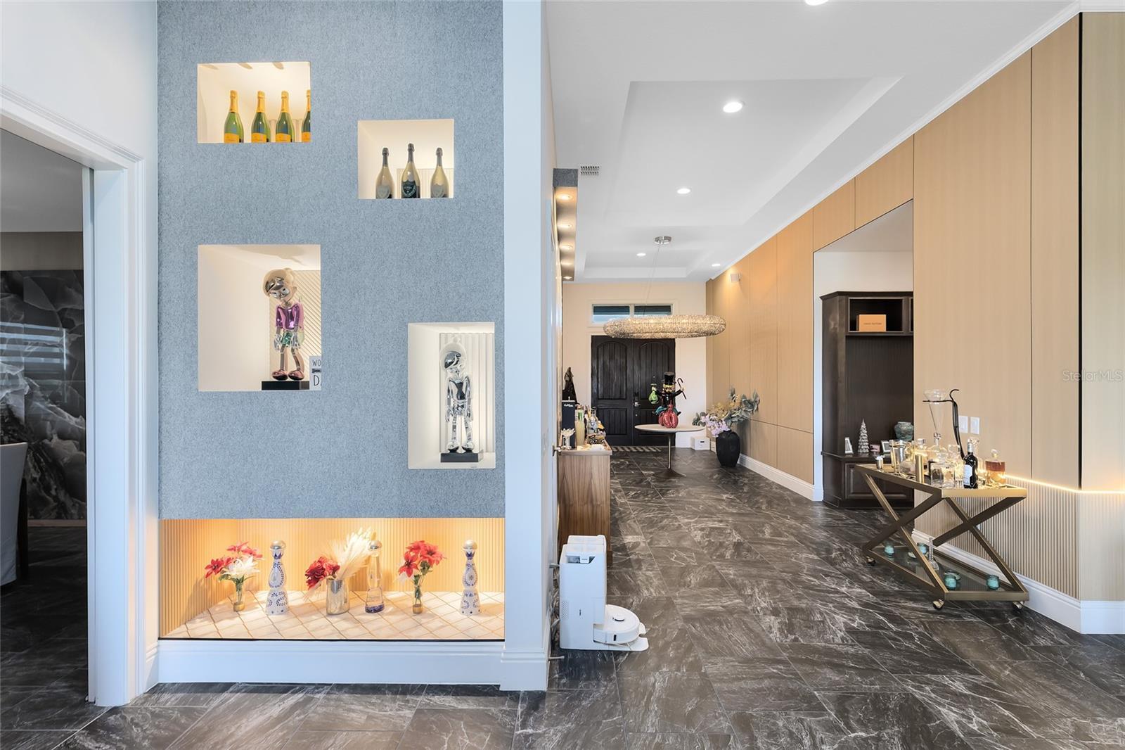 - Built-in Features, Ceiling Fans(s), Dry Bar, Eat-in Kitchen, Kitchen/Family Room Combo, Open Floorplan, Primary Bedroom Main Floor, Solid Wood Cabinets, Stone Counters, Thermostat, Walk-In Closet(s), Window Treatments