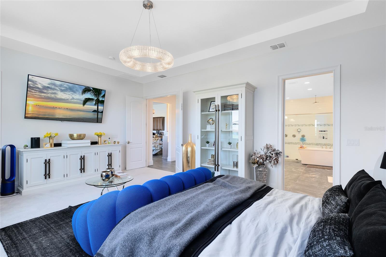 Step into the epitome of luxurious living with this exquisite residence, perfectly nestled in a prestigious 24-hour guard-gated Eagle Creek Village community in Lake Nona. Every detail in this home has been meticulously designed to offer both luxury and functionality, making it a true sanctuary for discerning homeowners. As you enter, the grand foyer welcomes you with its high ceilings and sleek porcelain tile flooring that extends throughout the home, setting the tone for the opulent spaces that unfold. The open floor plan effortlessly connects the living, dining, and kitchen areas, creating an inviting atmosphere that is perfect for both serene living and grand entertaining. The chef’s kitchen is a masterpiece of design, equipped with high-end appliances, custom dark wood cabinetry, and a sprawling quartz island where friends and family can gather around for casual meals or festive preparations. The adjacent formal dining area, defined by a striking marble accent wall and elegant modern chandeliers, offers the perfect backdrop for intimate dinners and lavish gatherings. The living area, a harmonious blend of comfort and style. Large sliding glass doors frame stunning views of the outdoor living space and flood the room with natural light. Step outside to discover a covered patio equipped with a state-of-the-art outdoor kitchen, including a built-in grill and sophisticated dining setup, perfect for al fresco dining under the stars. The resort-style pool and spa, surrounded by a screened enclosure, provide a private oasis with panoramic views of the meticulously maintained golf course. Retreat to the luxurious master suite, where tranquility awaits. The spa-like bathroom boasts a freestanding soaking tub, a spacious walk-in shower, dual vanities, and leads to a generously sized walk-in closet. Each additional bedroom offers unique comforts and stylish designs, ensuring every family member or guest enjoys personal space with upscale amenities. Community amenities enrich this luxurious lifestyle further, featuring a championship golf course, a chic restaurant and bar, and a fitness and recreation center. Tennis and basketball courts, along with meticulously landscaped parks and a dog park, cater to both active lifestyles and serene leisure. Located just minutes from major transport routes, top-notch shopping, gourmet dining, and elite medical facilities, this home offers not just a living space but a lifestyle of unmatched luxury and convenience. Discover the true meaning of upscale living in a home that goes beyond the ordinary, designed for those who seek the very best in life.