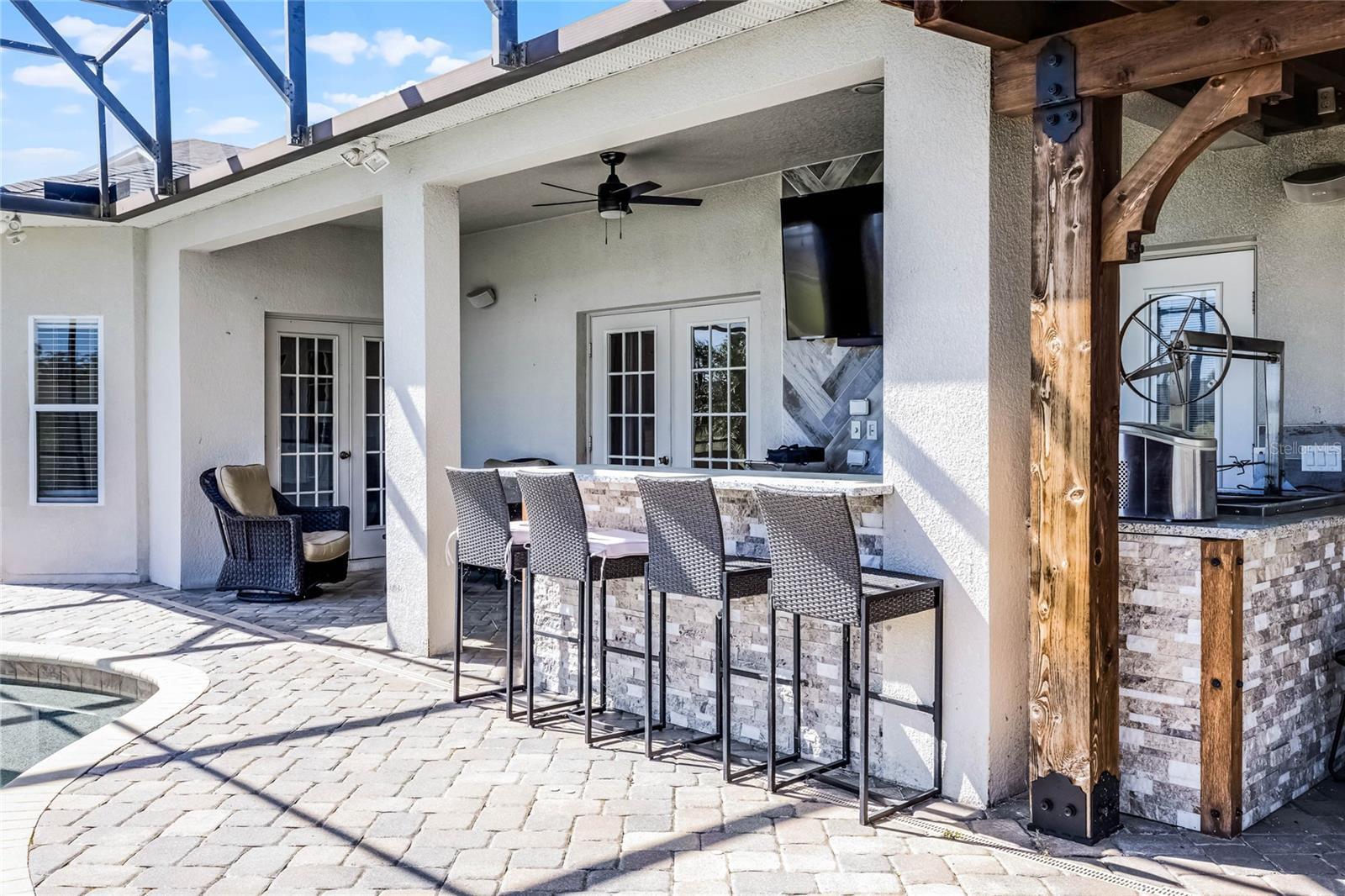 - French Doors, Outdoor Kitchen, Rain Gutters, Sidewalk