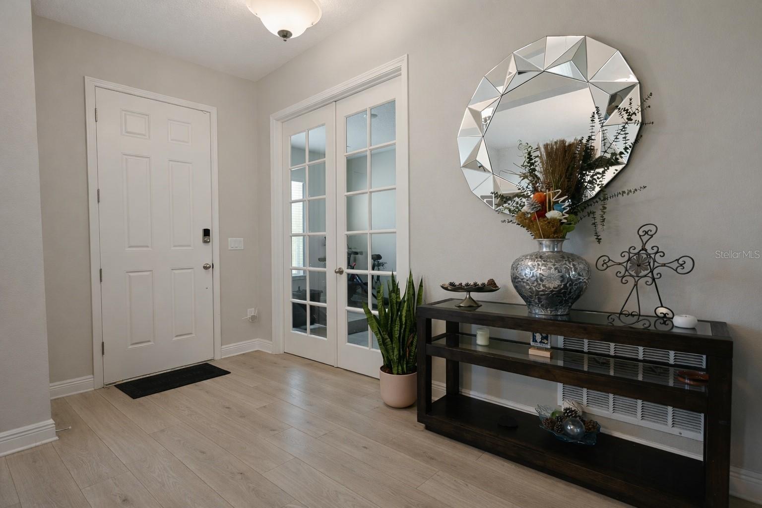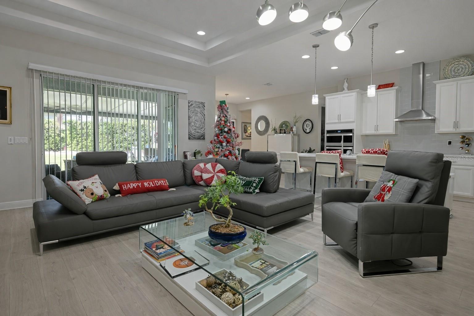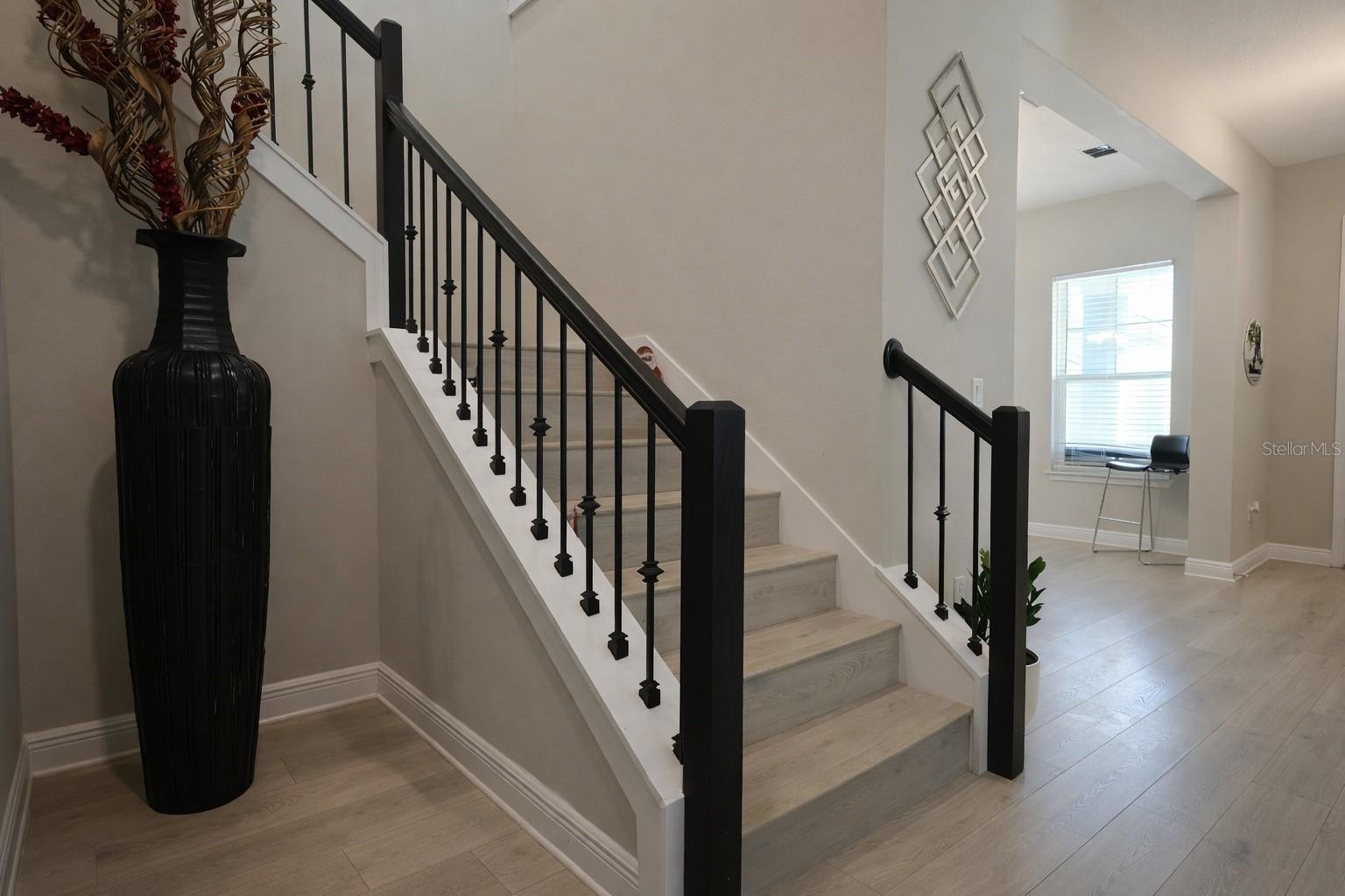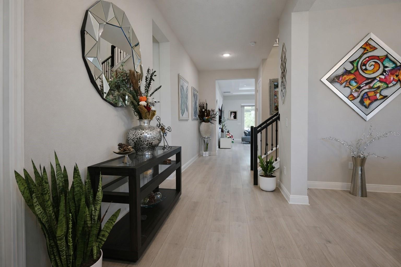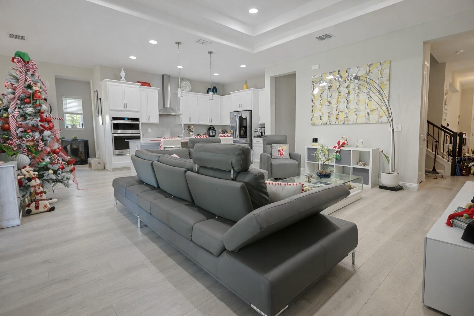Located in the desirable Wincey Groves/Hamlin area of Winter Garden, this spacious Ellington floor plan, built in 2021, offers five bedrooms, 3.5 baths, and approximately 3,628 sq ft of living space, including a desirable first-floor owner’s suite, a dedicated office, and a separate dining room for effortless entertaining. The gourmet kitchen features quartz countertops, linen cabinetry, and an oven/microwave combo, opening to a bright great room with 10-foot ceilings and stylish tile flooring throughout the main living areas, while the bedrooms have a soft carpet for added comfort. Outdoors, a large covered lanai flows into an expansive entertainment area complete with a fully equipped outdoor kitchen, generous seating space, and a cozy fire-pit zone ideal for gatherings on cool Florida evenings. Upstairs, a generous loft anchors the secondary bedrooms, providing an ideal retreat for guests, family, or a media/play area. Set on an oversized 7,500 sq ft corner lot with an east-facing orientation, this home also boasts a 3-car tandem garage for extra storage, a metered sprinkler system, and plenty of yard space, all just minutes from Hamlin’s shopping, dining, major roadways, and sought-after Horizon High School and other top-rated Orange County schools
