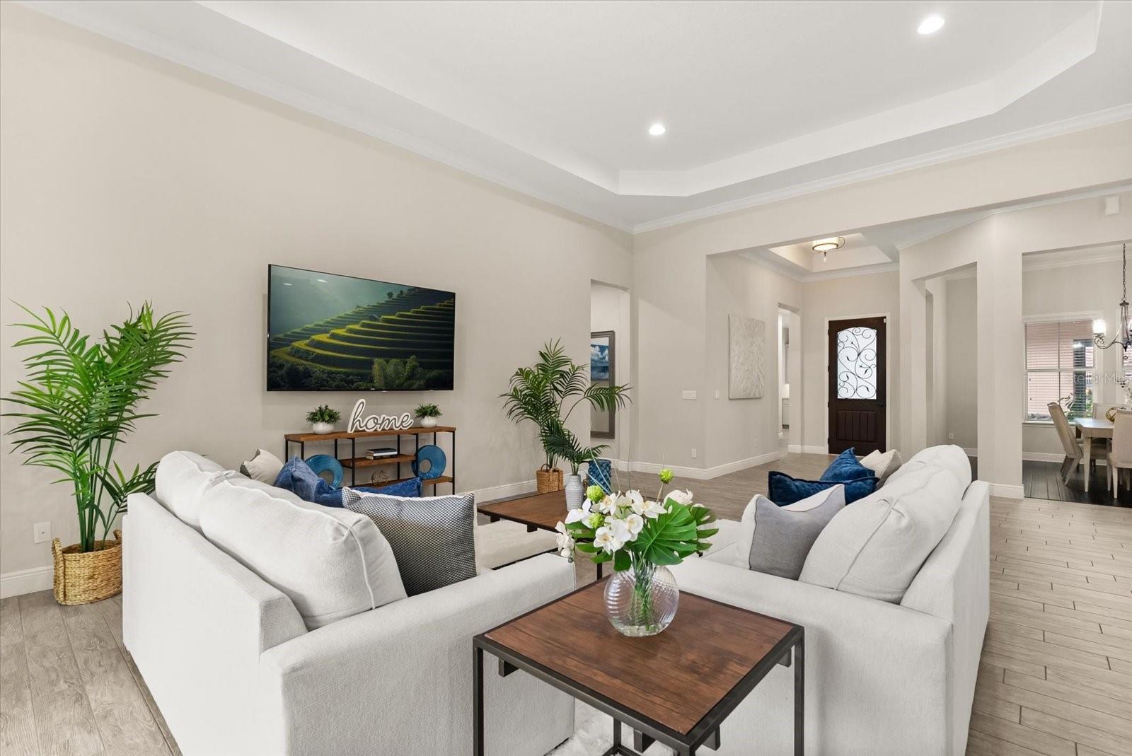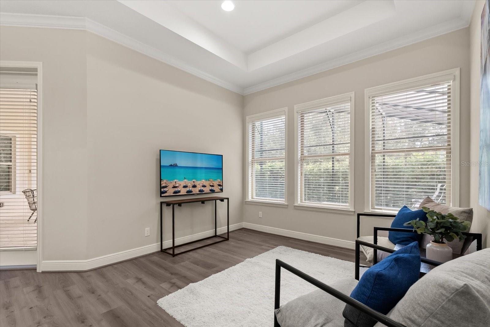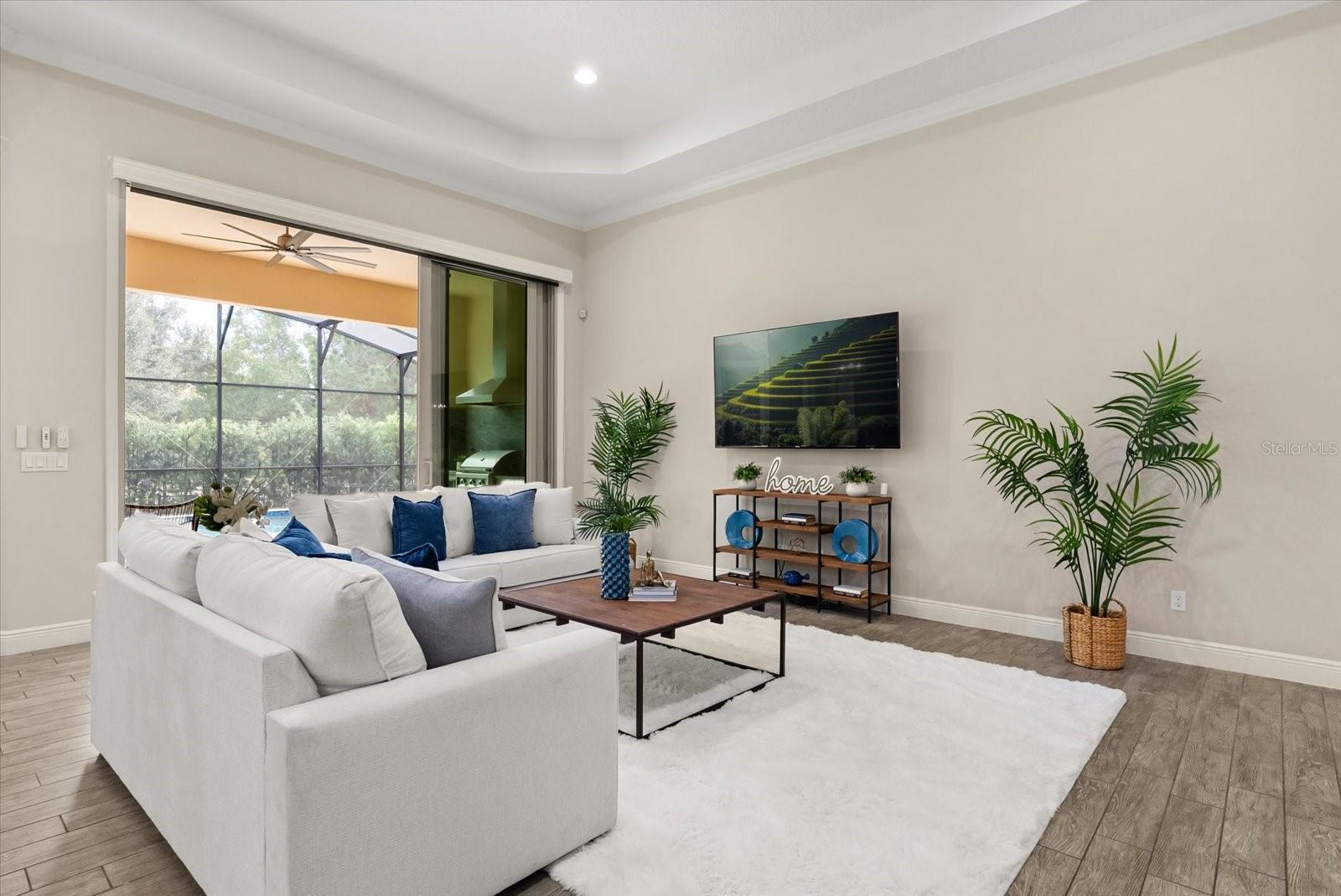 One or more photo(s) has been virtually staged. Located in the gated community of Steeple Chase, this single-story 2018 Monte Carlo floor plan offers four bedrooms, four bathrooms, an office, and a flex space on a private lot with no rear neighbors. The home combines energy-efficient construction with an open, functional layout designed for modern Florida living. A circular brick paver driveway provides ample parking and leads to two separate screened outdoor living areas. The front courtyard offers a private, fully screened space with brick pavers, while the backyard is centered around a 40-foot natural gas heated saltwater pool enclosed by an oversized screen for added privacy. Travertine pavers surround the pool and extend beneath the covered lanai, which includes a custom summer kitchen with Quartzite countertops, natural gas grill, outdoor refrigerator, and an electric shade with integrated LED lighting. Inside, high ceilings and 10-foot sliding glass doors create a bright, open feel while enhancing indoor-outdoor flow. Electronic shades allow for flexible light control throughout the main living areas. The kitchen features an oversized island, 42-inch GE Monogram built-in refrigerator, Monogram oven, natural gas cooktop, microwave convection combo, and a built-in custom ice maker. The primary suite is located at the rear of the home with views of the pool and includes a sitting area, dual vanities, walk-in shower, and a custom walk-in closet. A separate guest suite near the front of the home offers an ensuite bathroom and walk-in closet, providing privacy for visitors. Additional features include an oversized laundry room with storage, aluminum-fenced yard with privacy hedge, and a whole-home exterior camera system. Steeple Chase features a landscaped, gated entrance, mature trees, ponds, pocket parks, and views of Lake Linden. Residents enjoy direct access to the Seminole Wekiva Trail and convenient proximity to Lake Mary shopping, dining, entertainment, and major employment centers.