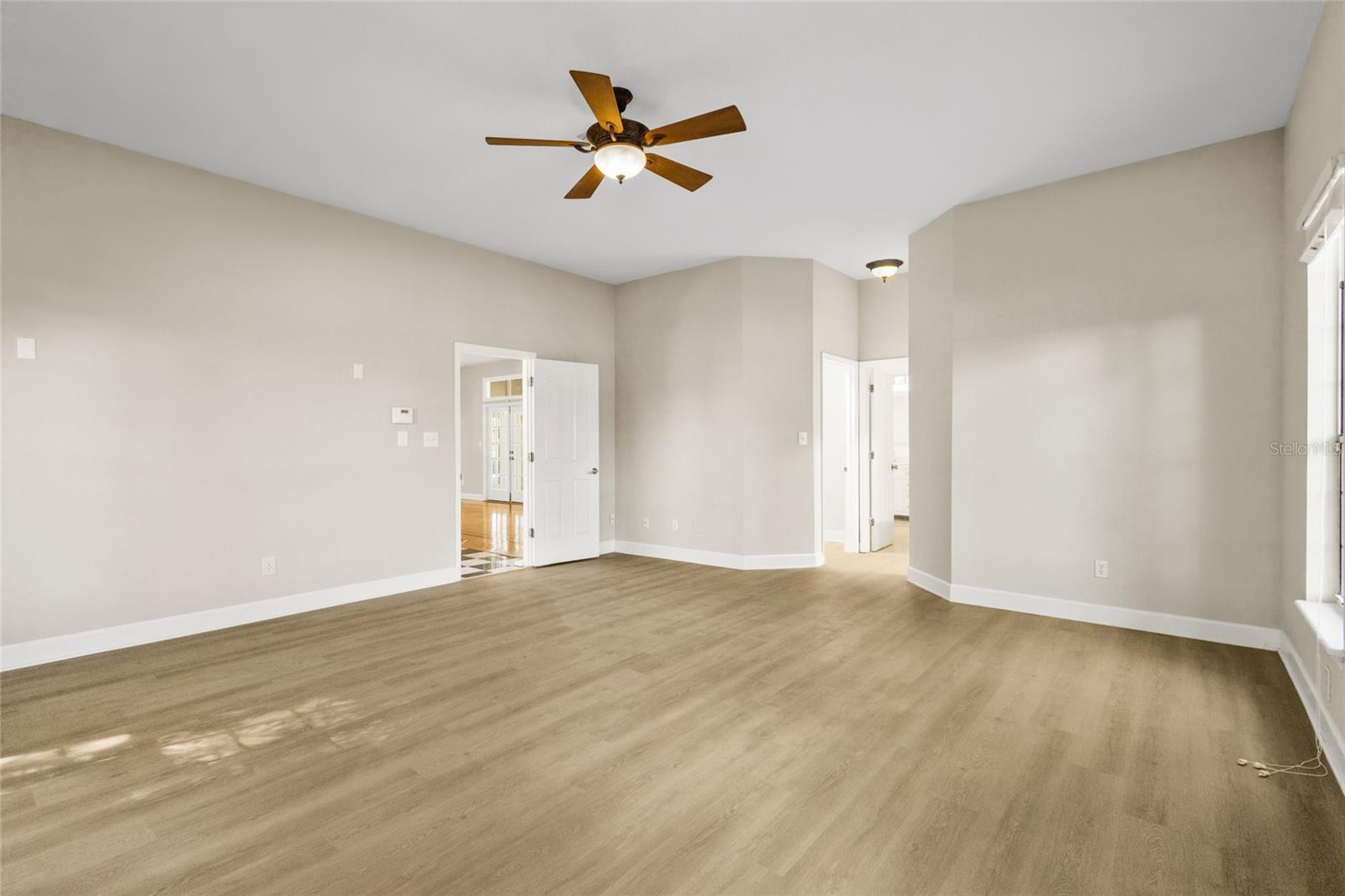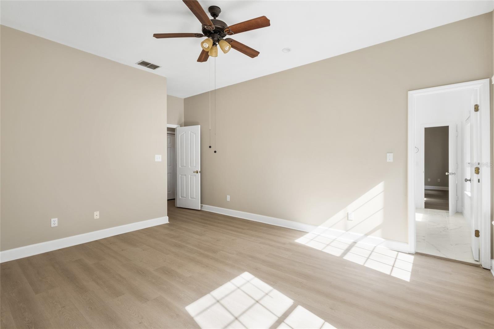 - Ceiling Fans(s), Living Room/Dining Room Combo, Open Floorplan, Primary Bedroom Main Floor, Solid Wood Cabinets, Stone Counters, Thermostat, Walk-In Closet(s)