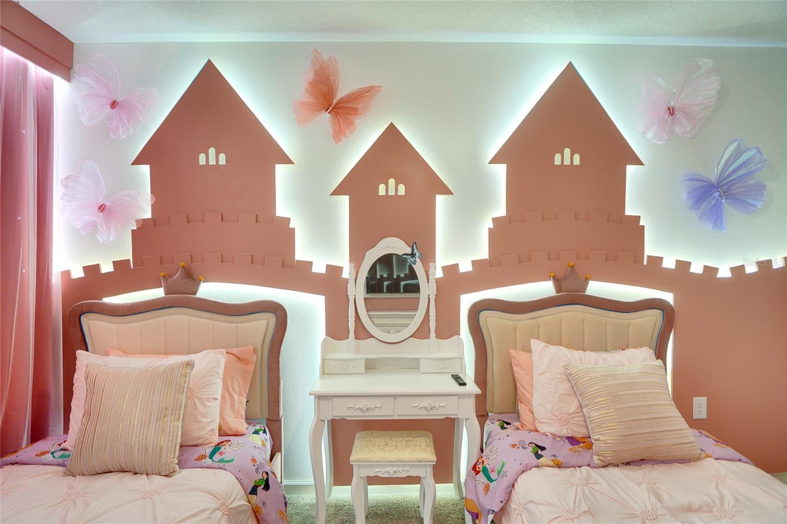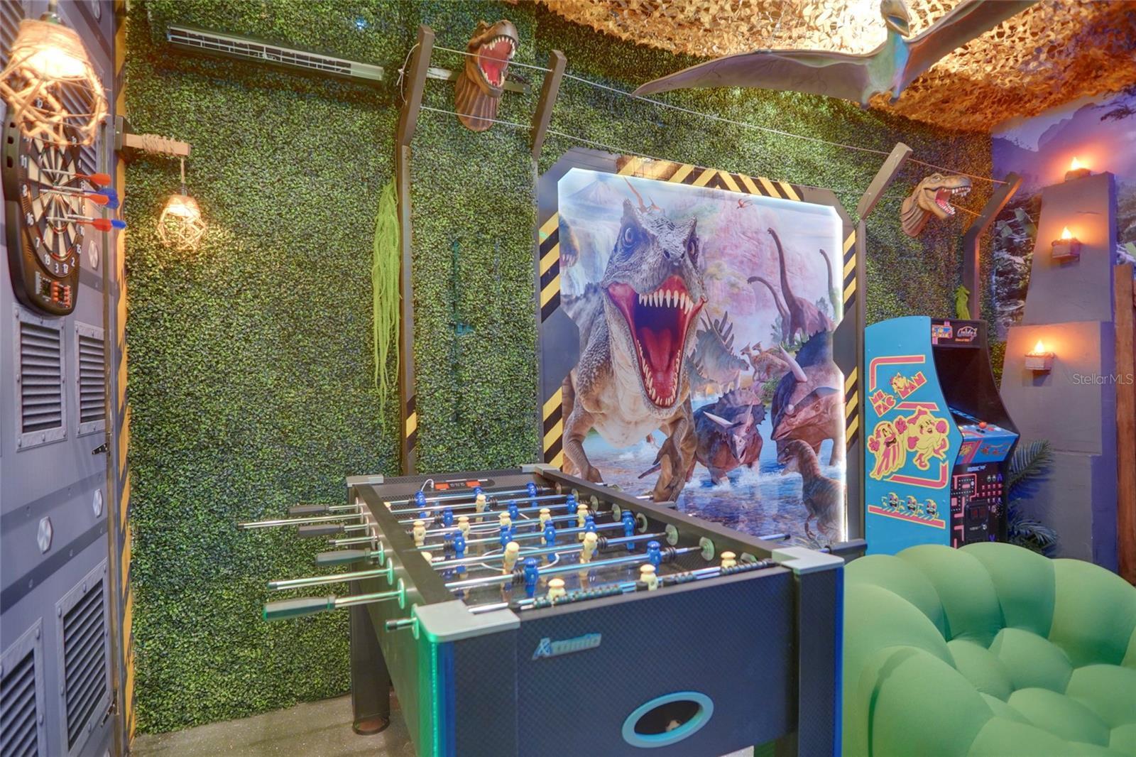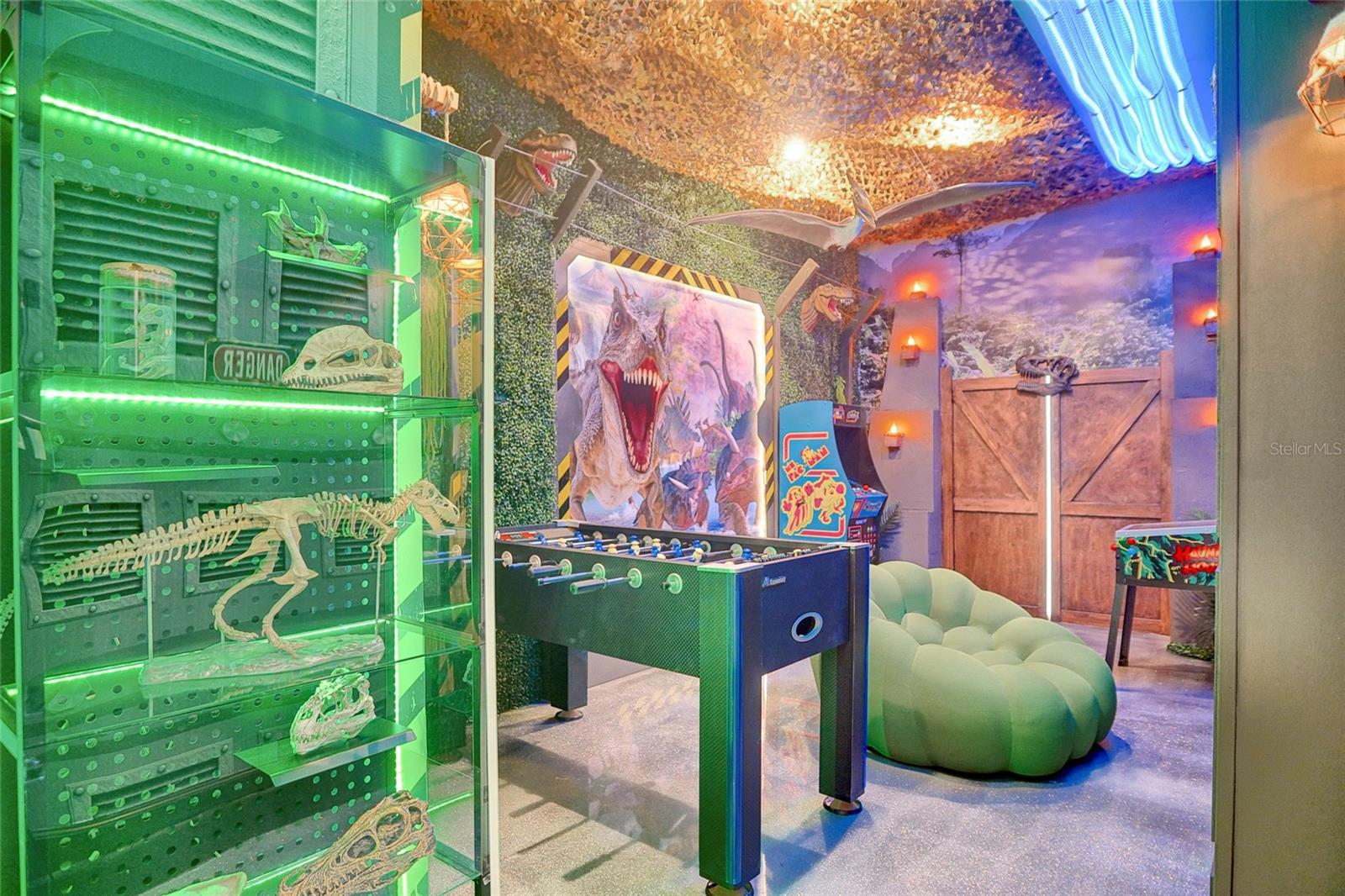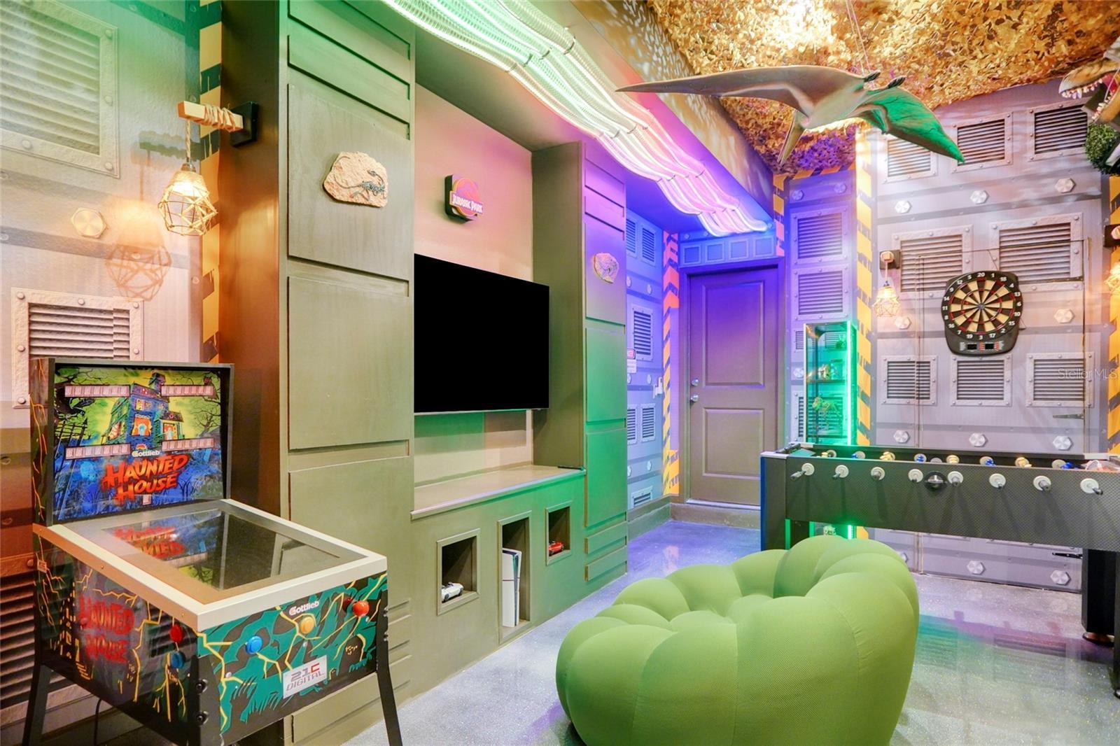 Welcome to a beautifully designed home created for comfort, entertainment, and unforgettable experiences. A grand foyer opens to a bright, open-concept layout ideal for gathering and hosting. The gourmet kitchen features a large island with granite countertops, stainless-steel appliances, a breakfast bar, pantry, and breakfast nook, flowing seamlessly into the living area. Sliding doors lead to a covered lanai and private covered pool, perfect for enjoying the Florida lifestyle. The home has been meticulously decorated with immersive themed rooms, including a Jurassic Park inspired game room and a Mickey-themed loft, creating a fun and memorable experience for family and guests alike. The garage has been converted into a dynamic playroom with multiple activities, making this property especially attractive for short-term rental success. The first-floor owner’s suite offers a peaceful retreat with generous closet space and a spacious en-suite bath with dual sinks. Upstairs, a loft has been thoughtfully converted into an additional bedroom, maximizing space and functionality. Located in Solara Resort, owners and guests enjoy access to a grand clubhouse, fitness center, game rooms, and comfortable lounges, all just minutes from Orlando’s world-famous attractions, shopping, and dining. A turnkey opportunity that blends luxury living, themed entertainment, and exceptional investment potential.