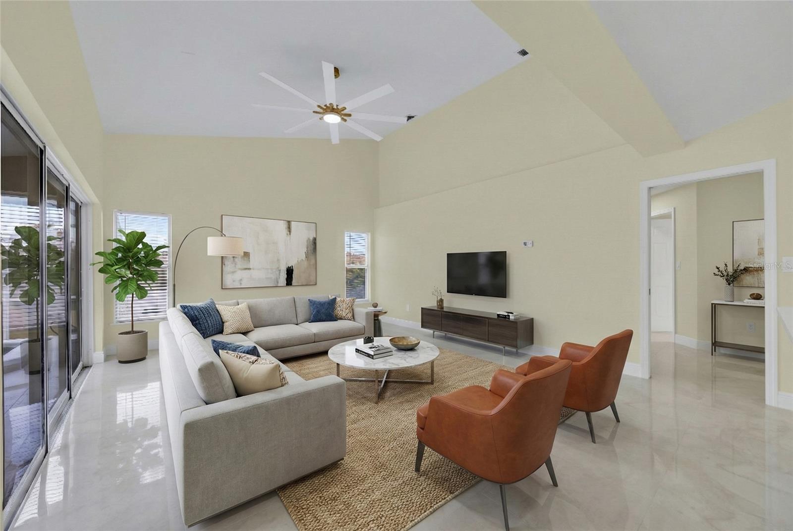 - Ceiling Fans(s), Eat-in Kitchen, High Ceilings, Kitchen/Family Room Combo, Primary Bedroom Main Floor, Vaulted Ceiling(s), Walk-In Closet(s), Window Treatments