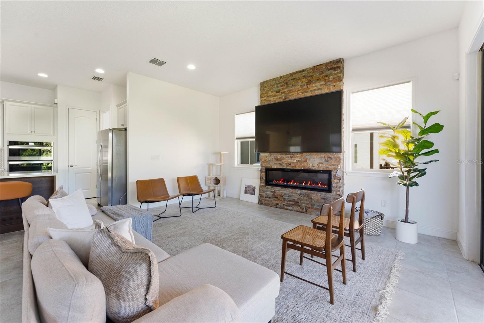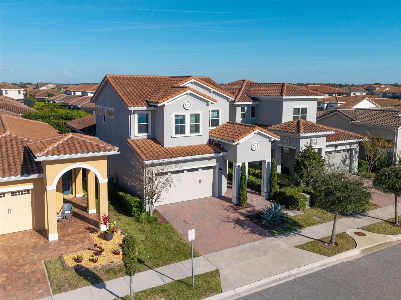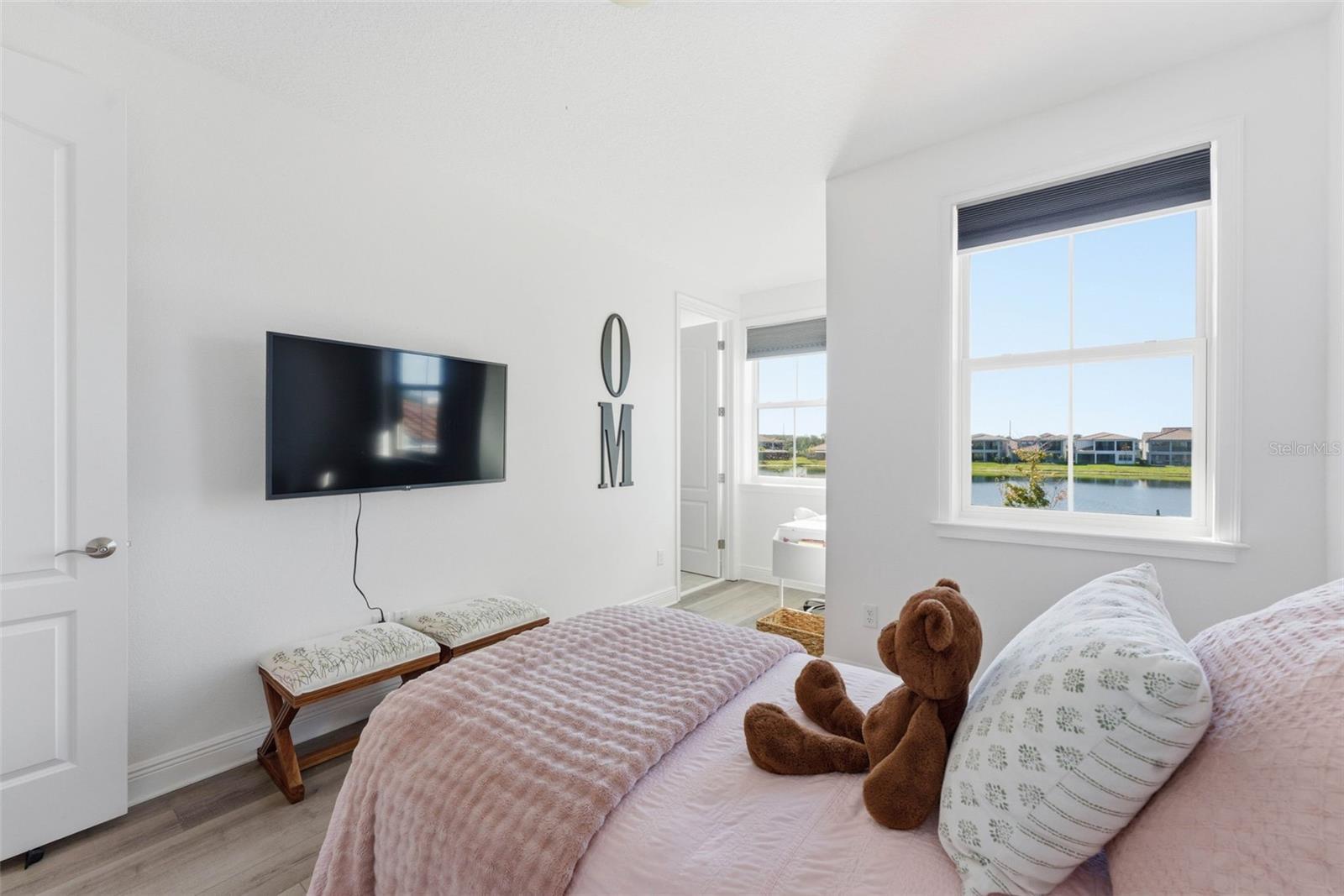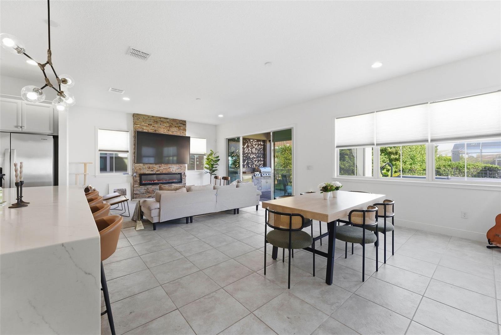 Beautiful home located in the highly desirable Eagle Creek community, featuring 3 bedrooms and 3 bathrooms, filled with upgrades and designed for comfort and sophistication. On the first floor, there is a bedroom with a walk-in closet, ideal for guests or a home office. Upstairs, you’ll find 2 Bedrooms. The primary suite, offering a large and spacious bathroom along with a generous walk-in closet, creating a true retreat. Also on the second floor is another suite, complete with its own walk-in closet and a beautiful water view. The home features carpet only in the closets. The living room showcases ceramic tile flooring, while the second-floor bedrooms include modern vinyl flooring, combining style and easy maintenance. The open and spacious living area is highlighted by a decorative stone accent wall with a built-in fireplace, creating a modern and inviting atmosphere. The gourmet kitchen is a true showstopper, featuring a large quartz island with a waterfall-edge countertop, adding elegance and sophistication to the space. The kitchen also includes a beautiful backsplash, upgraded cabinetry, and built-in microwave and ovens, making it perfect for entertaining. The outdoor area is ideal for relaxation and gatherings, offering a covered patio with motorized screens, a summer kitchen, a heated jacuzzi, and a pleasant garden area. The laundry room is conveniently located near the kitchen and comes equipped with sink, cabinets, and modern Samsung washer and dryer. A spacious garage completes this exceptional home. Located in Lake Nona area, Eagle Creek community, this gated neighborhood offers resort-style amenities, a championship golf course, clubhouse, and an exceptional lifestyle—perfect for families seeking comfort, security, and quality living.
