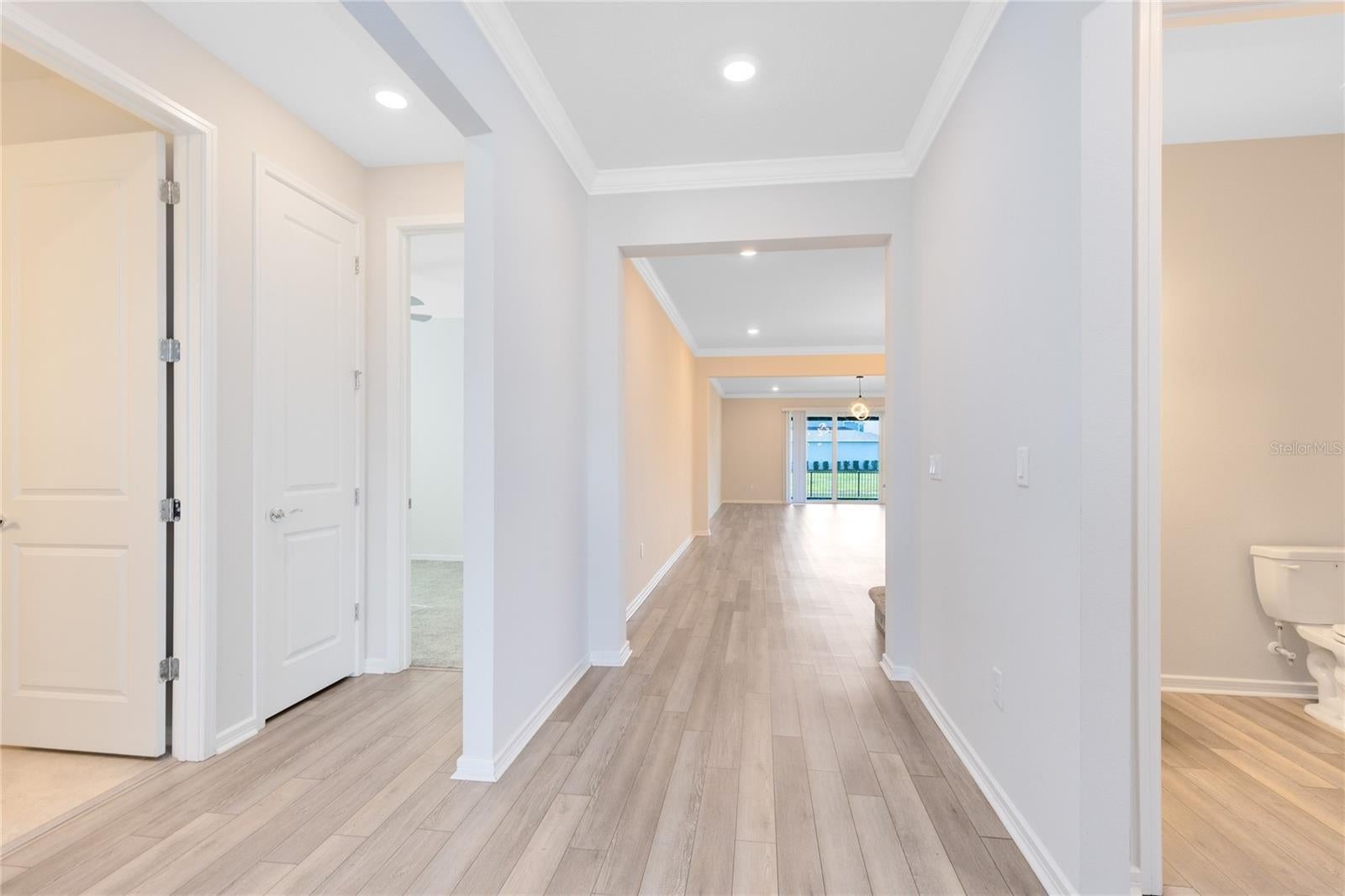 Welcome to this spacious Pulte built home in the gated Isles of Lake Nona community. Built in 2021, this two story residence offers 6 bedrooms, 3 full baths, and 1 half bath across 4,163 square feet, with peaceful pond views and east facing exposure that fills the home with beautiful morning light. The main level features an open layout with tile flooring throughout the primary living areas, crown molding, tray ceilings, and an easy flow between the kitchen, dining, and living spaces. The kitchen is designed for everyday living and entertaining, featuring a large island with breakfast bar, stone countertops, solid wood cabinetry, built in oven, walk in pantry, and a kitchen and family room combo. Sliding doors open to a screened rear porch overlooking the water, creating a seamless indoor outdoor connection. The primary suite is located on the first floor and offers a private retreat with a spacious walk in closet and a spa style ensuite bath with dual vanities, stone counters, and a walk in shower. Three additional first floor bedrooms provide flexible options for guests, home office space, or multi generational living. Upstairs, you will find a large bonus room, a dedicated media room, and two additional bedrooms, both with walk in closets. This level is ideal for recreation, work from home, or guest accommodations. Additional features include a three car attached garage with tandem parking, smart home features, ceiling fans throughout, a fenced yard, irrigation system, and a landscaped lot just under a quarter acre with tranquil pond views. Residents of Isles of Lake Nona enjoy a gated, resort style lifestyle with access to a clubhouse, fitness center, community pool, playgrounds, tennis courts, and sidewalks throughout the neighborhood. Ideally located near Lake Nona, Medical City, Lake Nona Town Center, top rated schools, SR 417, and Orlando International Airport. This home offers space, comfort, and an exceptional location in one of Lake Nona’s most desirable communities. Schedule your private showing today.
