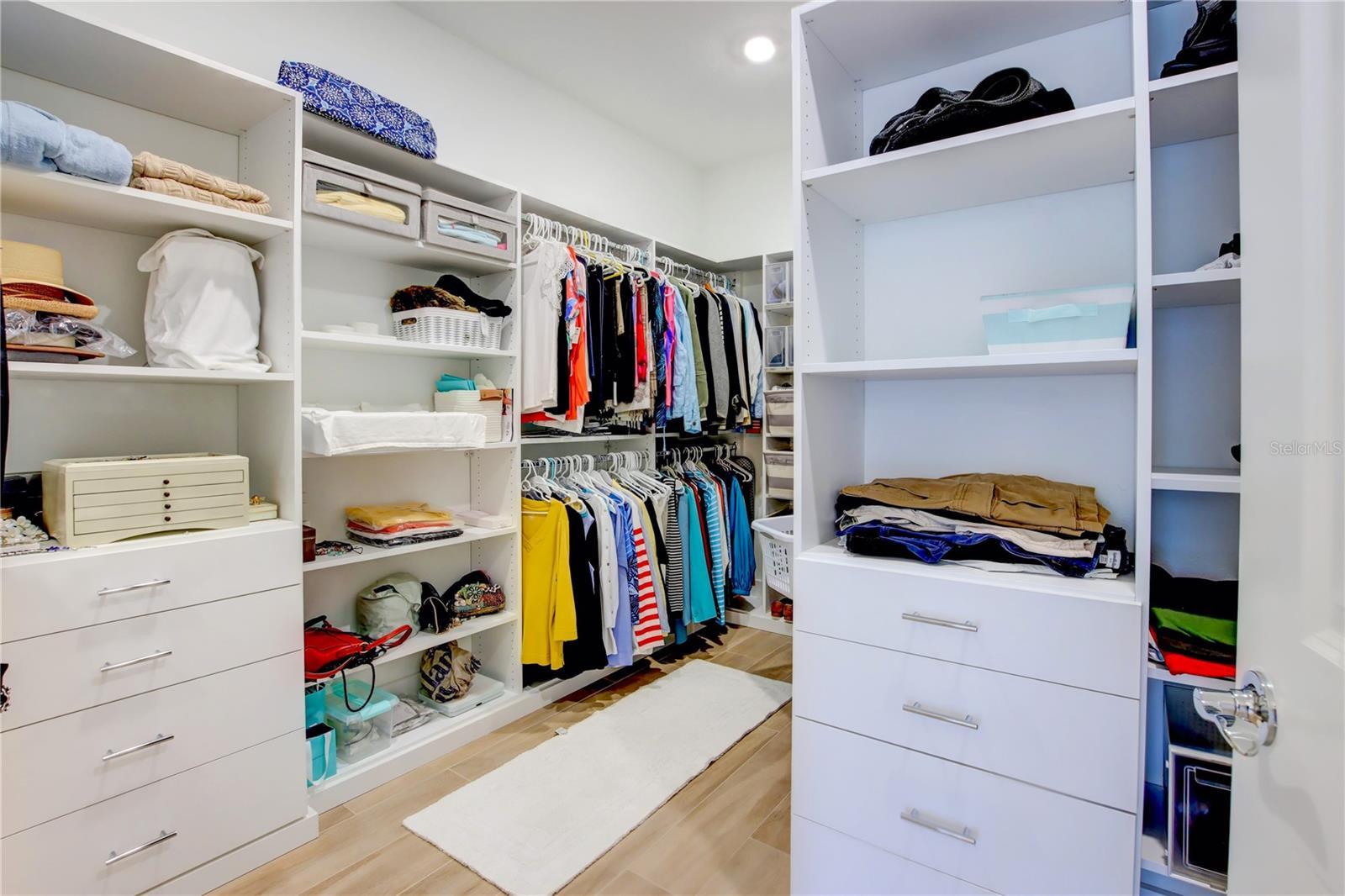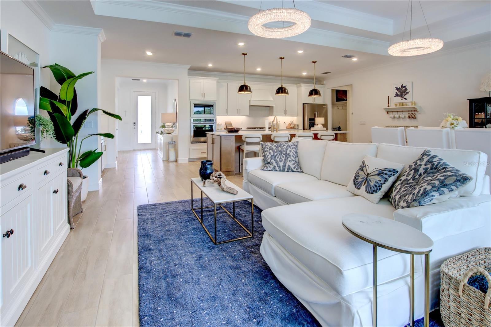 - Built-in Features, Ceiling Fans(s), Coffered Ceiling(s), Crown Molding, Dry Bar, Eat-in Kitchen, In Wall Pest System, Kitchen/Family Room Combo, Living Room/Dining Room Combo, Open Floorplan, Pest Guard System, Primary Bedroom Main Floor, Solid Wood Cabinets, Split Bedroom, Stone Counters, Thermostat, Tray Ceiling(s), Walk-In Closet(s)
