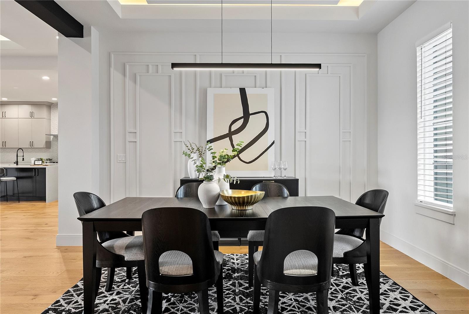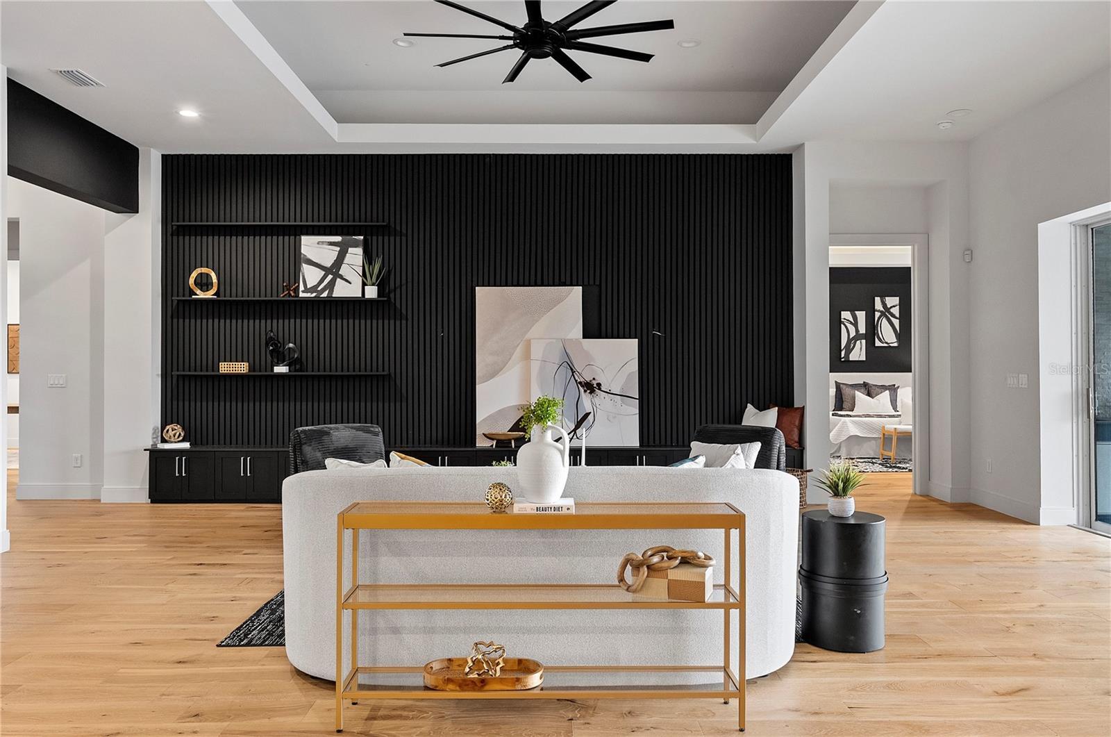- Built-in Features, Eat-in Kitchen, Kitchen/Family Room Combo, Open Floorplan, Primary Bedroom Main Floor, Solid Surface Counters, Solid Wood Cabinets, Split Bedroom, Stone Counters, Thermostat, Tray Ceiling(s), Walk-In Closet(s), Window Treatments