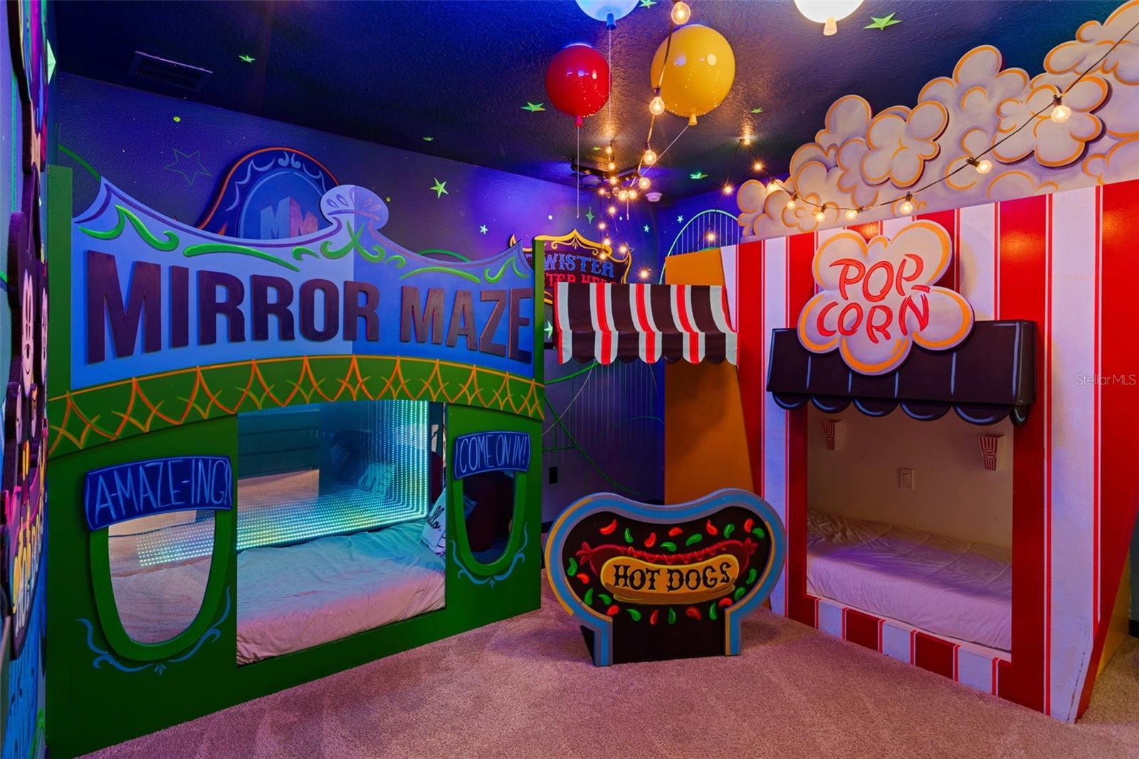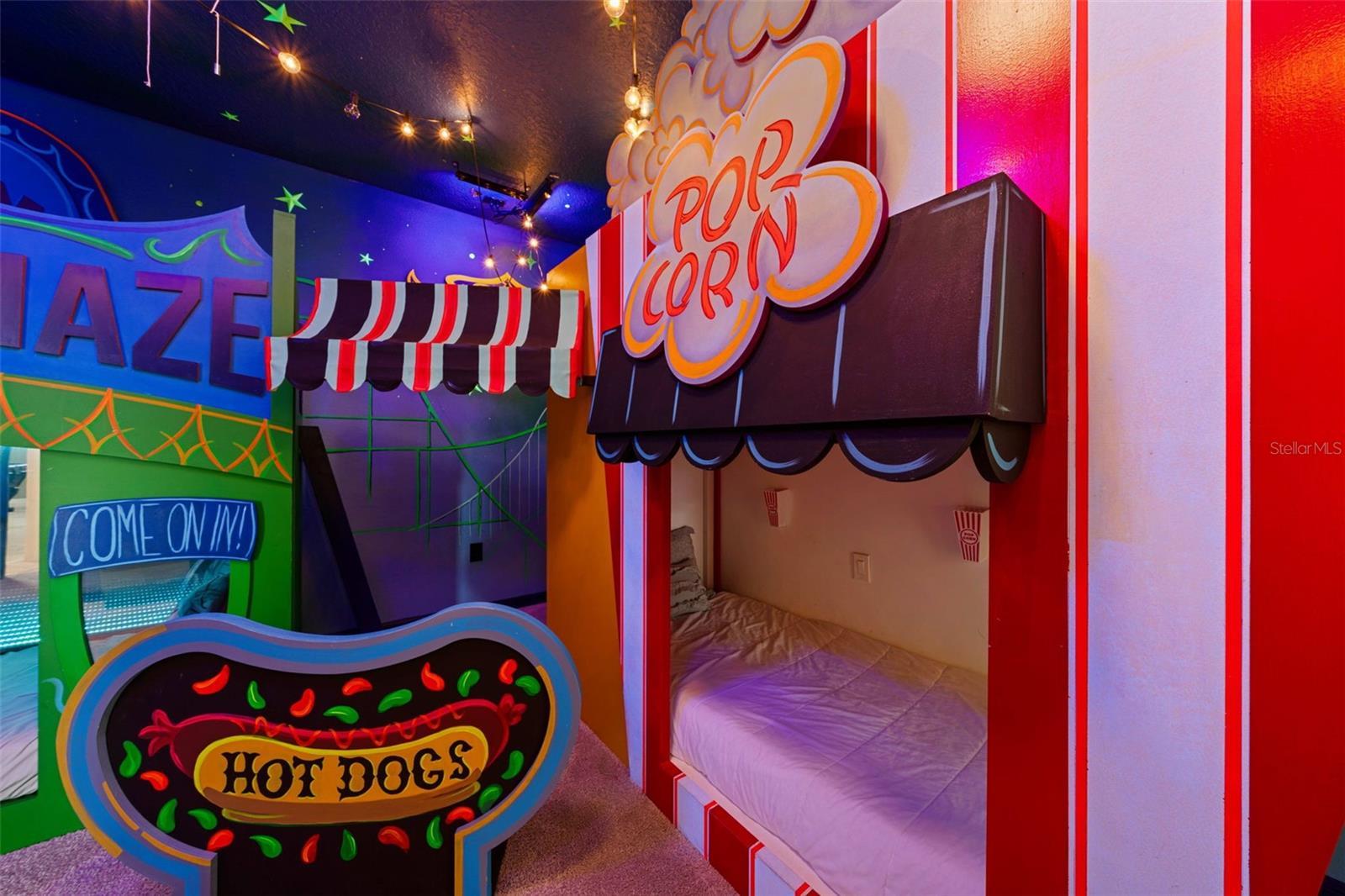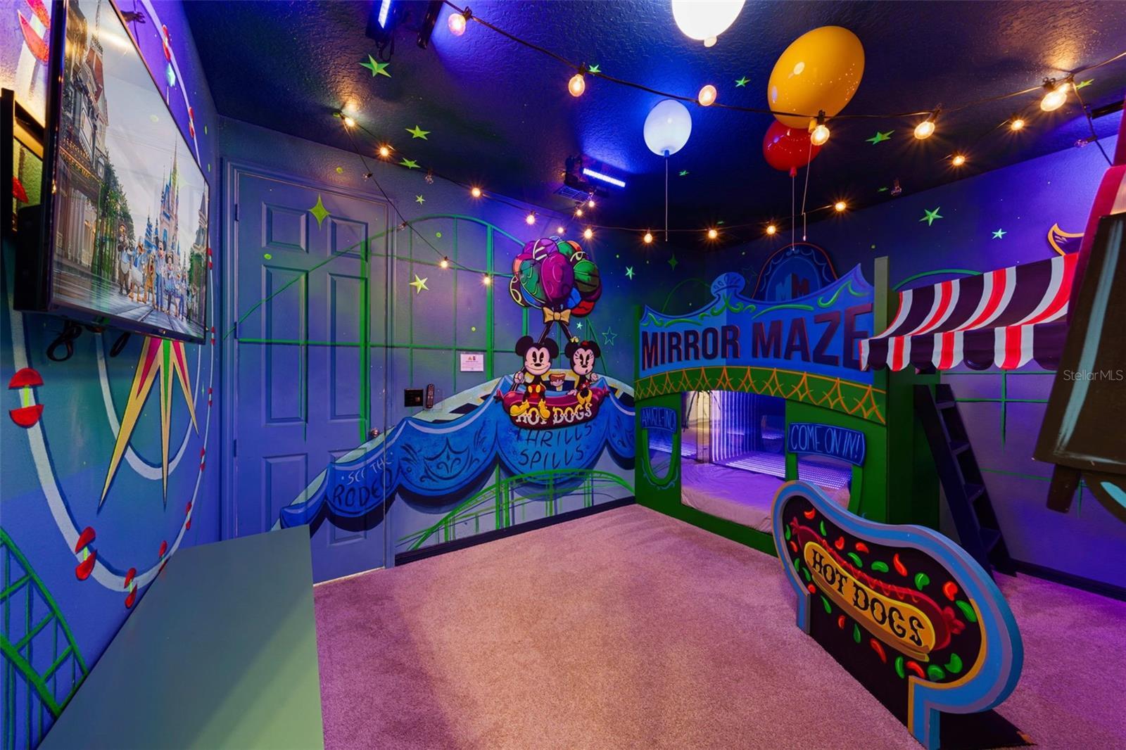 TURNKEY 7-BEDROOM SOLARA RESORT HOME – FULLY FURNISHED Welcome to this stunning 7-bedroom, fully furnished home located in the sought-after Solara Resort community. Designed with both comfort and style in mind, this modern and spacious property offers the perfect blend of relaxation, entertainment, and investment opportunity. The bright, open-concept living area brings together the kitchen, dining, and family room, creating an ideal space for gathering with family and friends. Large sliding doors open to the private screened lanai and pool area, filling the home with natural light and enhancing indoor-outdoor living. The kitchen features stainless steel appliances, granite countertops, bar seating, and ample cabinetry—perfect for casual meals or hosting. The thoughtful layout makes entertaining easy and enjoyable. Two generously sized primary bedrooms are located on the first floor, offering convenience and privacy. Step outside to the spacious lanai with outdoor dining for six, sun loungers, and a charming tiki-style bar. The private pool includes a safety fence, spill-over spa, and a pool bathroom with direct outdoor access—ideal for enjoying Florida’s sunshine year-round. The first floor also includes a themed game room complete with air hockey, foosball, arcade games, and comfortable seating, providing fun for all ages. Upstairs, you’ll find an incredible Superhero-themed bedroom featuring custom twin-over-full bunk beds, multiple TVs, a foam pit, and a slide—truly a guest favorite. An additional upstairs loft offers a pool table, TV, and cozy seating, creating another inviting space to unwind. This home is move-in or rental ready, making it an excellent primary residence, vacation home, or income-producing property. Don’t miss this opportunity to own a beautifully maintained Solara Resort home with exceptional features and strong appeal. Schedule your showing today.