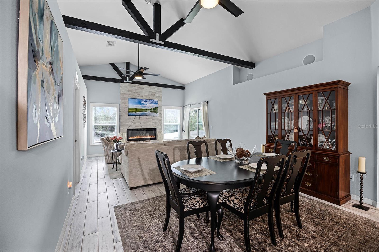 This custom-built home offers 3 spacious bedrooms, 2 full bathrooms, and a one-of-a-kind outdoor kitchen with a stunning fire pit! As you walk in the front door you're greeted by 12-foot high ceilings with wood beams expending wall to wall, luxury wood-like tile flooring, and tons of natural light. This true open concept design allows you to entertain parties of all sizes with the kitchen, dining room, and family room all being together. The kitchen has tons of cabinetry, an abundance of counter space, and stainless steel appliances for all your cooking needs. The grand family room has a custom fireplace with an expansive stone accent wall. This home also offers a true split floor plan design with two bedrooms and 1 full bathroom on the right side of the home and the owner's suite on the back left. The owner's suite has tons of natural light, a large ensuite equipped with dual vanities, a walk-in shower with seamless glass, and high-end wall tile. If you enjoy entertaining or being outdoors this home has a one-of-a-kind outdoor kitchen/fire pit combo and comfy seating surrounding. The outdoor kitchen with custom cabinetry, stainless steel appliances, wine refrigerator, ceiling fans, beautiful wood paneling, stone accents, and turf flooring. The fire pit has seating for 10 and overlooks the oversized backyard. Other features include indoor and outdoor surround sound, custom lighting, and a vinyl fence. The community has lake access on the largest of the Clermont Chain of lakes, Lake Louisa. You're also located in a very established community that's highly desirable while being close to all major highways and minutes from excellent shopping, hospitals, dining, theme parks and so much more. Call me today to schedule a private showing! GROUNDS CARE AND PEST CONTROL INCLUDED IN THE RENT.