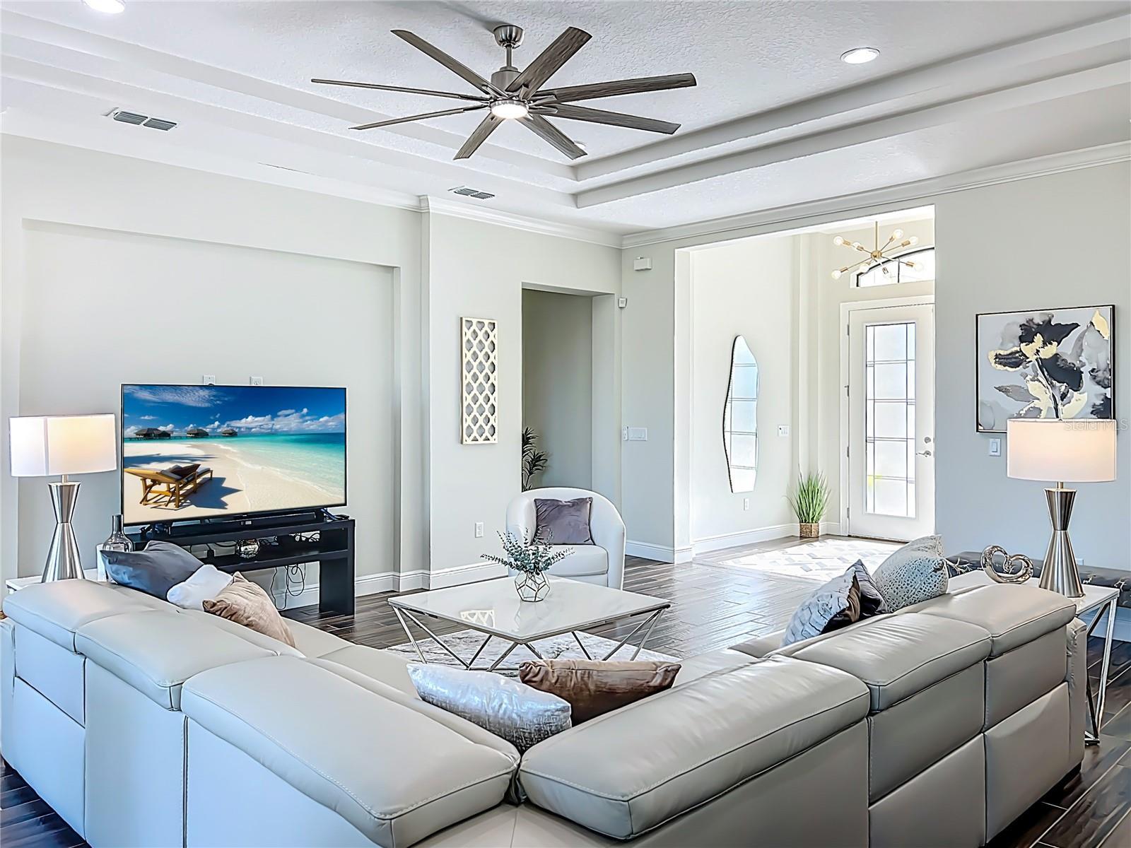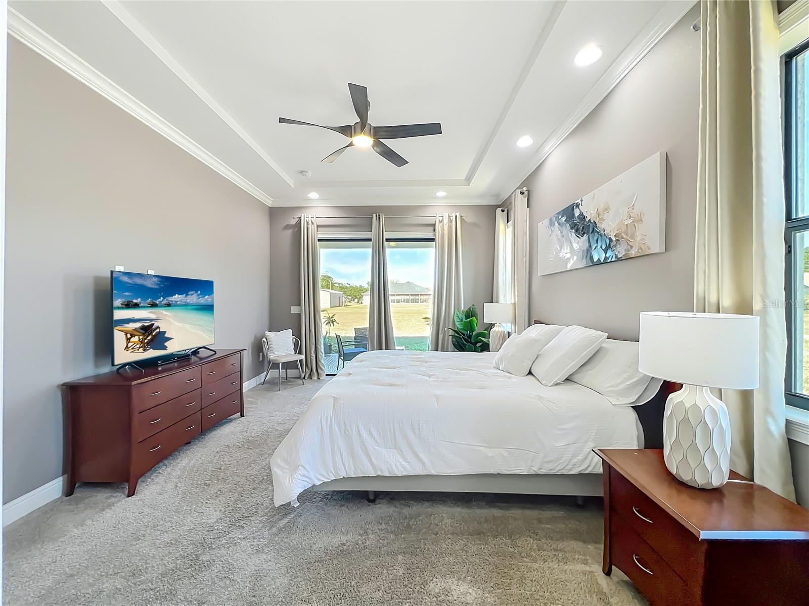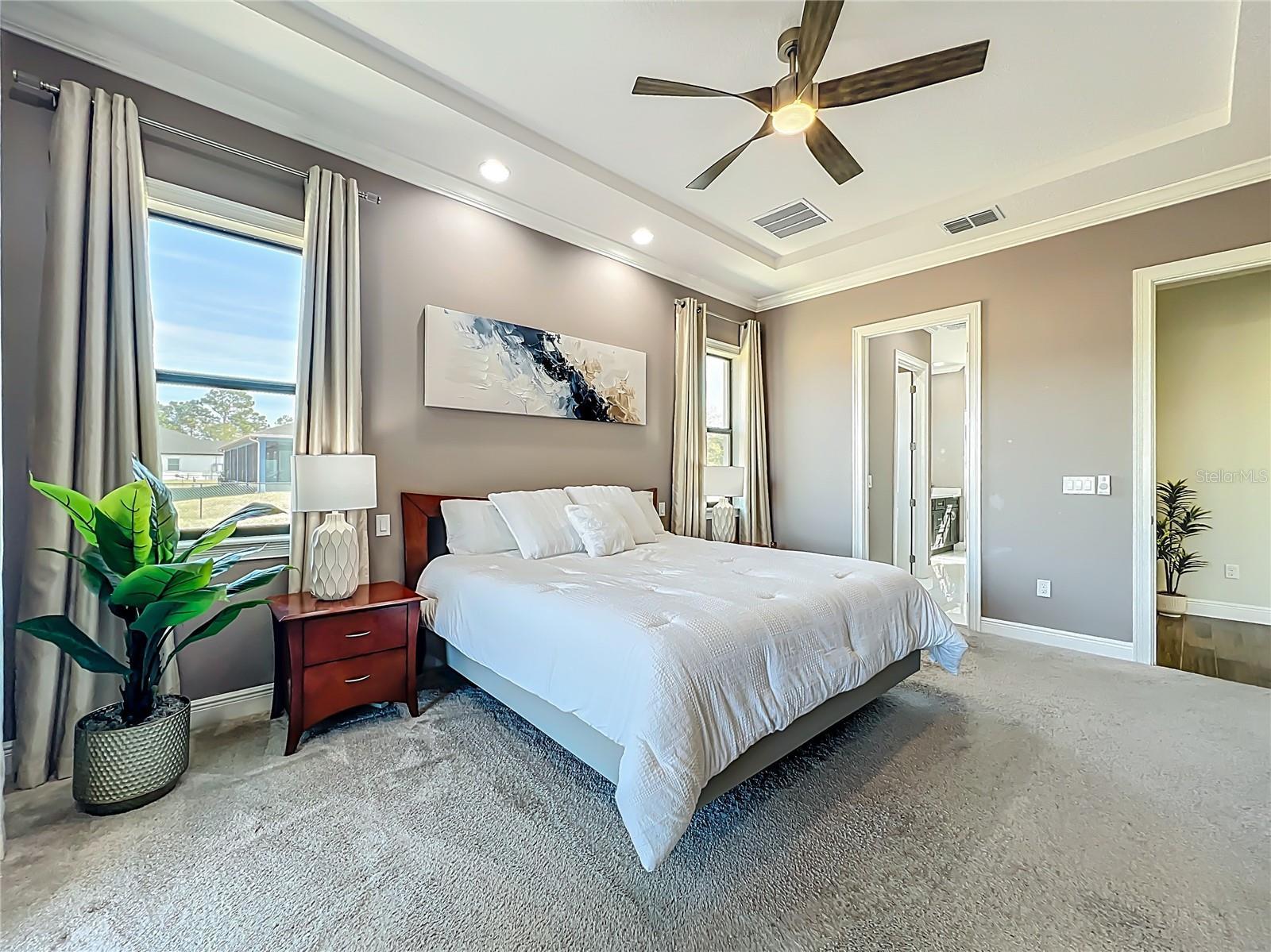 - Cathedral Ceiling(s), Ceiling Fans(s), Crown Molding, High Ceilings, Open Floorplan, Primary Bedroom Main Floor, Split Bedroom, Thermostat, Walk-In Closet(s)