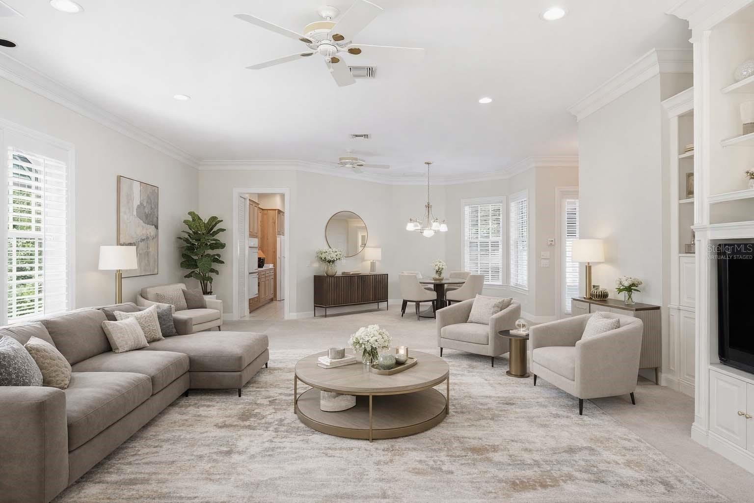 - Built-in Features, Ceiling Fans(s), Crown Molding, Eat-in Kitchen, High Ceilings, Living Room/Dining Room Combo, Primary Bedroom Main Floor, Thermostat, Walk-In Closet(s), Window Treatments