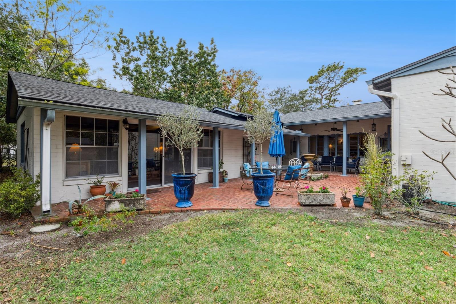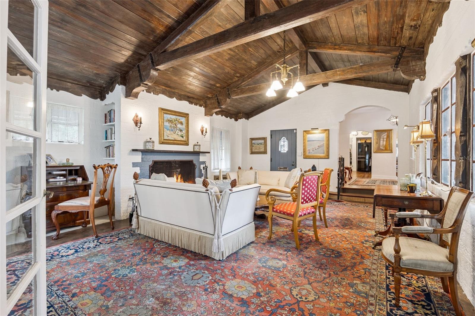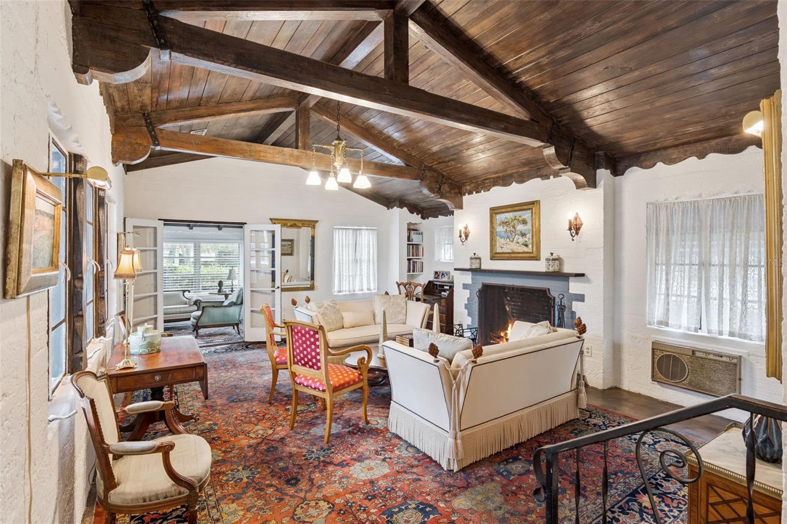 Set on over half an acre in Winter Park’s coveted Orwin Manor, this 1935 French Provincial estate offers a rare blend of architectural character, modern system updates, and extraordinary future potential. The property offers the unique opportunity to own an estate in a beautifully historic Winter Park neighborhood. Whether thoughtfully renovated, expanded, or reimagined, this property stands as a truly special opportunity in one of Winter Park’s most desirable neighborhoods. A charming brick path leads to a welcoming covered front porch and into a light-filled living room featuring original cypress beams with iron strapping, vaulted ceilings, and a dramatic fireplace crowned by the home’s original bronze chandelier. Glass doors open to a delightful sunroom and a central hallway with abundant storage, and a convenient half bath. The private primary suite is tucked away and offers a peaceful retreat with vaulted ceilings, ceiling fan, wood floors, a wall of closets, and a newly renovated 2023 bath featuring an oversized deep soaking tub and marble vanity. A second ensuite bedroom includes a designer bath with a large glass shower, rain head, and wand. An oversized third bedroom—currently used as a family room—features a vaulted tongue-and-groove ceiling with beams, a walk-in closet, and glass sliders opening to the brick patio and expansive grounds. The dining room and breakfast area flow seamlessly to outdoor living spaces, creating an effortless indoor-outdoor connection. The renovated kitchen includes a farmhouse sink, gas cooking, butcher block countertops, and access to a private walled rose garden and extensive parking options. A newly covered kitchen entrance with custom terrazzo flooring with inset marble pattern leads to a laundry room and versatile studio or workshop with built-ins. Throughout the home, an abundance of windows frames peaceful green views and fills the space with natural light. Outdoors, enjoy raised garden beds, multiple brick patios with fountains, ceiling fans, and partial coverings—perfect for entertaining or quiet reflection. Separate outbuilding is dry, plumbed and wired with a workshop, a large storage space ideal for future ADU and 2-car carport. With major system improvements already completed and an oversized lot offering flexibility for renovation, expansion, new construction, or potential lot division (buyer to verify), this is a legacy property with limitless possibilities. Major system improvements include a 2021 roof & tankless water heater, full re-plumb in 2023, replacement of all major under-home trusses, three updated electrical panels, two HVAC systems (2014 & 2019), providing modern efficiency while preserving the home’s original character. See MLS#O6374414