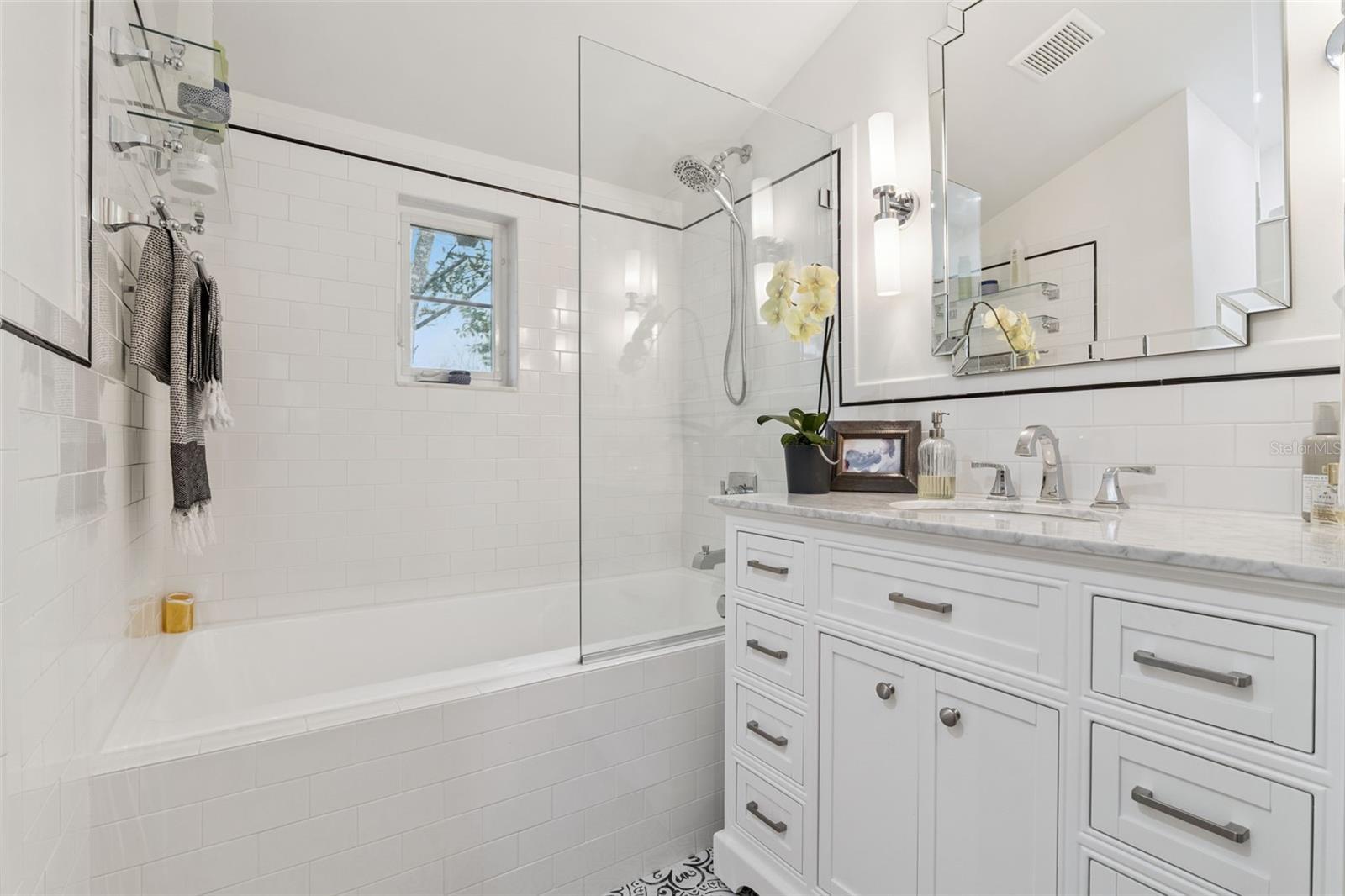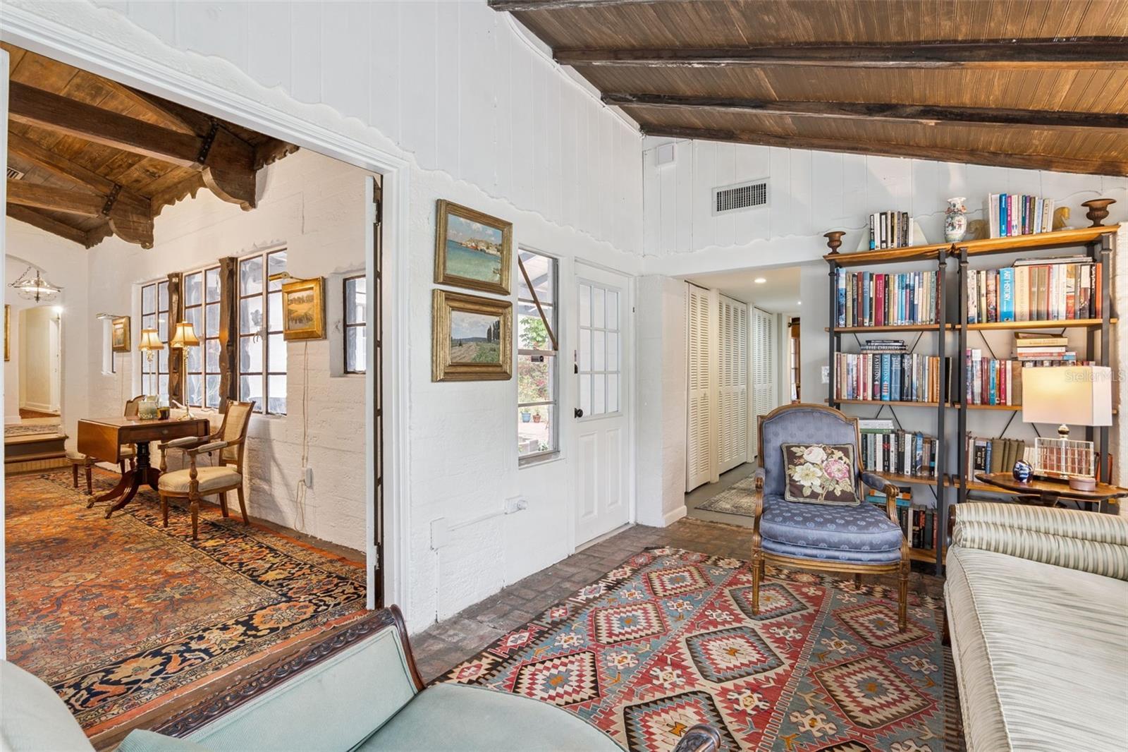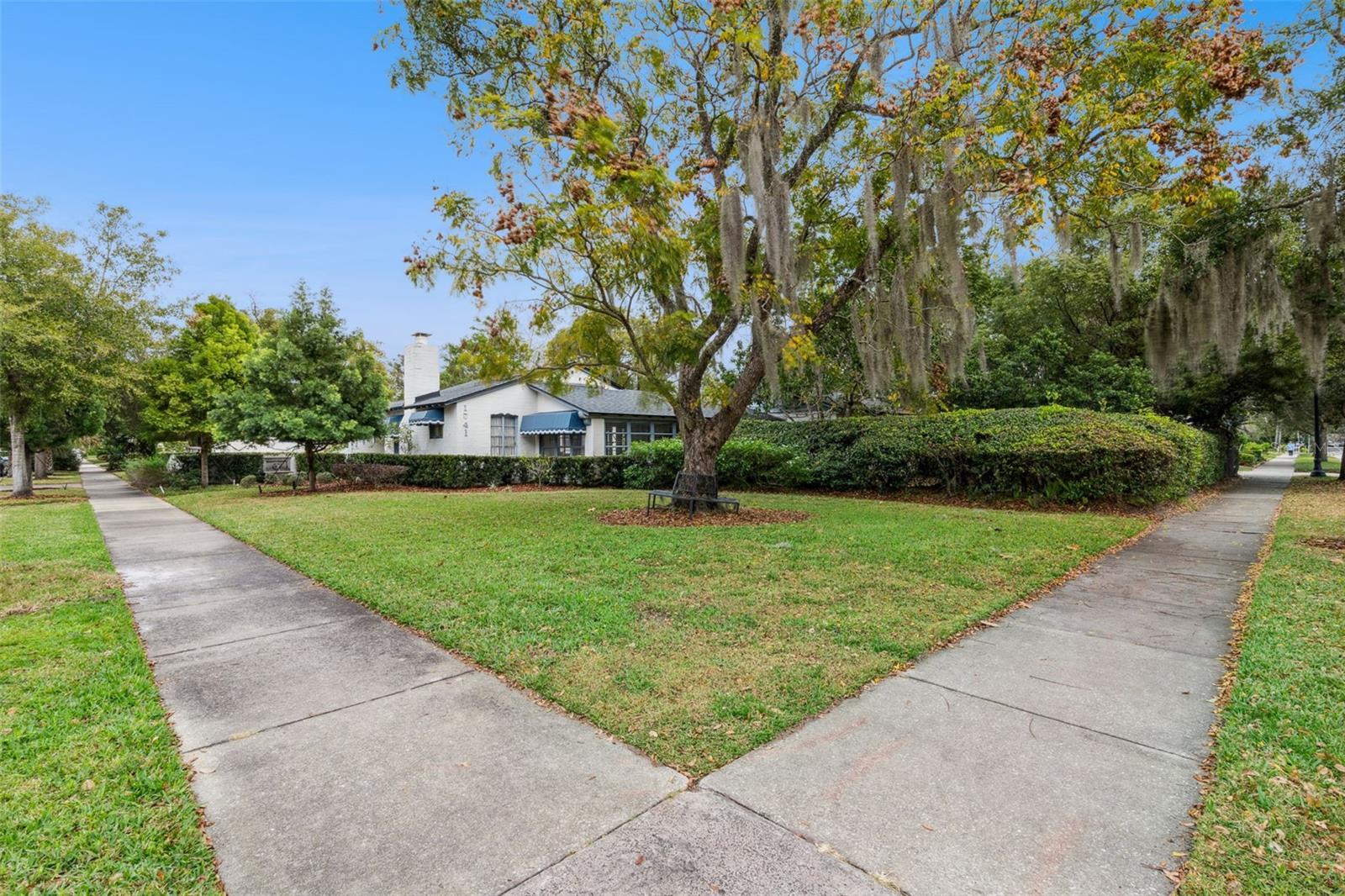 Set on over half an acre in Winter Park’s coveted Orwin Manor, this 1935 French Provincial estate offers a rare blend of architectural character, modern system updates, and extraordinary future potential. The property offers the unique opportunity to own an estate in a beautifully historic Winter Park neighborhood. Whether thoughtfully renovated, expanded, or reimagined, this property stands as a truly special opportunity in one of Winter Park’s most desirable neighborhoods. A charming brick path leads to a welcoming covered front porch and into a light-filled living room featuring original cypress beams with iron strapping, vaulted ceilings, and a dramatic fireplace crowned by the home’s original bronze chandelier. Glass doors open to a delightful sunroom and a central hallway with abundant storage, and a convenient half bath. The private primary suite is tucked away and offers a peaceful retreat with vaulted ceilings, ceiling fan, wood floors, a wall of closets, and a newly renovated 2023 bath featuring an oversized deep soaking tub and marble vanity. A second ensuite bedroom includes a designer bath with a large glass shower, rain head, and wand. An oversized third bedroom—currently used as a family room—features a vaulted tongue-and-groove ceiling with beams, a walk-in closet, and glass sliders opening to the brick patio and expansive grounds. The dining room and breakfast area flow seamlessly to outdoor living spaces, creating an effortless indoor-outdoor connection. The renovated kitchen includes a farmhouse sink, gas cooking, butcher block countertops, and access to a private walled rose garden and extensive parking options. A newly covered kitchen entrance with custom terrazzo flooring with inset marble pattern leads to a laundry room and versatile studio or workshop with built-ins. Throughout the home, an abundance of windows frames peaceful green views and fills the space with natural light. Outdoors, enjoy raised garden beds, multiple brick patios with fountains, ceiling fans, and partial coverings—perfect for entertaining or quiet reflection. Separate outbuilding is dry, plumbed and wired with a workshop, a large storage space ideal for future ADU and 2-car carport. With major system improvements already completed and an oversized lot offering flexibility for renovation, expansion, new construction, or potential lot division (buyer to verify), this is a legacy property with limitless possibilities. Major system improvements include a 2021 roof & tankless water heater, full re-plumb in 2023, replacement of all major under-home trusses, three updated electrical panels, two HVAC systems (2014 & 2019), providing modern efficiency while preserving the home’s original character. See MLS#O6374414