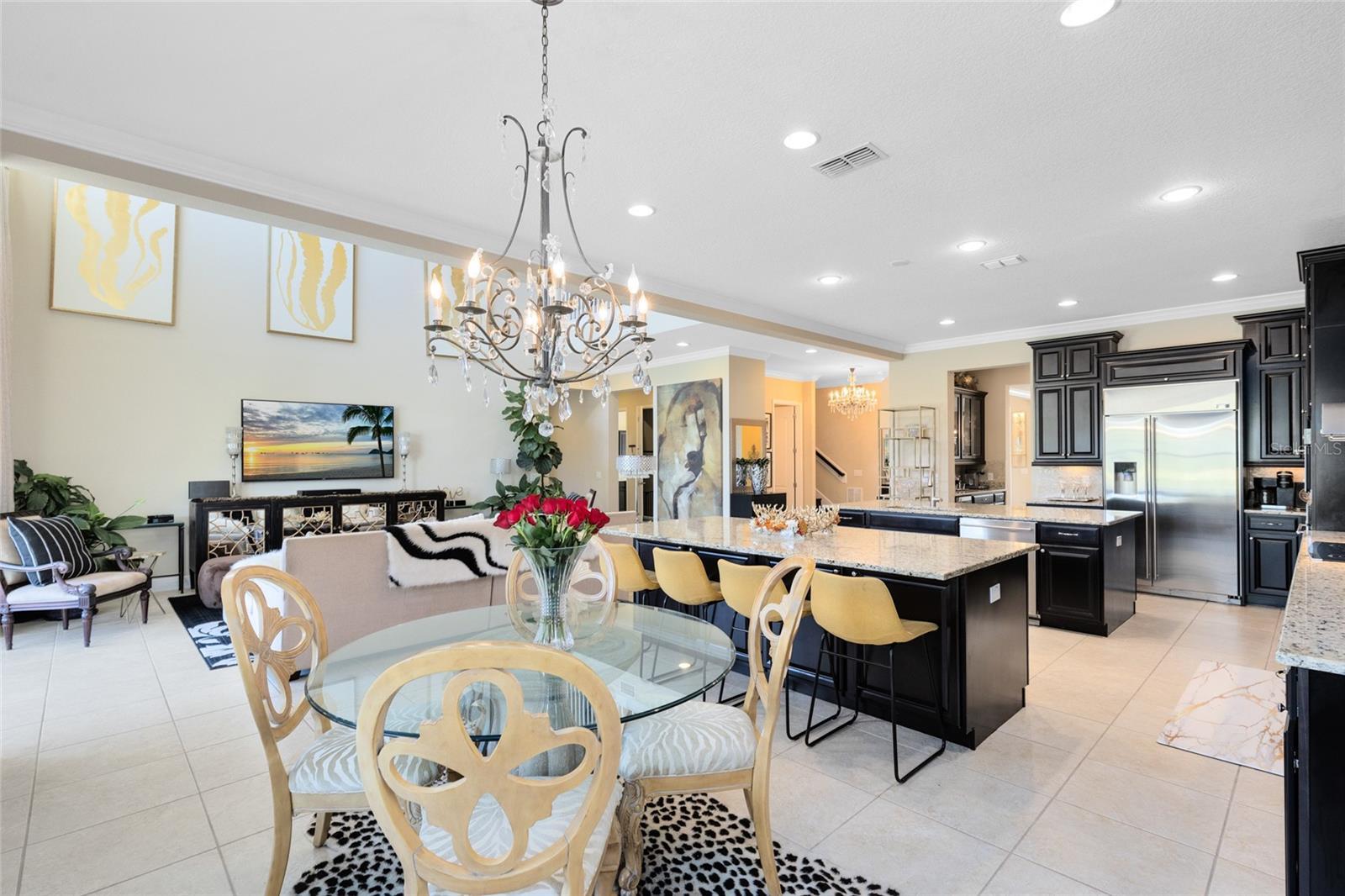 - Built-in Features, Ceiling Fans(s), Crown Molding, Dry Bar, Eat-in Kitchen, High Ceilings, Kitchen/Family Room Combo, Living Room/Dining Room Combo, Open Floorplan, Primary Bedroom Main Floor, Solid Wood Cabinets, Split Bedroom, Stone Counters, Thermostat, Tray Ceiling(s), Walk-In Closet(s), Window Treatments