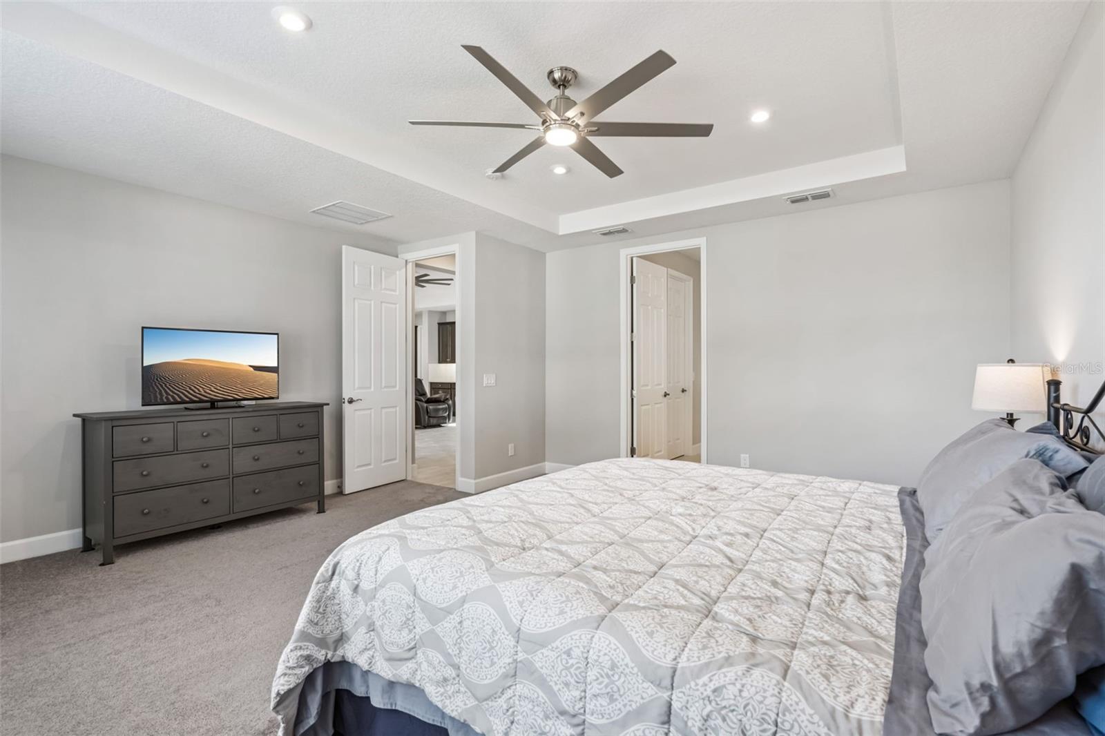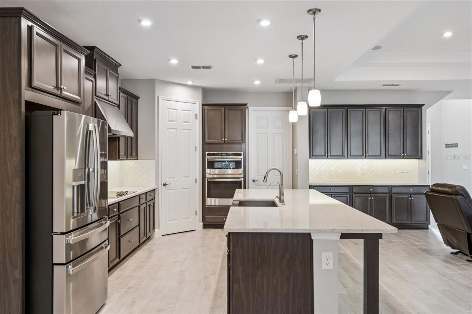 Welcome to this stunning two-story Tortola floor plan by Taylor Morrison, ideally located in the gated community of Lakeview Preserve in Winter Garden. Perfectly positioned on an oversized 75-foot-wide corner homesite with no rear neighbors, this home offers exceptional privacy, beautiful rear views, and a welcoming front porch that sets the tone from the moment you arrive. The elegant double-door entry opens to a dramatic two-story foyer featuring porcelain tile flooring and a staircase accented with open spindles and upgraded iron balusters. Throughout both the first and second floors, 9-foot ceilings and 8-foot doors enhance the home’s open, airy feel and upscale architectural presence. This thoughtfully designed residence offers five bedrooms and four-and-a-half baths, including two private ensuite bedrooms, making it ideal for multigenerational living or hosting guests with comfort and privacy. The spacious family room impresses with a double tray ceiling, surround sound system, additional LED lighting, ceiling fans, and blinds, thoughtful upgrades that make this home truly move-in ready. Designed for those who love to cook and entertain, the gourmet kitchen is a showstopper, featuring rich dark wood–tone cabinetry beautifully contrasted by quartz countertops and a striking backsplash. Stainless steel appliances, a cooktop with pot filler, farmhouse sink, and an elegant island with three pendant lights complete the space. Abundant additional cabinetry and counter space provide excellent everyday functionality while serving perfectly as a buffet or servery for holiday gatherings and special occasions. Disappearing sliding glass doors open to the extended screened-in lanai, seamlessly blending indoor and outdoor living and creating the ideal setting to enjoy Florida’s lifestyle year-round. In addition to the primary suite, the first floor offers a private ensuite bedroom, thoughtfully designed with its own full bath which is ideal for guests, extended family, multigenerational living, or a luxurious home office suite. The large primary suite, conveniently located on the first floor, features a tray ceiling and a spa-inspired bath with quartz countertops, framed mirrors, and a beautifully tiled shower with a built-in bench. Additional highlights include a built-in drop zone, a large laundry room with double sinks, and a three-car garage configuration consisting of a two-car garage plus a separate single-car garage, offering an abundance of garage parking and generous driveway space. Upstairs, the secondary bedrooms provide privacy, comfort, and versatility, including a second ensuite bedroom, making this home exceptionally well-suited for guests or family. Completing the upper level is a spacious game room or additional family room, offering flexible living space ideal for movie nights, a play area, or a casual retreat. Residents of Lakeview Preserve enjoy outstanding community amenities including a resort-style pool, park, playground, fitness center, and walking trails. This exceptional home delivers elegant design, thoughtful upgrades, flexible living spaces, and a beautiful setting within one of Winter Garden’s most desirable gated communities. WELCOME HOME!