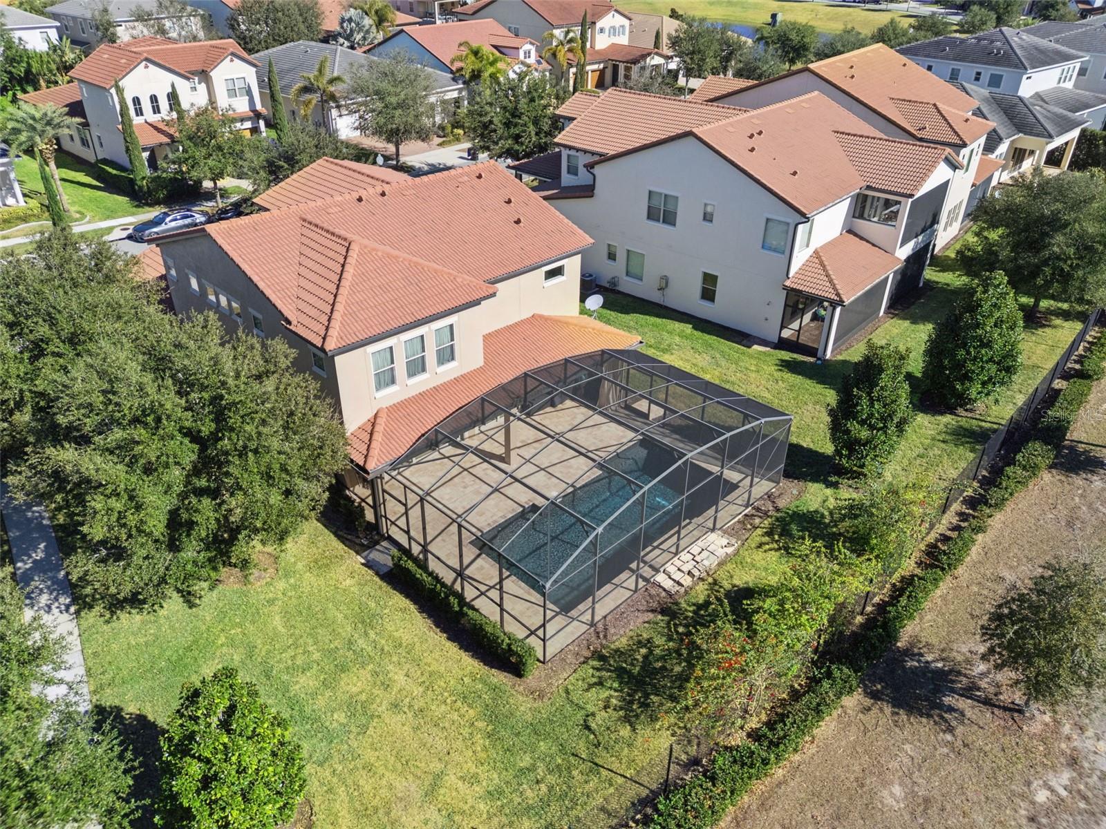 One or more photo(s) has been virtually staged. Experience refined Florida living in this elegant Toll Brothers built residence, perfectly located on a premium corner homesite in the sought-after Lakeshore Preserve community. Distinguished by its Tuscan elevation, stone accents, and barrel tile roof, this 4-bedroom, 3.5-bath pool home offers timeless curb appeal and thoughtfully designed living spaces. Inside, soaring ceilings, crown molding, and upscale finishes create an inviting yet sophisticated atmosphere. Designed for seamless entertaining, the open-concept kitchen, living, and dining areas are filled with natural light and enhanced by six oversized sliding glass doors that extend the living space outdoors. The gourmet kitchen is the heart of the home, featuring an impressive 14’ center island, upgraded KitchenAid appliances, abundant cabinetry, walk-in pantry, and a built-in storage/mudroom. Outdoors, enjoy a 39’ x 8’ covered lanai overlooking a saltwater pool added in 2021, complemented by extensive paver decking and an expansive screened enclosure—creating a refined outdoor living space ideal for alfresco dining and entertaining. Enjoy the soothing sounds provided by the waterfall pool feature! The first floor includes a flexible bedroom currently used as an office with an adjacent powder room. Upstairs, a spacious bonus loft provides separation and privacy, leading to the luxurious owner’s suite with dual walk-in closets and a spa-inspired bath offering double vanities, soaking tub, frameless glass shower, and private water closet. Two additional bedrooms—one with ensuite bath—along with a full laundry room complete the upper level. Energy-efficient features include double-pane Low-E windows, gas cooktop and dryer, and a tankless water heater. Community fees include lawn care, internet, cable, and access to resort-style amenities such as a clubhouse, pool, fitness center, playgrounds, dog park, firepit and kayak launch. Ideally located in Horizon West, close to shopping, dining, hospitals, schools, and major highways—with Disney parks just minutes away—this home offers the perfect balance of luxury, lifestyle, and convenience.