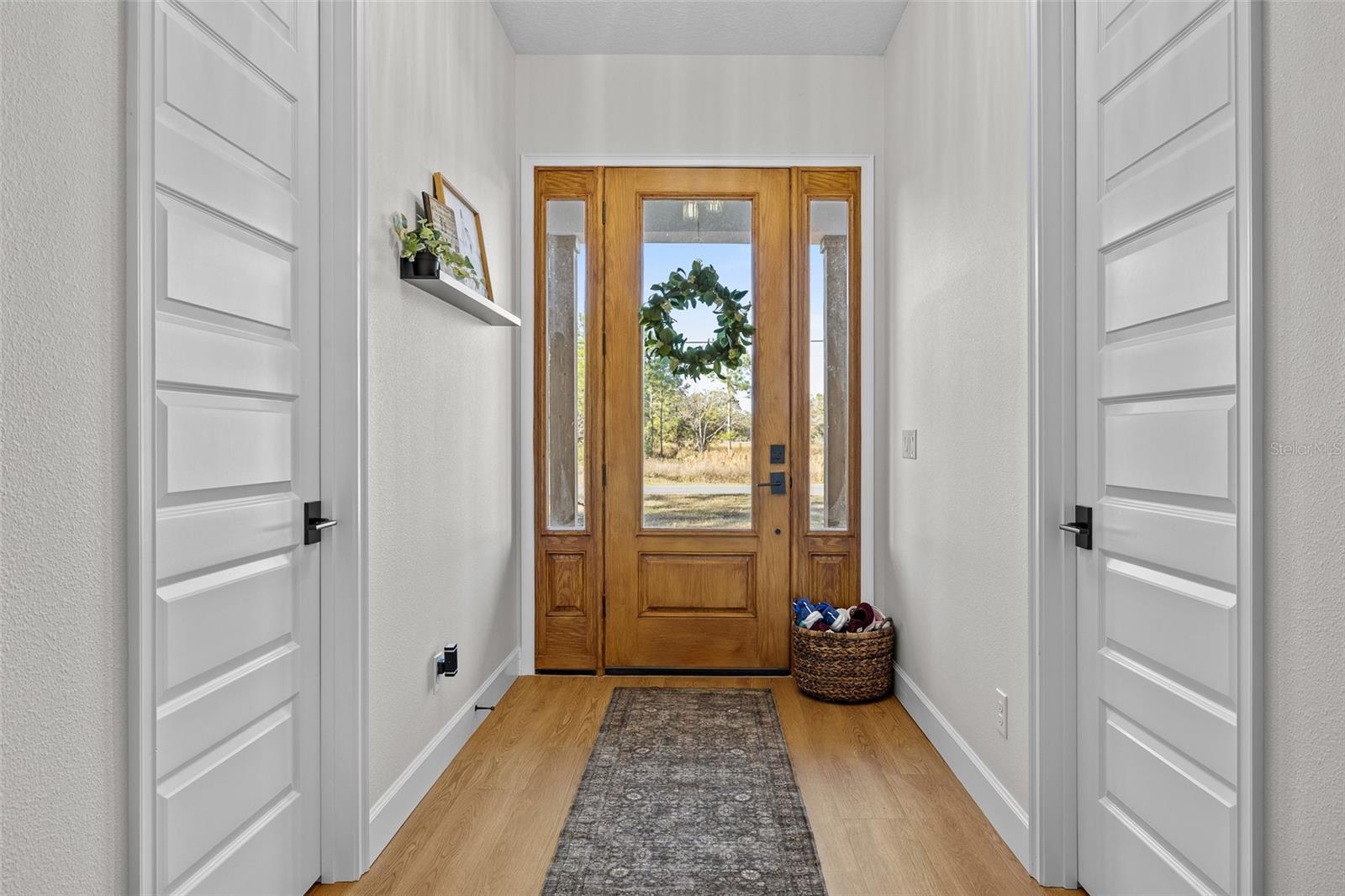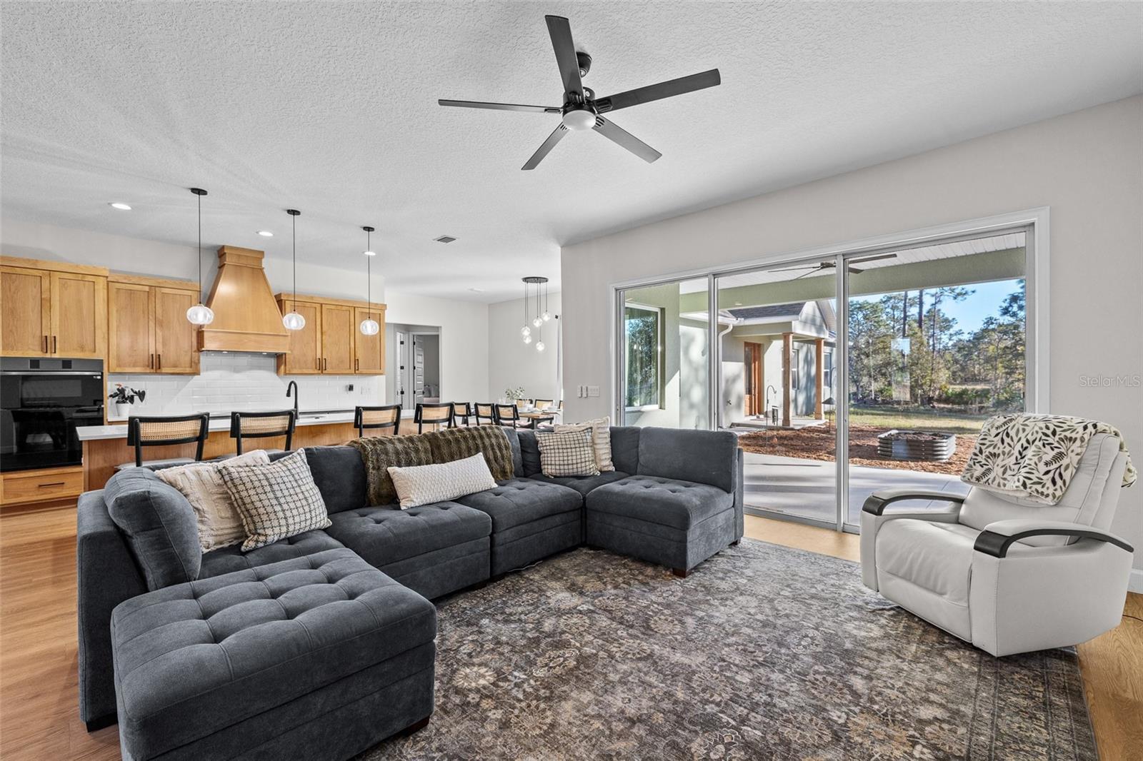 One or more photo(s) has been virtually staged. Discover serene, no-HOA country living on Orange County’s peaceful eastern edge—surrounded by nature and acreage, yet just 18 miles to Orlando International Airport (MCO), 31 miles to Walt Disney World and theme parks, 39 miles to Cocoa Beach, and 32 miles to Kennedy Space Center. Families love the top-rated schools: Wedgefield School (K-8) with an ‘A’ grade and 8/10 GreatSchools rating, plus East River High with a ‘B’ grade. Enter the bright foyer with high ceilings, leading to flex spaces: a spacious office/gym/bonus room on the left with fan, TV, and luxury vinyl flooring; a full guest bath on the right with vanity, shower, and luxury vinyl. The open-concept kitchen-great room features nearly new Samsung appliances (four-door fridge, built-in oven/microwave, cooktop, hood, dishwasher), granite counters, island seating, eat-in bar, formal dining for 10 with chandelier, wall-mounted TV, fan, luxury vinyl floors, 10-ft ceilings, 8-ft doors, and 13-ft sliders to a truss-covered back porch. This 5-bed, 4-full-bath, 2-half-bath home (expandable to 7 beds) has luxury vinyl flooring main areas (carpet in beds). The oversized primary suite includes dual vanities, standalone tub, double shower, tiled walls, water closet, 7x5-ft shower, 8x10-ft walk-in closet, fan, and TV. Additional bedrooms include king-sized potential, walk-ins, and Jack-and-Jill baths. Upstairs loft (potential 7th bed) has fan, half bath (room for full conversion), built-in shelving, and 225-sq-ft finished storage with wood floors and mechanical room. Luxuries include two full kitchens (main and in-law suite), two laundry rooms (main with Electrolux washer-dryer, counters, sink; suite with stacked unit and private heater), three extra wall-mounted TVs (total four), fans everywhere, and curtains on all windows. Furnishings negotiable outside price. The mother-in-law suite has private entry/patio, living room with two fans and TV, massive kitchen (20-ft counters, appliances, walk-in pantry), full laundry with storage/exit, oversized primary bed with carpet, fan, TV, en suite (dual vanities, handicap-accessible toilet/shower), and huge walk-in closet. Ideal for family, guests, or income. Outside: 8x32-ft front porch under truss, spacious back porch with fire pit, 751-sq-ft four-car garage with golf cart space, tandem parking, openers, epoxy floors, cabinets, scenic canal views, mature landscaping, and acreage for hobbies. Energy-efficient with insulating foam throughout for extreme savings, move-in ready with premium finishes—no HOA means freedom for families, or multi generational families near golf, shopping, attractions, and Hal Scott Preserve. Schedule your showing today—contact for details. Don’t miss this gem!