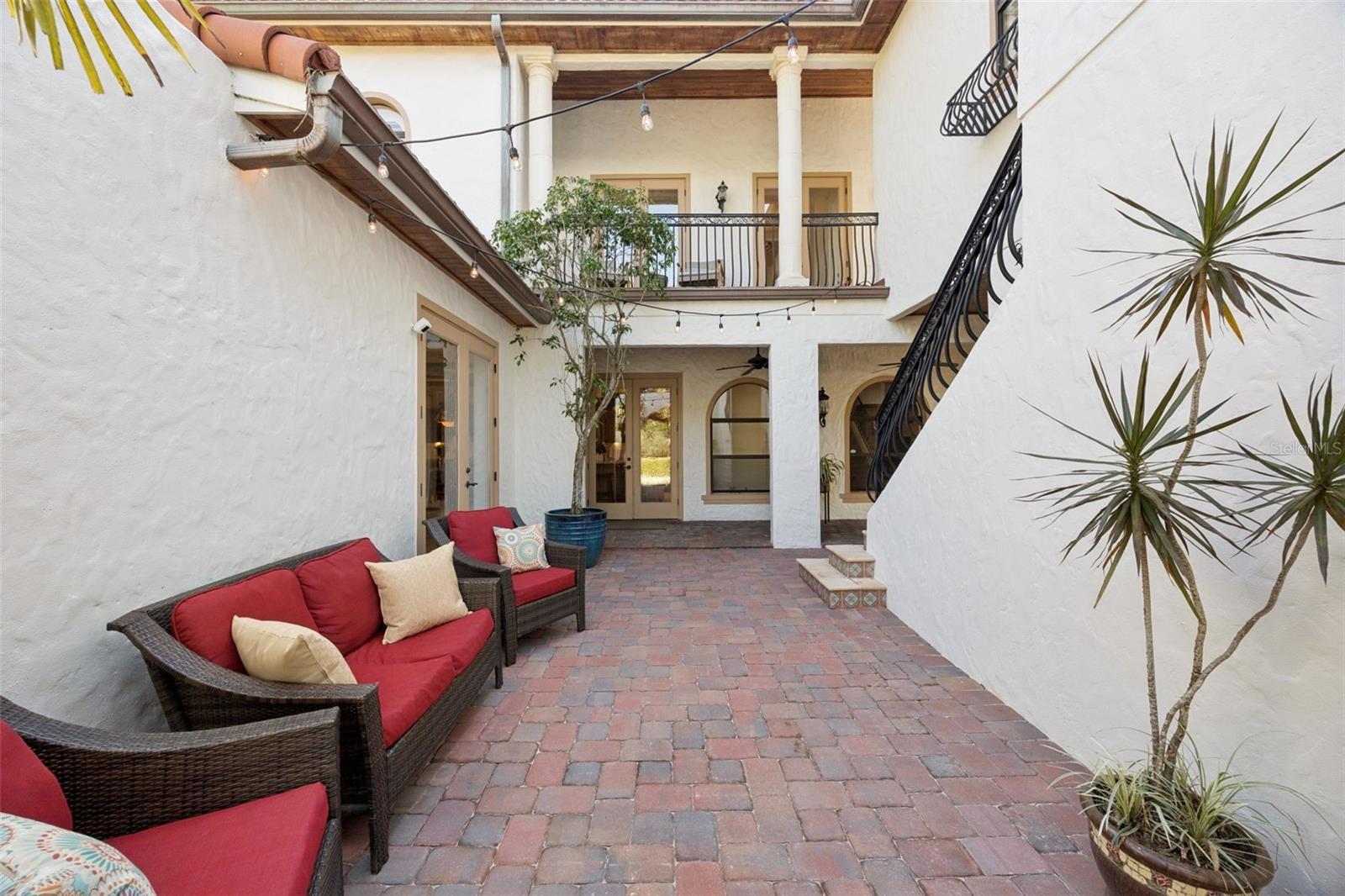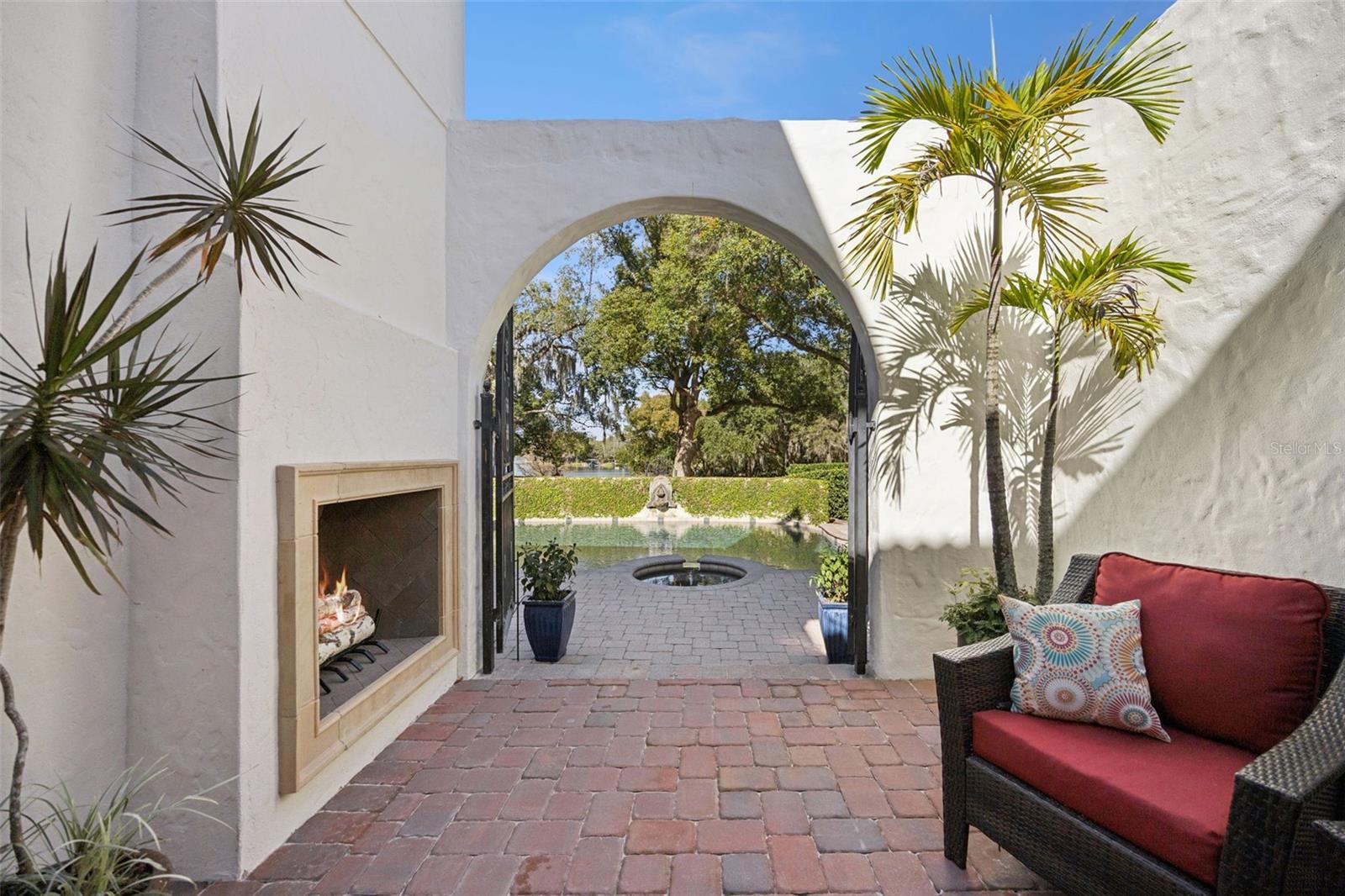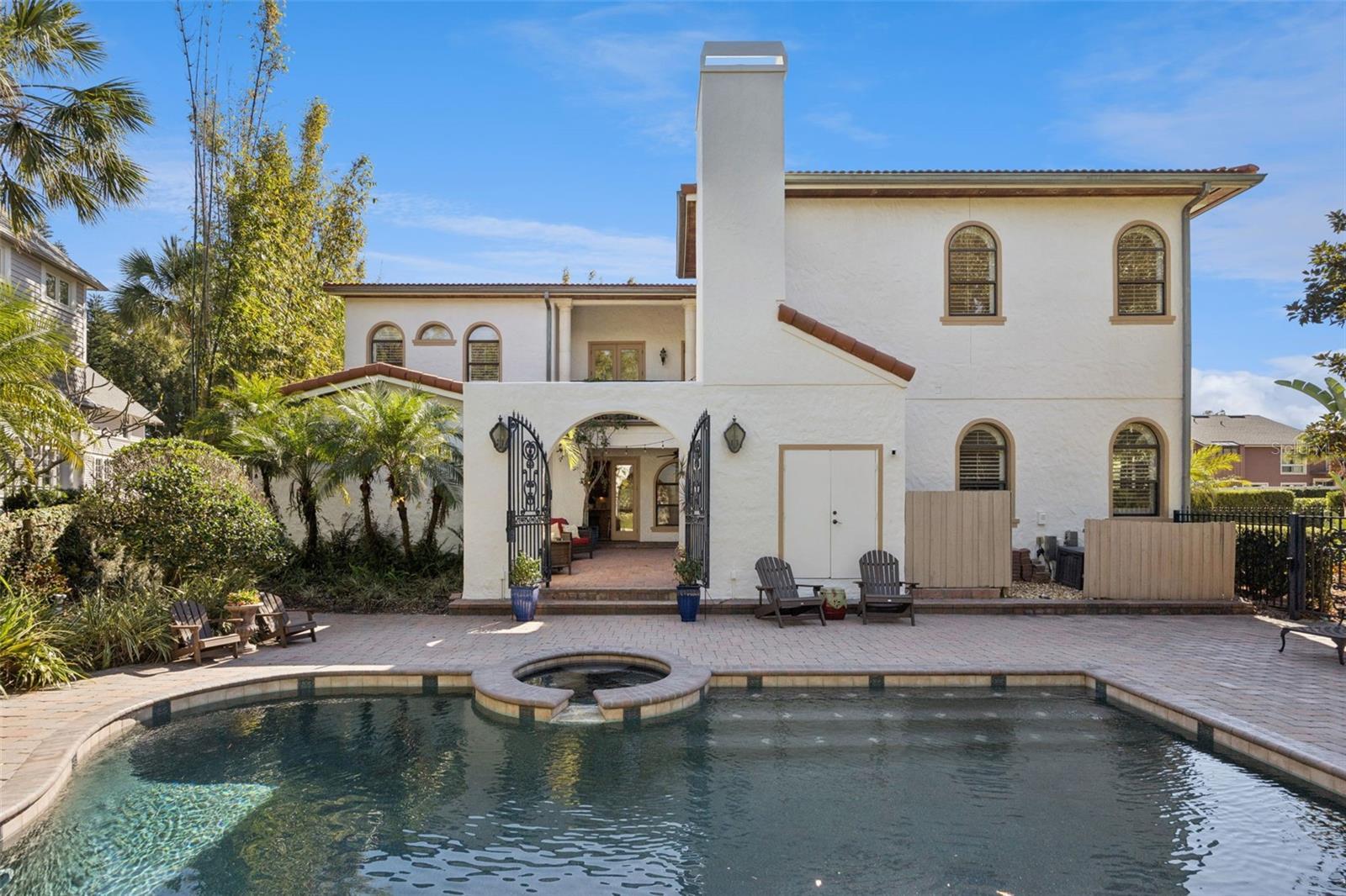 Custom-built estate on a rare 1/3-acre lot overlooking Lake Sue and Beeman Park, thoughtfully designed for multi-generational spaces and split plan living. This Southern European–inspired home features multiple private living quarters connected by covered loggias, offering independence, privacy, and flexibility rarely found in a single-family residence. Wraparound double loggias surround a central courtyard with a wood-burning outdoor fireplace and lake views, creating seamless indoor-outdoor living. The lagoon-style pool and spa with wall fountain and programmable LED lighting are set within expansive, professionally landscaped grounds—perfect for relaxing or entertaining. The main living areas feature 10-foot ceilings on both levels, 8-foot solid and French doors, and a striking curved staircase. The open kitchen flows into the dining and family rooms, ideal for shared gatherings while maintaining private retreats throughout the home. Finishes include custom millwork, crown molding, plantation shutters, solid interior doors, high-end custom cabinetry, and granite countertops in the kitchen, baths, and laundry room. The four-bedroom, four-and-a-half-bath layout plus office is uniquely configured for separate, private bedroom spaces. A ground-floor bedroom connects to the main residence via a covered balcony, ideal for guests, extended family, or live-in support. The second-floor office is also accessed by a loggia and includes a private exterior stairway, offering potential for a home office, studio, or independent suite. The upstairs primary suite provides additional separation and privacy within a three-way split plan. Additional features include a two-car side-entry garage, covered parking for three vehicles, open parking for two more, gated driveways, and custom gates and railings throughout. Located in one of Orlando’s most desirable and quiet neighborhoods, with convenient access to Winter Park, Baldwin Park, Mills Park, and top-rated Winter Park schools, this one-of-a-kind property offers unmatched versatility for today’s multi-generational lifestyle.