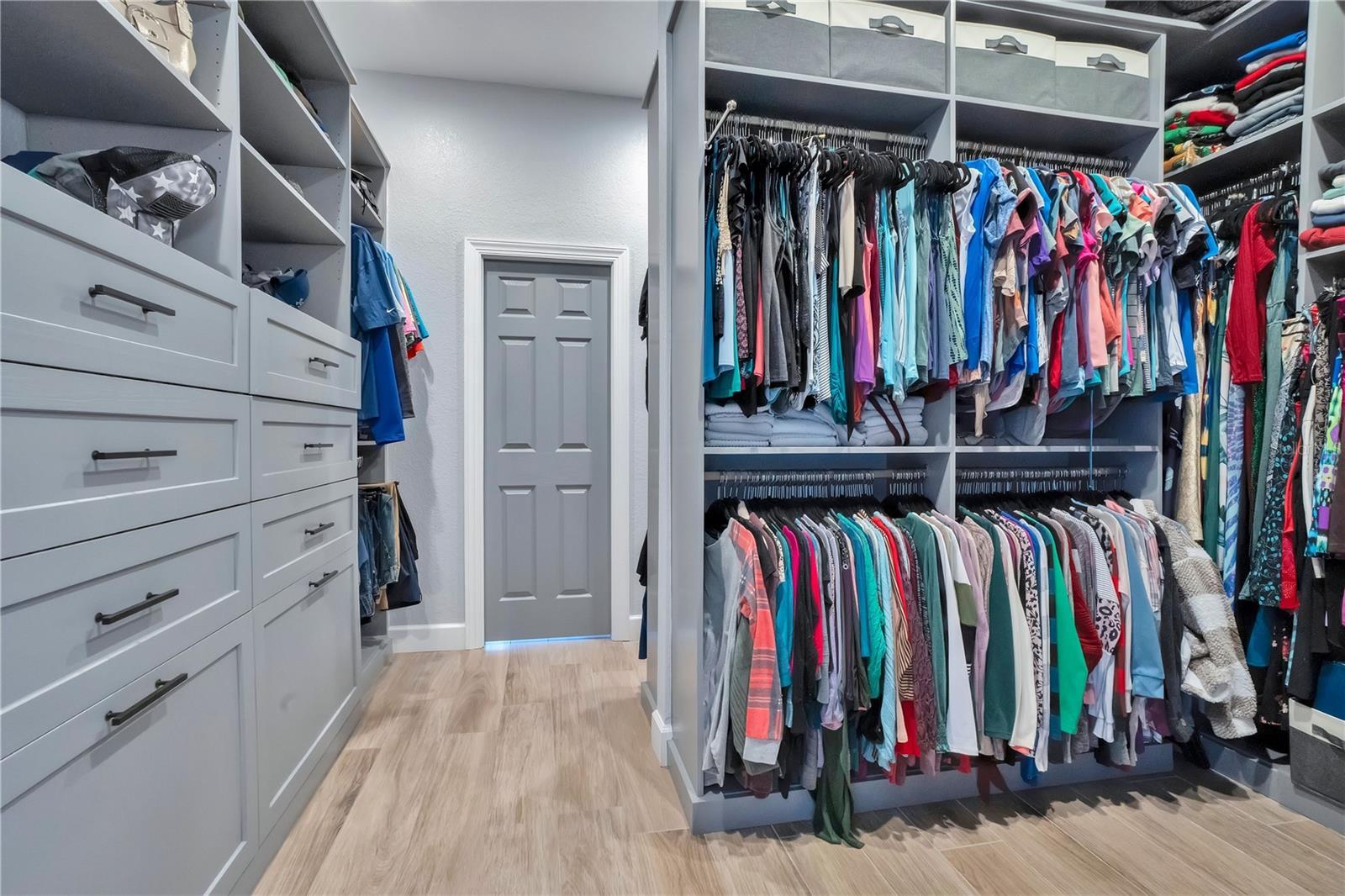 - Built-in Features, Eat-in Kitchen, High Ceilings, Kitchen/Family Room Combo, Open Floorplan, Primary Bedroom Main Floor, Solid Wood Cabinets, Split Bedroom, Stone Counters, Thermostat, Walk-In Closet(s)