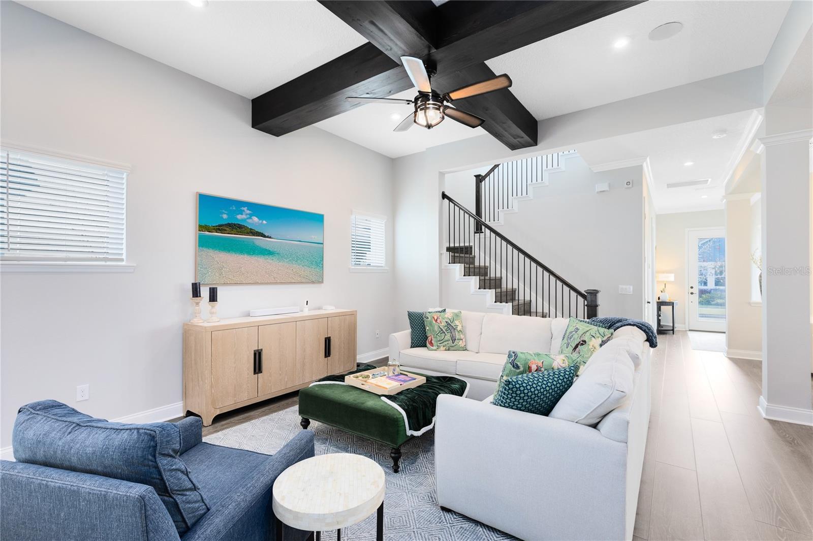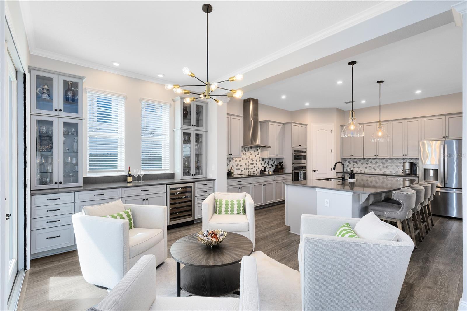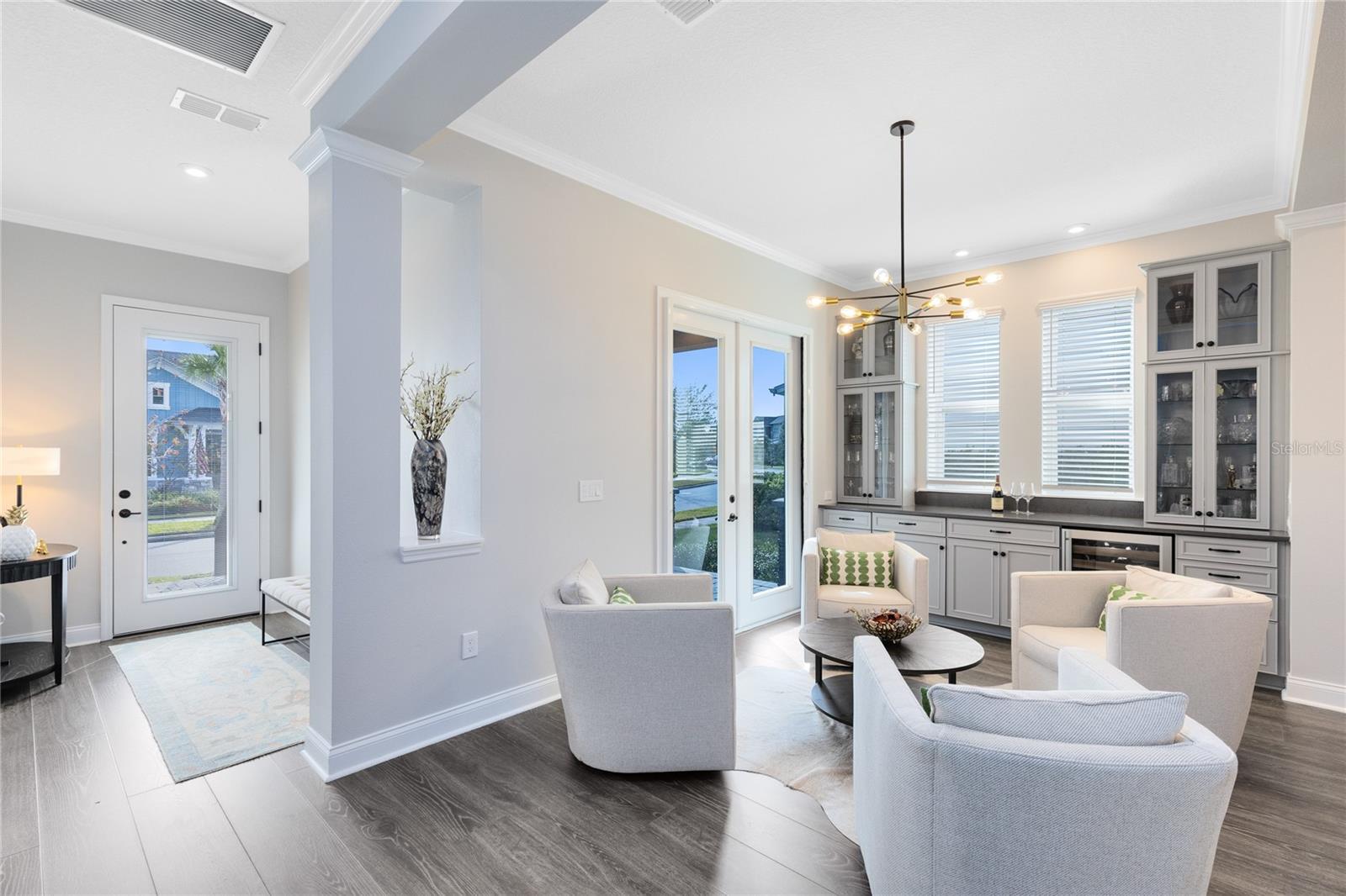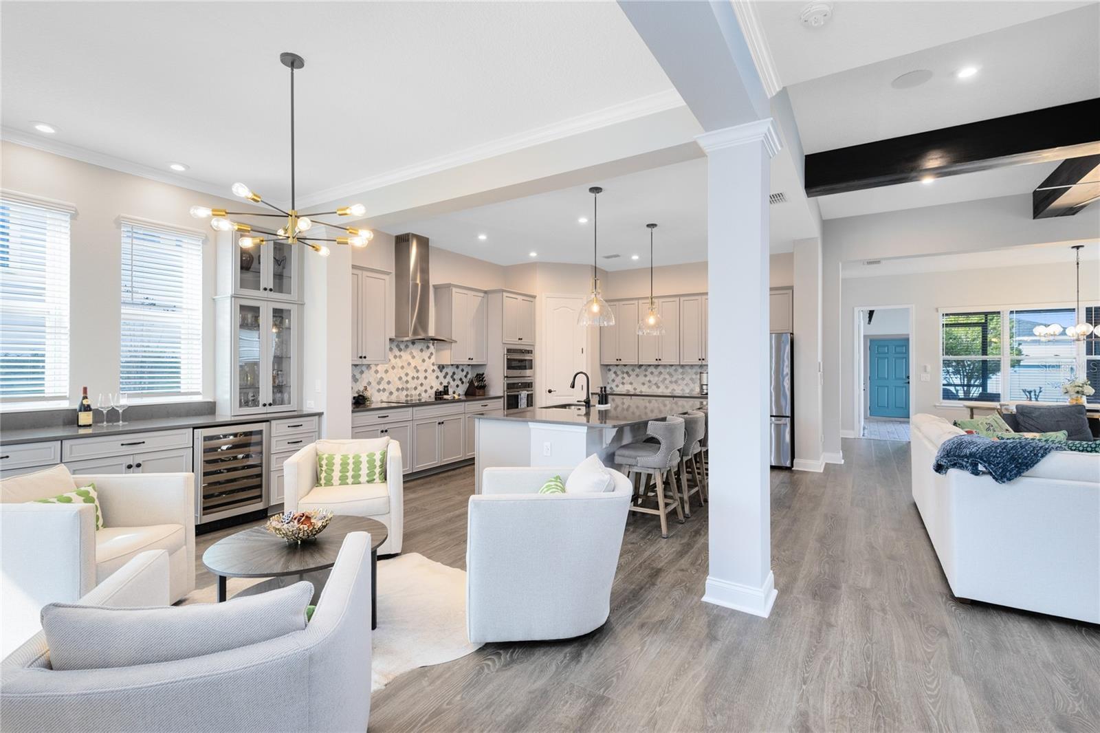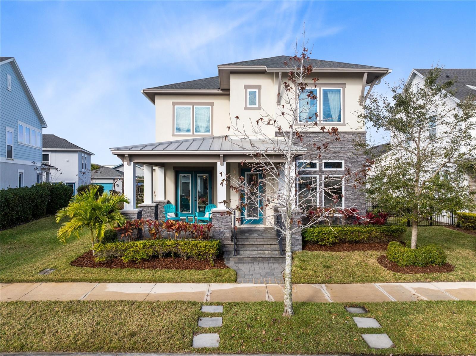 This beautifully upgraded David Weekley Reef floor plan is set on a quiet street in the heart of Laureate Park in Lake Nona and delivers a refined blend of design, space, and functionality. A welcoming covered front porch with paver flooring, manicured landscaping, and phantom retractable screens creates instant curb appeal and sets the tone for the home. Inside, rich Mohawk laminate flooring, crown molding, high ceilings, designer lighting, and abundant natural light elevate the main living areas. Just off the foyer is a private office with glass French doors and large windows, offering flexibility for work or study while providing additional storage tucked beneath the staircase. The open dining, kitchen, and family room layout is ideal for entertaining and everyday living. The dining area features custom built in cabinetry, a wine refrigerator, buffet bar, and French doors that open to the front porch for seamless indoor outdoor flow. The chef inspired kitchen showcases light gray shaker cabinetry, granite countertops, a large center island, GE Profile stainless steel appliances with a Bosch dishwasher, pot and pan drawers, soft close cabinetry, pull out trash storage, a closet pantry, and a stylish backsplash. The adjoining great room is filled with natural light and highlighted by exposed stained wood ceiling beams, an integrated ceiling speaker system, and smart Lutron dimmer switches that control lighting and fans via phone or Alexa. A Florida room just off the living area provides additional flexible space for lounging, play, or entertaining. The primary suite is privately positioned at the rear of the home and features high ceilings, exposed wood beams, luxury vinyl plank flooring, and a serene atmosphere. The spa style primary bath offers dual vanities with granite countertops, dark hardware, designer lighting, and a striking floor to ceiling supershower with herringbone detail and built in seating. A spacious walk in closet with a custom designer closet system completes the suite, and all additional closets throughout the home have also been upgraded with custom storage solutions. A large laundry room with cabinetry, built in sink, and direct access to the primary bath adds everyday convenience. Upstairs, upgraded wrought iron stair spindles lead to a generous loft, perfect for a media or recreation space. One bedroom includes a private ensuite bath, while two additional bedrooms share a full bathroom, offering comfort and privacy for family or guests. Outdoor living continues on the covered and screened rear lanai with paver flooring, ceiling fan, TV mount, and an extended paver patio with a walkway leading to the garage, ideal for relaxing or entertaining. The oversized three car garage features an epoxy coated floor, overhead storage system, and attic access with flooring and lighting, providing exceptional storage and functionality. The garage is complemented by a usable driveway, a valuable feature in this community. The home also features a two zone air conditioning system with smart thermostats that can be controlled by phone or Alexa. Laureate Park residents enjoy the Aquatic Center, LP Fit gym, playgrounds, and over forty four miles of trails. Located in Lake Nona, just minutes from Medical City, Nemours, the VA hospital, major highways, Orlando International Airport, the USTA National Campus, and KPMG. This home blends space, luxury, and community in one of Central Florida’s most sought after locations.