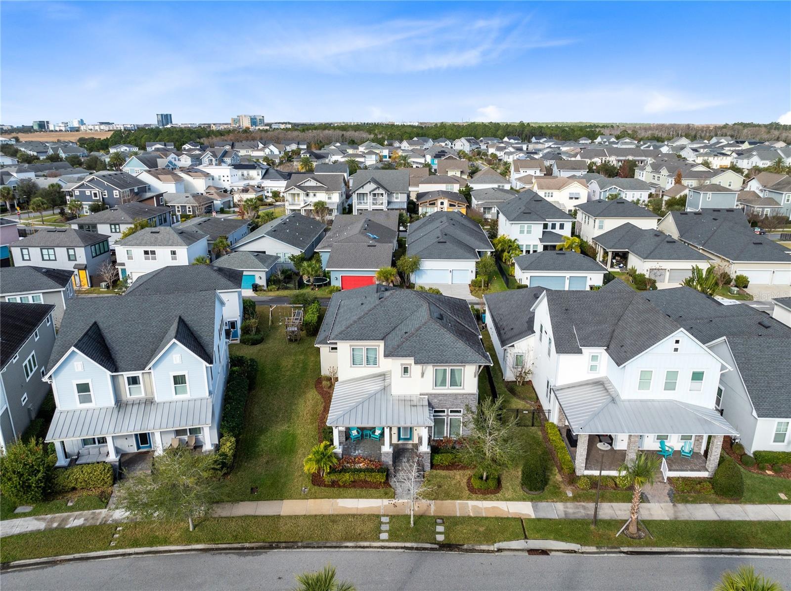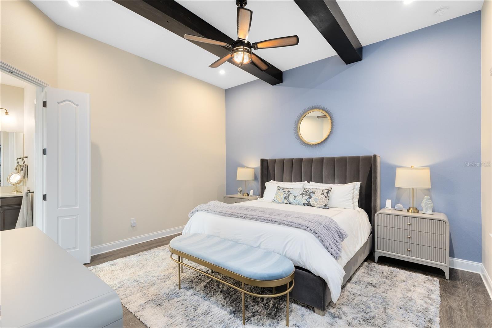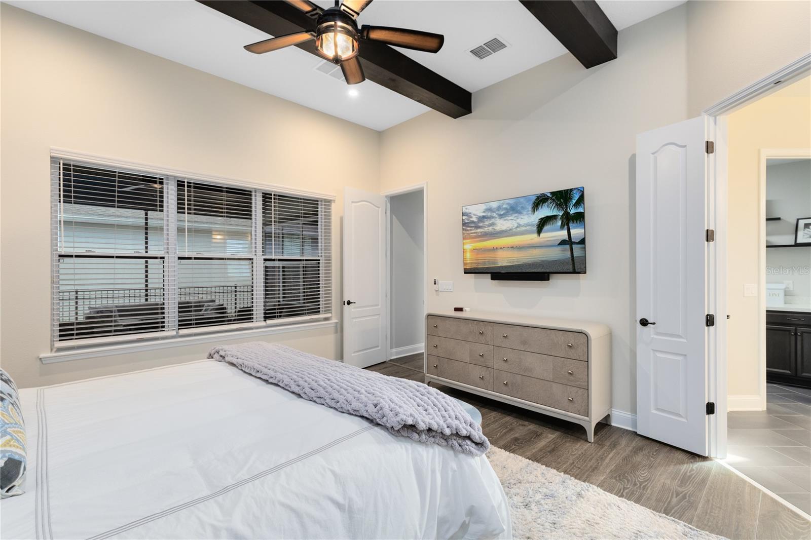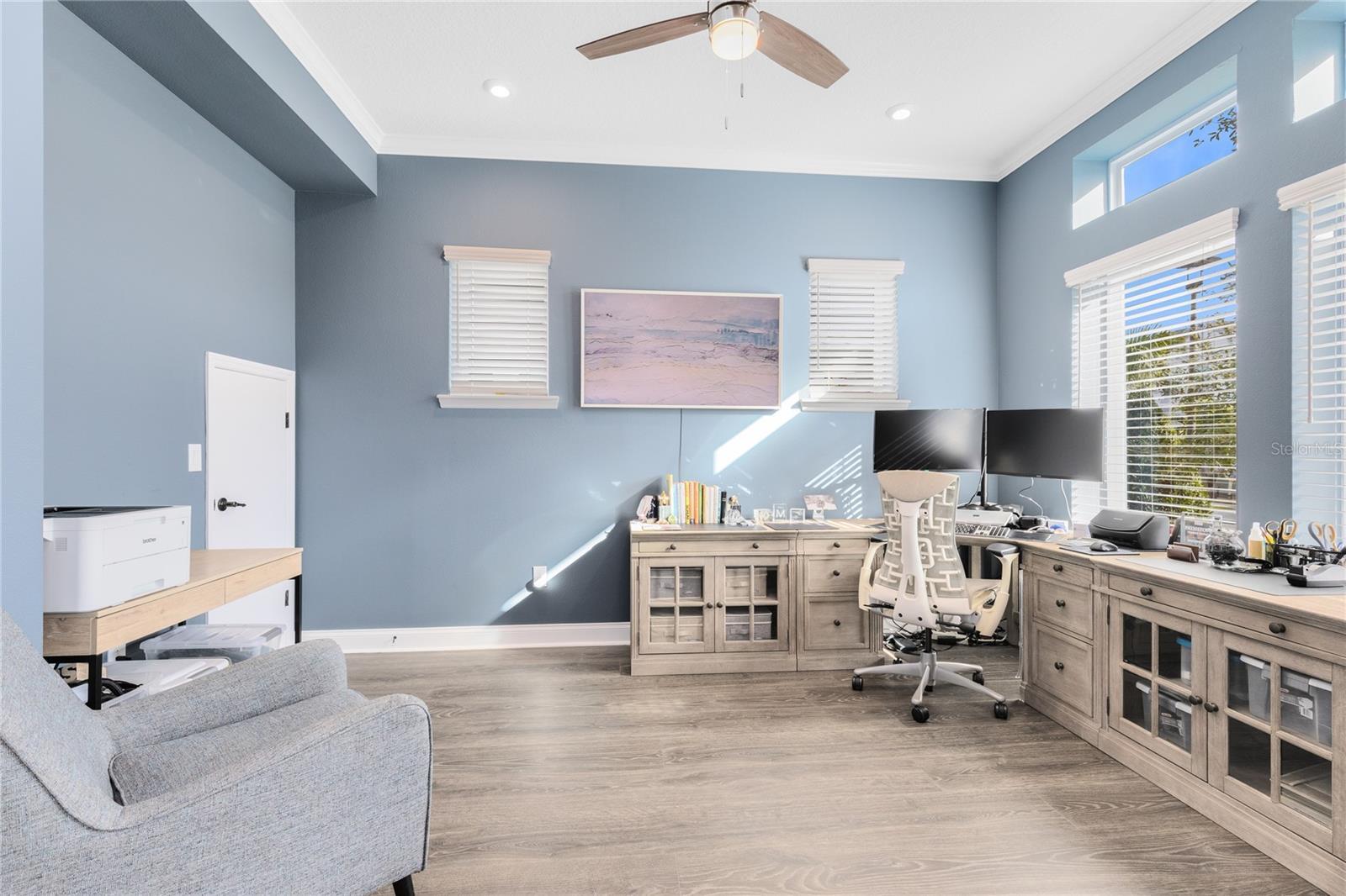 This beautifully upgraded David Weekley Reef floor plan is set on a quiet street in the heart of Laureate Park in Lake Nona and delivers a refined blend of design, space, and functionality. A welcoming covered front porch with paver flooring, manicured landscaping, and phantom retractable screens creates instant curb appeal and sets the tone for the home. Inside, rich Mohawk laminate flooring, crown molding, high ceilings, designer lighting, and abundant natural light elevate the main living areas. Just off the foyer is a private office with glass French doors and large windows, offering flexibility for work or study while providing additional storage tucked beneath the staircase. The open dining, kitchen, and family room layout is ideal for entertaining and everyday living. The dining area features custom built in cabinetry, a wine refrigerator, buffet bar, and French doors that open to the front porch for seamless indoor outdoor flow. The chef inspired kitchen showcases light gray shaker cabinetry, granite countertops, a large center island, GE Profile stainless steel appliances with a Bosch dishwasher, pot and pan drawers, soft close cabinetry, pull out trash storage, a closet pantry, and a stylish backsplash. The adjoining great room is filled with natural light and highlighted by exposed stained wood ceiling beams, an integrated ceiling speaker system, and smart Lutron dimmer switches that control lighting and fans via phone or Alexa. A Florida room just off the living area provides additional flexible space for lounging, play, or entertaining. The primary suite is privately positioned at the rear of the home and features high ceilings, exposed wood beams, luxury vinyl plank flooring, and a serene atmosphere. The spa style primary bath offers dual vanities with granite countertops, dark hardware, designer lighting, and a striking floor to ceiling supershower with herringbone detail and built in seating. A spacious walk in closet with a custom designer closet system completes the suite, and all additional closets throughout the home have also been upgraded with custom storage solutions. A large laundry room with cabinetry, built in sink, and direct access to the primary bath adds everyday convenience. Upstairs, upgraded wrought iron stair spindles lead to a generous loft, perfect for a media or recreation space. One bedroom includes a private ensuite bath, while two additional bedrooms share a full bathroom, offering comfort and privacy for family or guests. Outdoor living continues on the covered and screened rear lanai with paver flooring, ceiling fan, TV mount, and an extended paver patio with a walkway leading to the garage, ideal for relaxing or entertaining. The oversized three car garage features an epoxy coated floor, overhead storage system, and attic access with flooring and lighting, providing exceptional storage and functionality. The garage is complemented by a usable driveway, a valuable feature in this community. The home also features a two zone air conditioning system with smart thermostats that can be controlled by phone or Alexa. Laureate Park residents enjoy the Aquatic Center, LP Fit gym, playgrounds, and over forty four miles of trails. Located in Lake Nona, just minutes from Medical City, Nemours, the VA hospital, major highways, Orlando International Airport, the USTA National Campus, and KPMG. This home blends space, luxury, and community in one of Central Florida’s most sought after locations.
