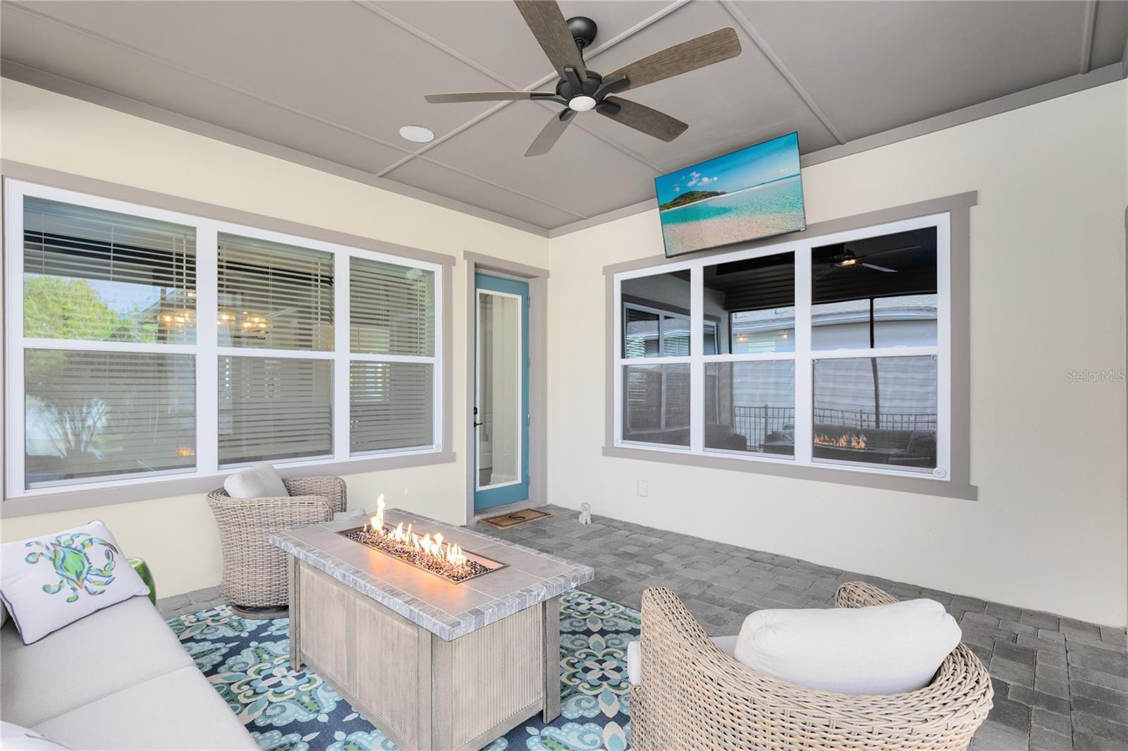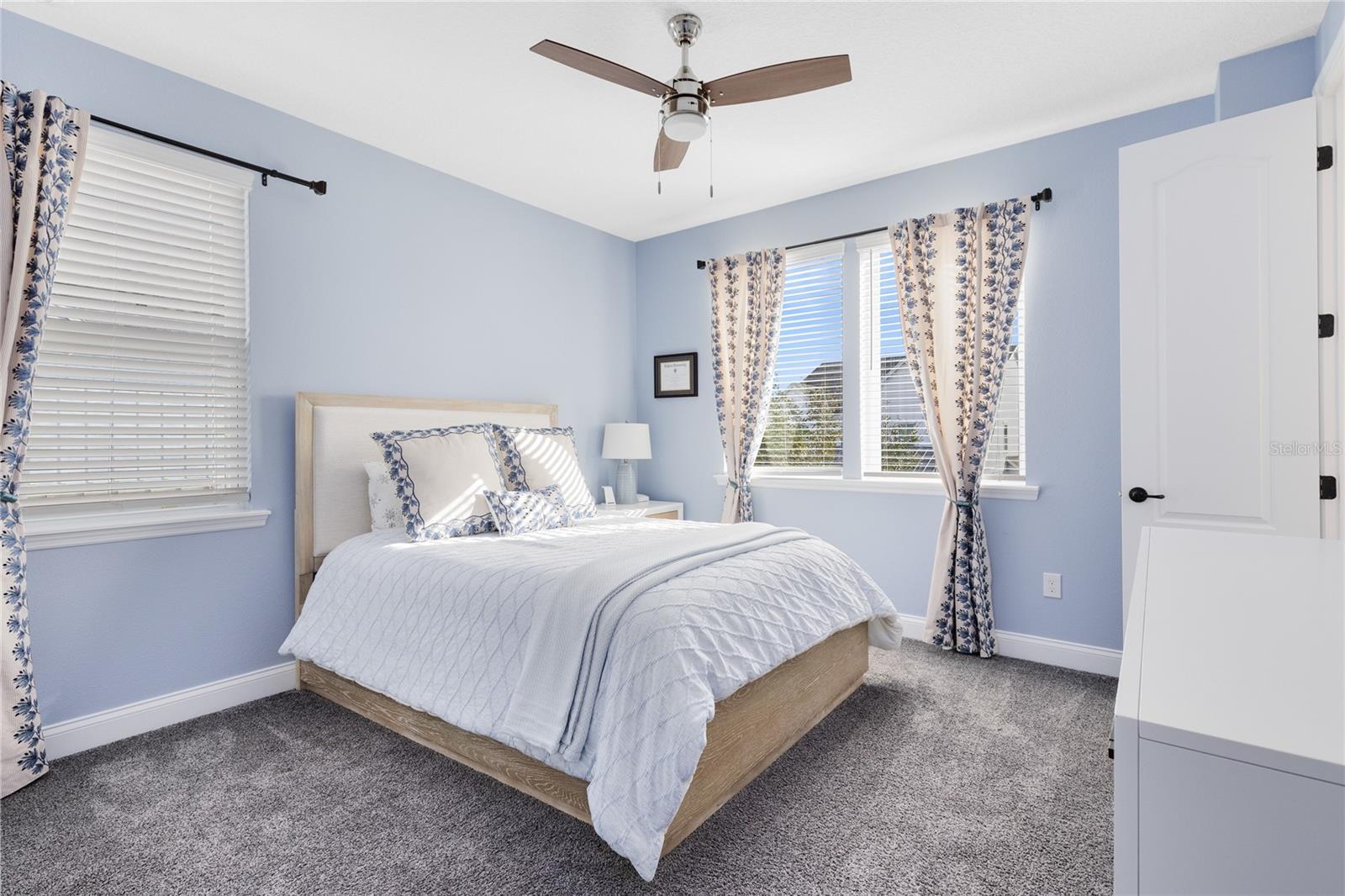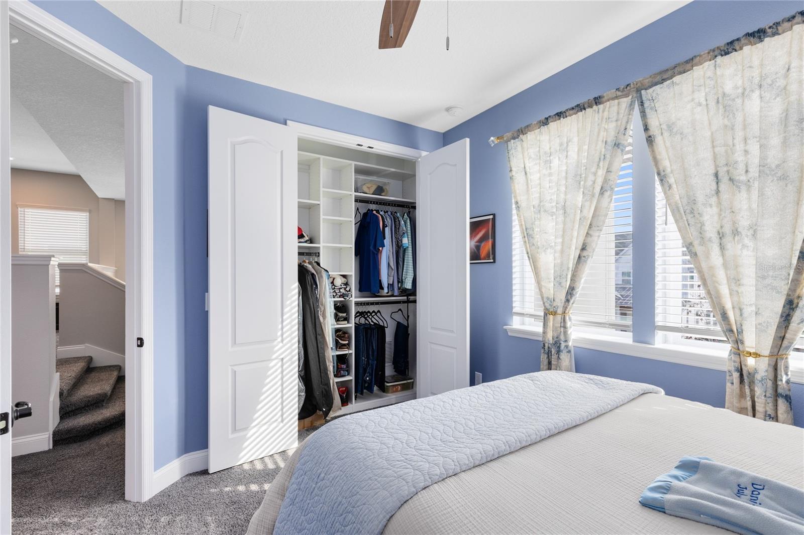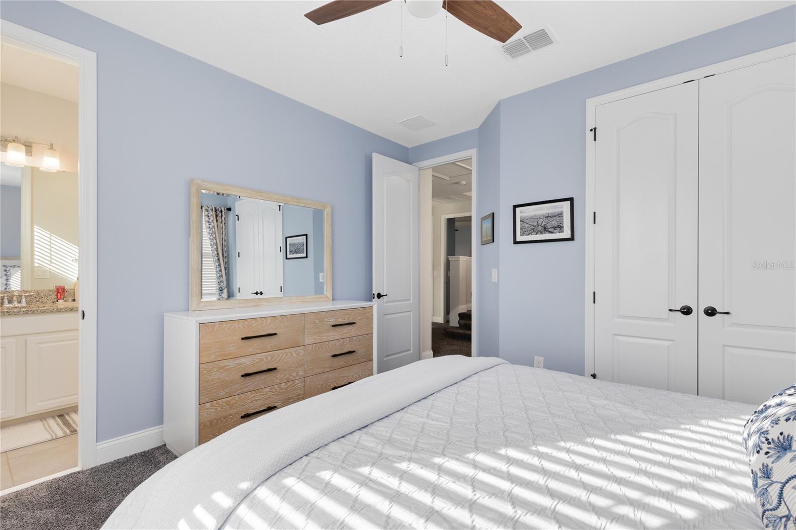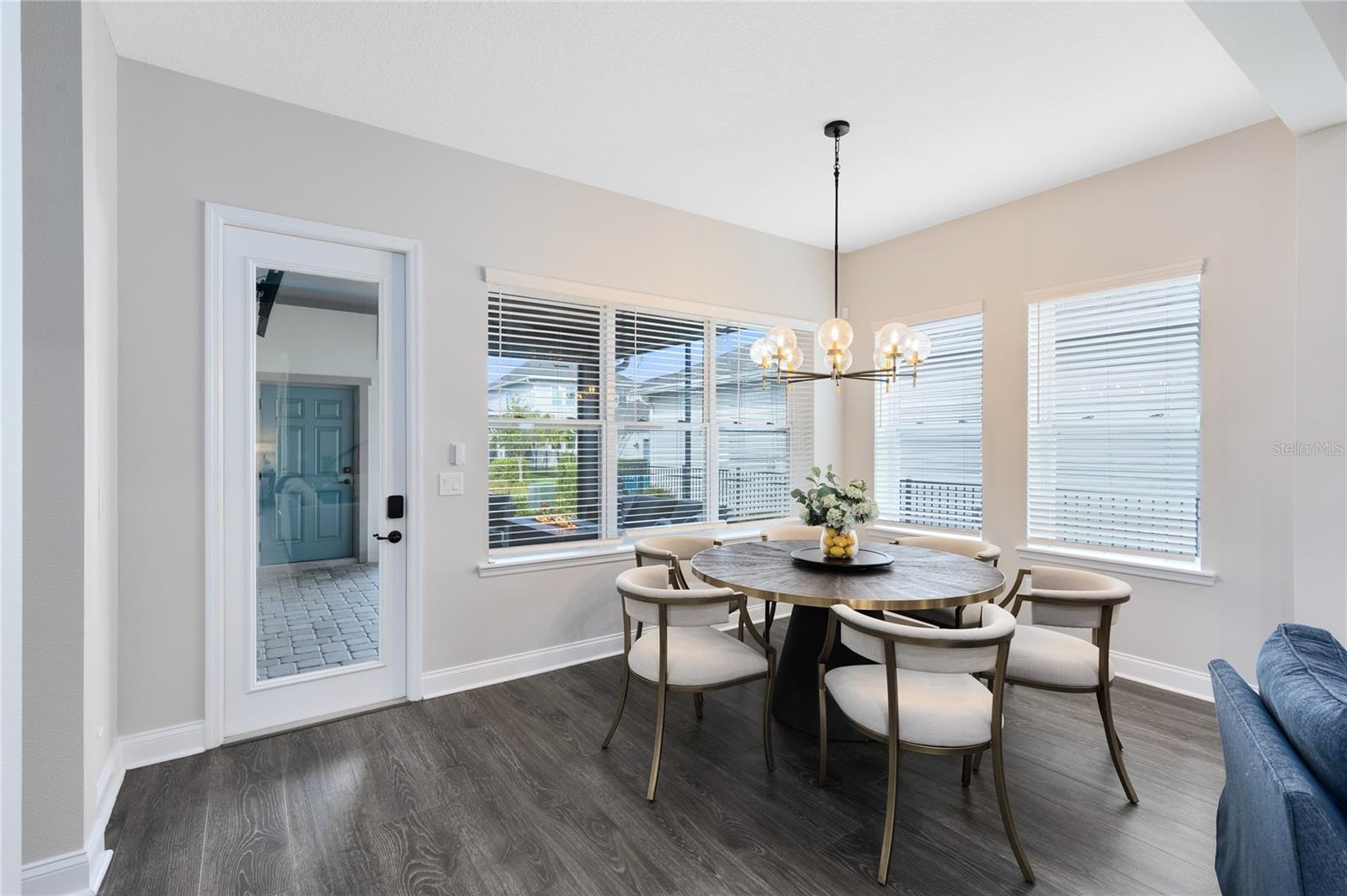 This beautifully upgraded David Weekley Reef floor plan is set on a quiet street in the heart of Laureate Park in Lake Nona and delivers a refined blend of design, space, and functionality. A welcoming covered front porch with paver flooring, manicured landscaping, and phantom retractable screens creates instant curb appeal and sets the tone for the home. Inside, rich Mohawk laminate flooring, crown molding, high ceilings, designer lighting, and abundant natural light elevate the main living areas. Just off the foyer is a private office with glass French doors and large windows, offering flexibility for work or study while providing additional storage tucked beneath the staircase. The open dining, kitchen, and family room layout is ideal for entertaining and everyday living. The dining area features custom built in cabinetry, a wine refrigerator, buffet bar, and French doors that open to the front porch for seamless indoor outdoor flow. The chef inspired kitchen showcases light gray shaker cabinetry, granite countertops, a large center island, GE Profile stainless steel appliances with a Bosch dishwasher, pot and pan drawers, soft close cabinetry, pull out trash storage, a closet pantry, and a stylish backsplash. The adjoining great room is filled with natural light and highlighted by exposed stained wood ceiling beams, an integrated ceiling speaker system, and smart Lutron dimmer switches that control lighting and fans via phone or Alexa. A Florida room just off the living area provides additional flexible space for lounging, play, or entertaining. The primary suite is privately positioned at the rear of the home and features high ceilings, exposed wood beams, luxury vinyl plank flooring, and a serene atmosphere. The spa style primary bath offers dual vanities with granite countertops, dark hardware, designer lighting, and a striking floor to ceiling supershower with herringbone detail and built in seating. A spacious walk in closet with a custom designer closet system completes the suite, and all additional closets throughout the home have also been upgraded with custom storage solutions. A large laundry room with cabinetry, built in sink, and direct access to the primary bath adds everyday convenience. Upstairs, upgraded wrought iron stair spindles lead to a generous loft, perfect for a media or recreation space. One bedroom includes a private ensuite bath, while two additional bedrooms share a full bathroom, offering comfort and privacy for family or guests. Outdoor living continues on the covered and screened rear lanai with paver flooring, ceiling fan, TV mount, and an extended paver patio with a walkway leading to the garage, ideal for relaxing or entertaining. The oversized three car garage features an epoxy coated floor, overhead storage system, and attic access with flooring and lighting, providing exceptional storage and functionality. The garage is complemented by a usable driveway, a valuable feature in this community. The home also features a two zone air conditioning system with smart thermostats that can be controlled by phone or Alexa. Laureate Park residents enjoy the Aquatic Center, LP Fit gym, playgrounds, and over forty four miles of trails. Located in Lake Nona, just minutes from Medical City, Nemours, the VA hospital, major highways, Orlando International Airport, the USTA National Campus, and KPMG. This home blends space, luxury, and community in one of Central Florida’s most sought after locations.