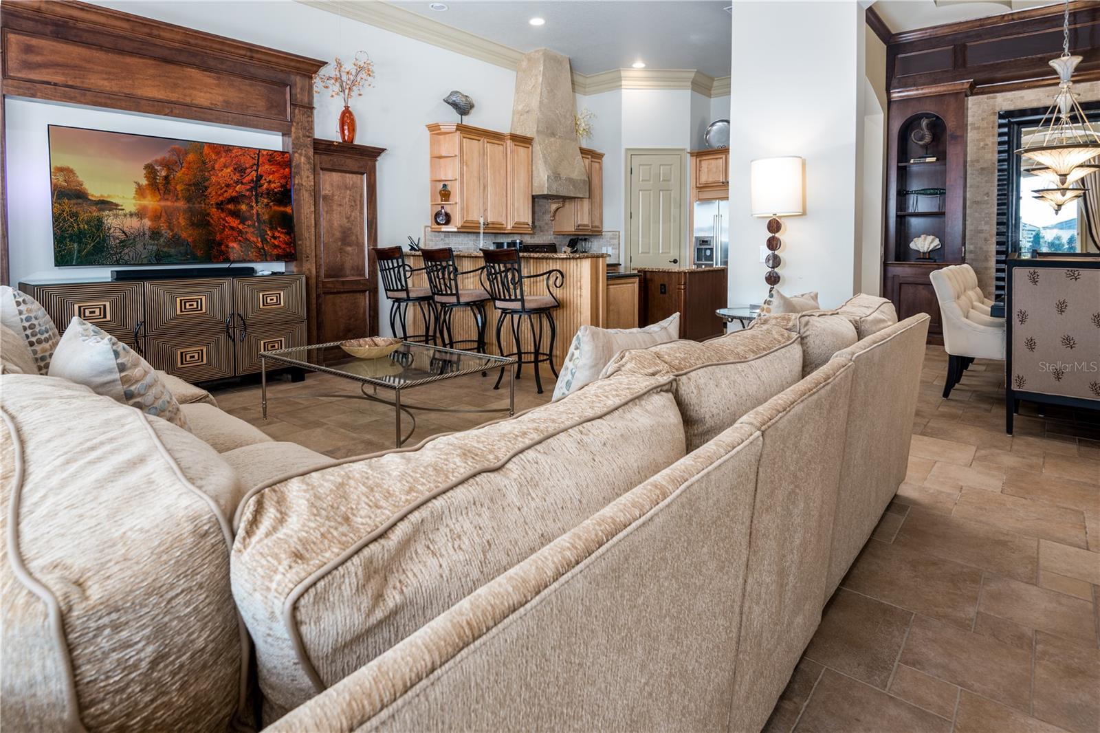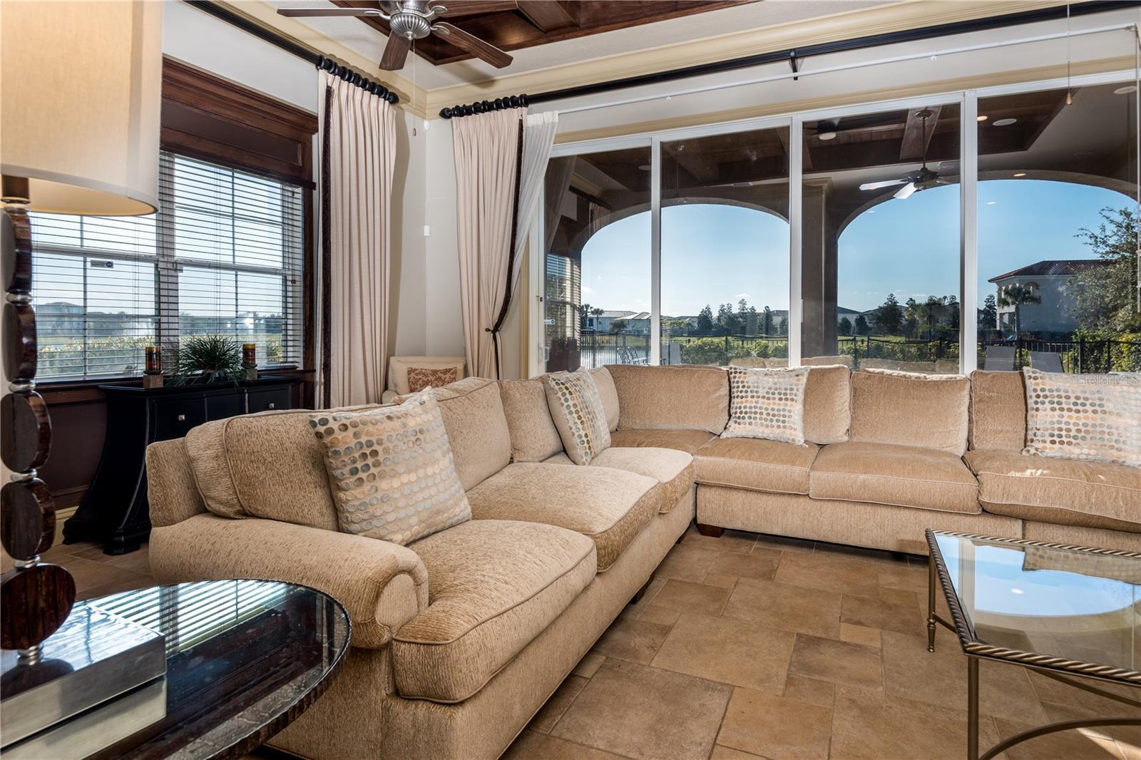 CUSTOM, FULLY FURNISHED former MODEL HOME with a west facing WATER VIEW. This amazing private pool home is walking distance to the Jack Nicklaus Clubhouse located on Reunion's West Side. The first level features ceramic tile throughout with tasteful detail. There are two extra sitting areas, a formal dining room & open living area with beautiful exposed wood ceiling beams. The kitchen is a chef's dream, that includes granite countertops, island & high end appliances. The Primary Suite includes a private balcony with an amazing water view. The oversized 4th bedroom is ensuite and has been converted into a billiard room. The pool & spa are almost new. Enjoy an afternoon BBQ with the outdoor kitchen, then sit back and relax under the covered lanai. Great opportunity to utilize as a primary residence, second home or vacation rental property. Reunion Resort is a 2,300 acre Private Golf & Tennis Community, just 6 miles from Disney and a short drive to the Orlando International Airport.