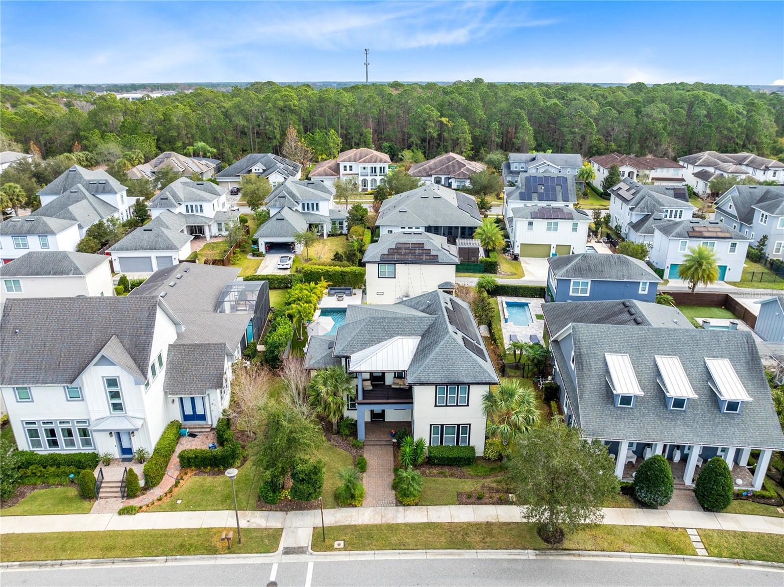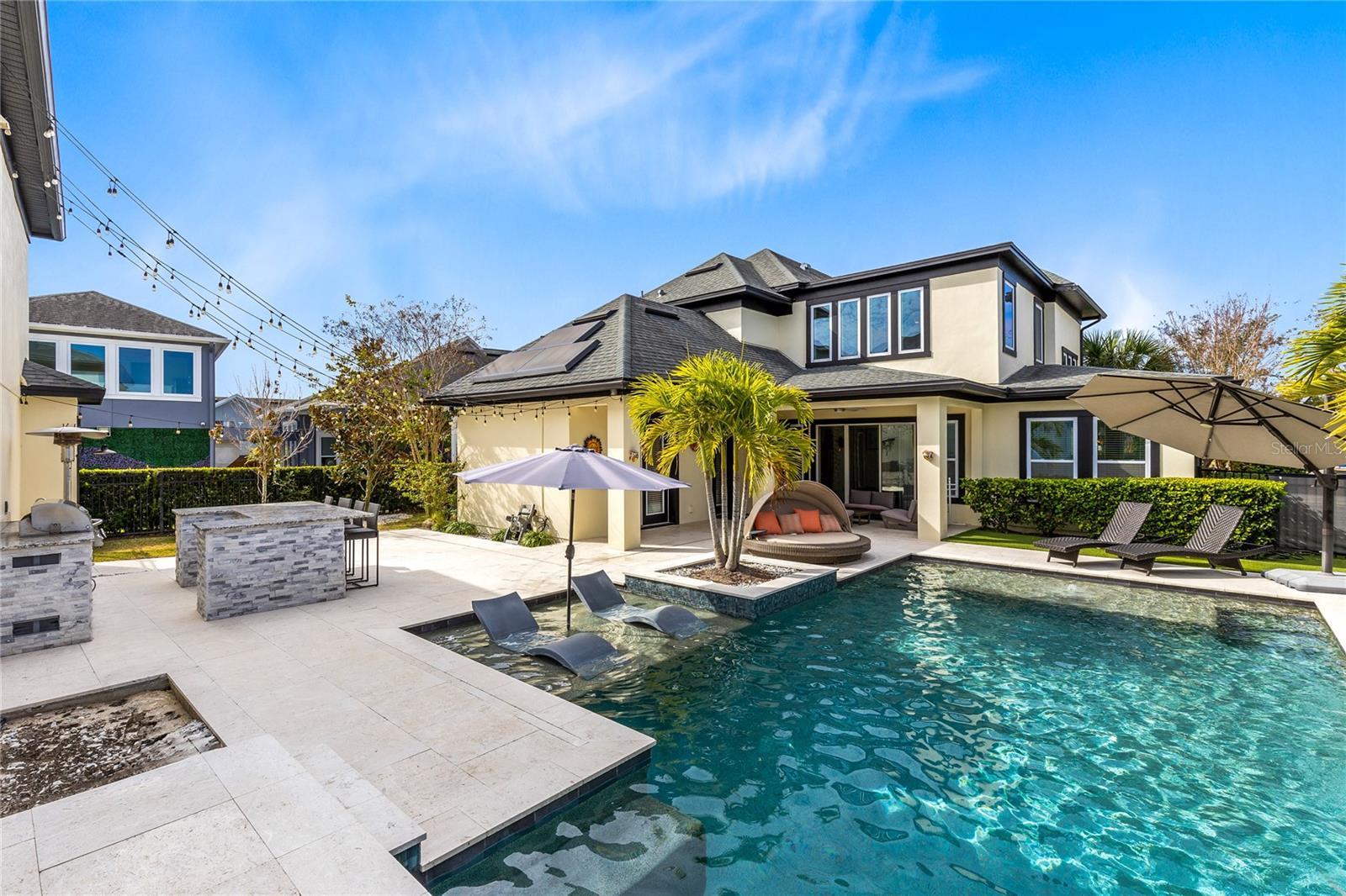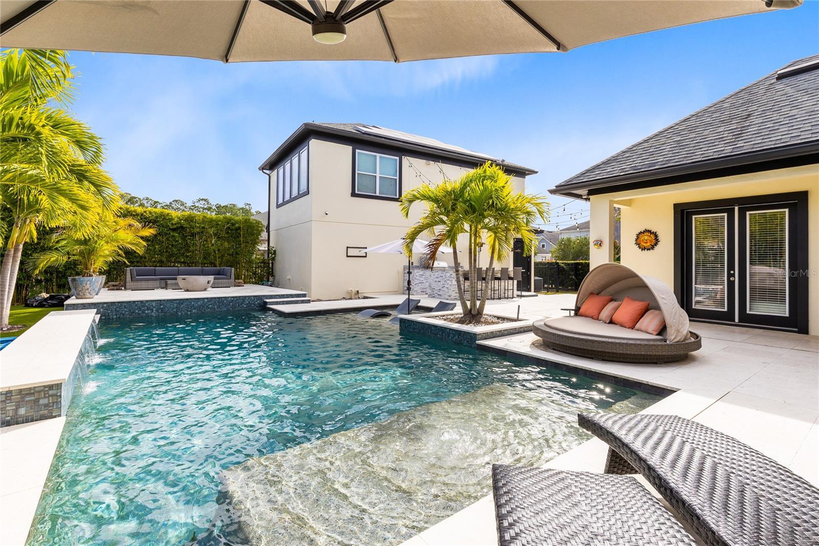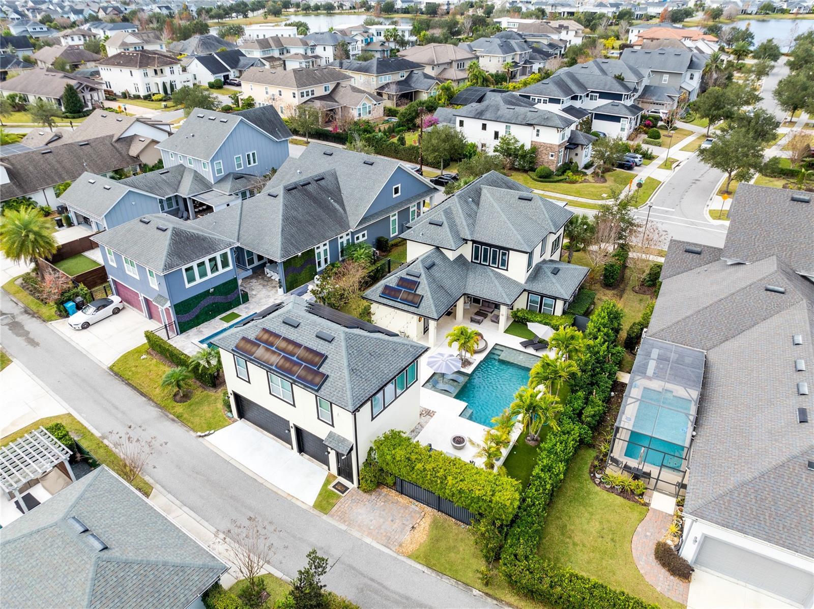 This stunning 4 bedroom, 3.5 bath pool home sits on an oversized lot in the heart of Laureate Park in Lake Nona and offers 2,755 square feet of thoughtfully designed living space. Currently owner occupied, the home features a bright open floor plan with soaring two story ceilings, expansive windows, and rich wood flooring throughout the main living areas. The first floor includes a spacious family room that flows seamlessly into the chef inspired kitchen featuring a large island with seating, stone countertops, upgraded cabinetry, stainless steel appliances, built in oven and cooktop, statement pendant lighting, and excellent sightlines for entertaining. Sliding glass doors connect the main living area to the covered patio and an exceptional private backyard retreat. The first floor primary suite offers a peaceful escape with a custom accent wall, crown molding, ceiling fan, and a spa inspired bathroom with dual vanities, stone counters, a large walk in shower with rain shower head, and a walk in closet. Upstairs, a generous loft provides flexible living space ideal for a second family room, media area, or work from home setup and includes access to a private balcony overlooking the front of the home. Three additional bedrooms and two full bathrooms complete the second level. The backyard is designed for resort style living and entertaining, featuring a custom pool with sun shelf and water features, multiple lounge areas, fire pit seating, a covered patio, and a fully equipped outdoor kitchen with stone counters and grill, all surrounded by privacy landscaping and modern hardscape. Additional highlights include a dedicated home office, laundry room, crown molding, high ceilings, solar panels that help offset electric costs at no additional charge to the tenant, and two garage parking spaces within the rare three car garage. Laureate Park isn’t just a neighborhood, it’s a vibrant lifestyle. Enjoy the Aquatic Center, resort style pools, LP Fit gym, and over 44 miles of trails. Located in prime Lake Nona, minutes from Medical City, the VA hospital, Nemours, dining, and shopping, with easy access to Orlando International Airport, major highways, the USTA National Campus, Orlando theme parks, and Florida beaches.