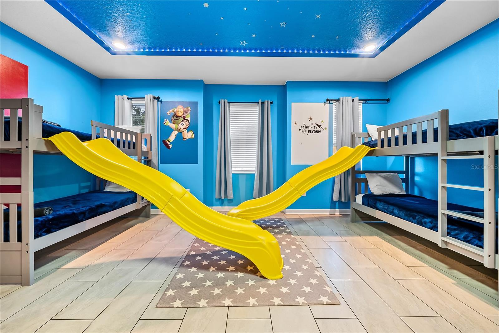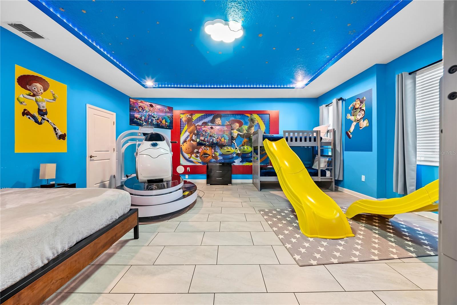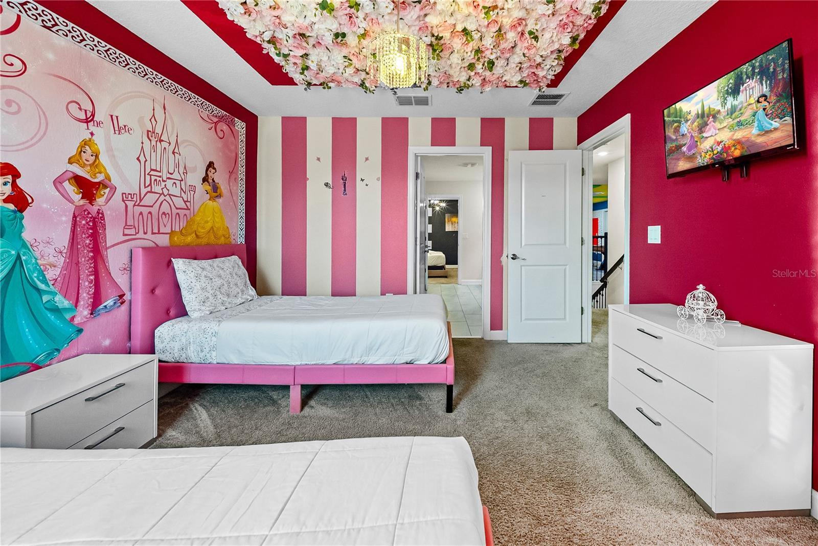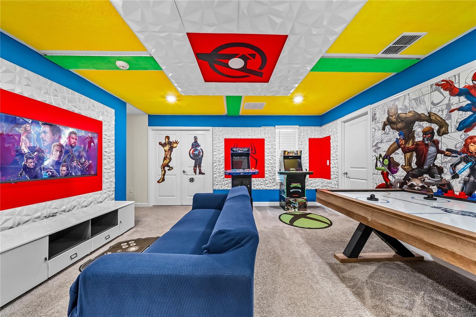 Spectacular 8-bedroom, 5-bath vacation home located in the highly desirable Storey Lake Resort, offering an unbeatable location near Orlando’s major attractions, shopping, and dining. This sought-after Santiago model, the largest and most popular floor plan in the community, is a proven income-producing property and is being sold fully furnished and turn-key. The home features a well-balanced and functional layout designed to comfortably accommodate large groups, making it ideal for multi-generational stays or short-term rental use. The first floor welcomes you with an inviting foyer and includes a full bedroom, a spacious kitchen with large breakfast bar and pantry, and open living and dining areas enhanced by modern finishes and quartz countertops throughout. Sliding glass doors lead to a covered patio and screened private pool, creating seamless indoor-outdoor living. The main level also includes a custom themed game room equipped with a VR machine, while upstairs you’ll find a spacious loft/media area, additional themed spaces, and a conveniently located laundry room. The second level features the remaining bedrooms and bathrooms, offering ample privacy for guests. A private movie theater and thoughtfully designed themed bedrooms further elevate the guest experience and rental appeal. Storey Lake Resort offers exceptional amenities, including a resort-style clubhouse, fitness center, water park with slides and lazy river, tiki bar, playgrounds, and basketball, volleyball, and tennis courts. Located approximately 4 miles from Walt Disney World and minutes from Universal Studios, SeaWorld, and major highways, this property delivers both lifestyle and investment potential. Property management information and rental financials available upon request. An excellent opportunity for investors or buyers seeking a high-performing vacation rental in one of Central Florida’s most sought-after communities.