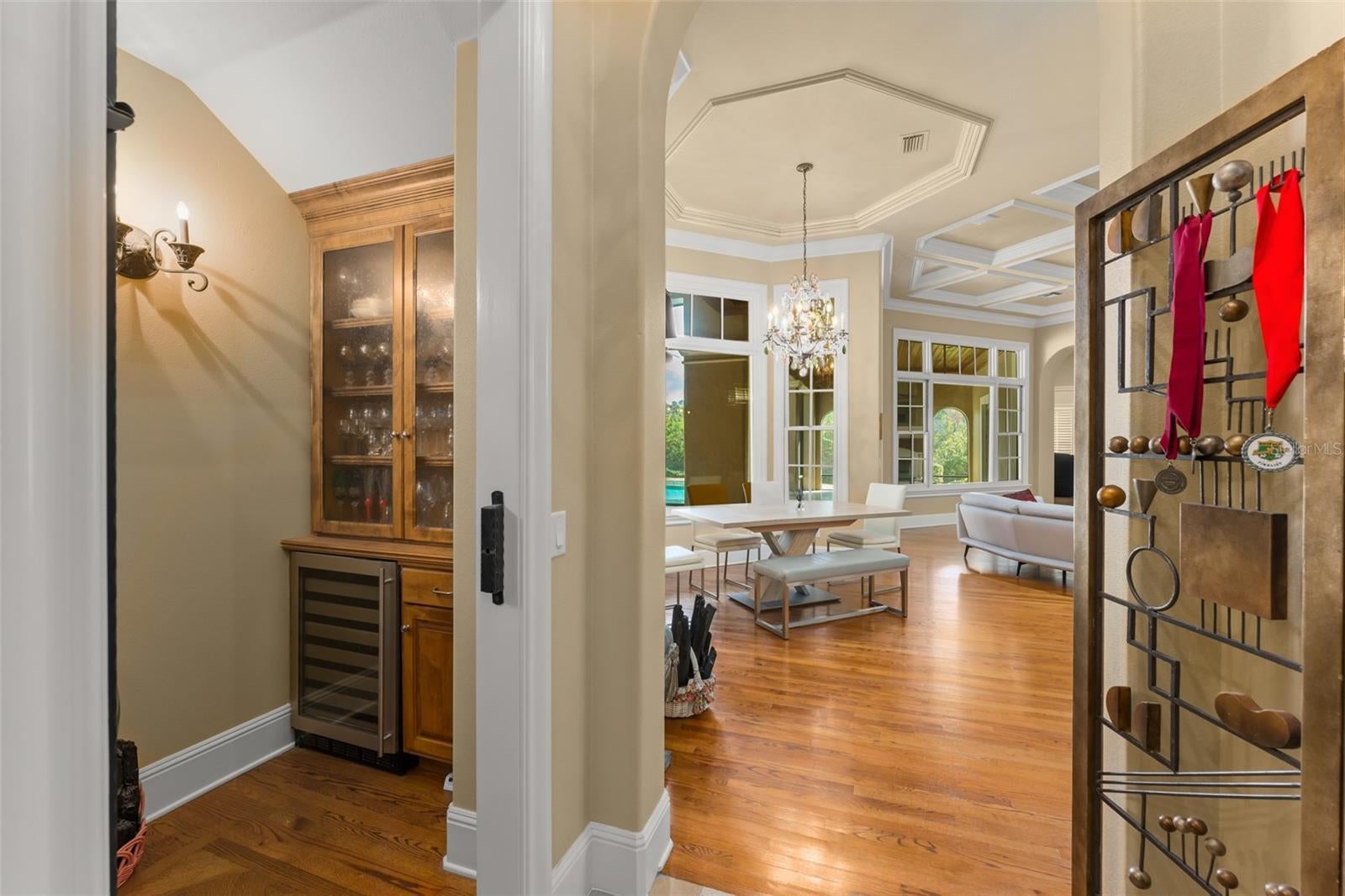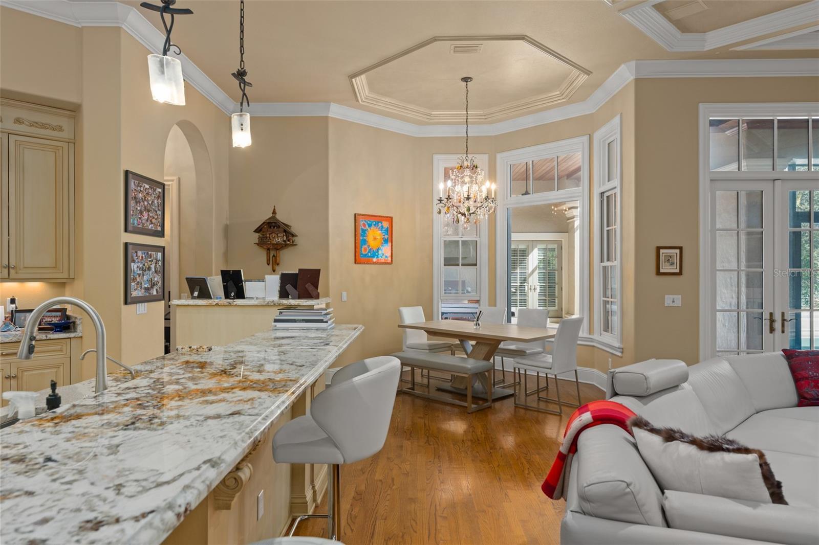 Nestled within the private gates of Isleworth West, a secluded enclave within the prestigious Isleworth community, this five-bedroom residence offers serenity and privacy against a backdrop of tranquil preserve views. Encompassing more than 6,200 square feet of thoughtfully designed living space, the home showcases elegant French country architectural styling, soaring volume ceilings, and exceptional custom finishes throughout. At the heart of the home, an inviting central gathering area seamlessly connects the center-island kitchen, casual dining space, and a warm, light-filled family room—ideal for both everyday living and effortless entertaining. The kitchen is appointed with custom light-toned cabinetry, granite countertops, and a full suite of Viking and Sub-Zero appliances, combining timeless design with exceptional functionality. Formal living and dining rooms provide graceful settings for more elevated occasions. The home office serves as a true standout, featuring a dramatic cathedral ceiling accented by exposed wood beams and richly crafted built-in cabinetry—an inspiring retreat for work or study. The expansive primary suite on the main level offers a serene escape complete with pool access, an expansive walk-in closet, and an elegant bath highlighted by exquisite dual vanities. Upstairs, a spacious bonus room currently configured as a home theater provides a versatile space for entertainment or relaxation, opening to a large balcony featuring picturesque views of the surrounding nature preserve. Designed to embrace Florida living, the screened and covered lanai features a summer kitchen and fireplace and opens effortlessly to a sparkling open-air pool and spa. Completing the residence is a three-car garage, offering ample space for vehicles and storage. An exceptional offering in one of Isleworth’s most private settings, this residence blends architectural character, refined interiors, and resort-style outdoor living in a truly distinguished environment.